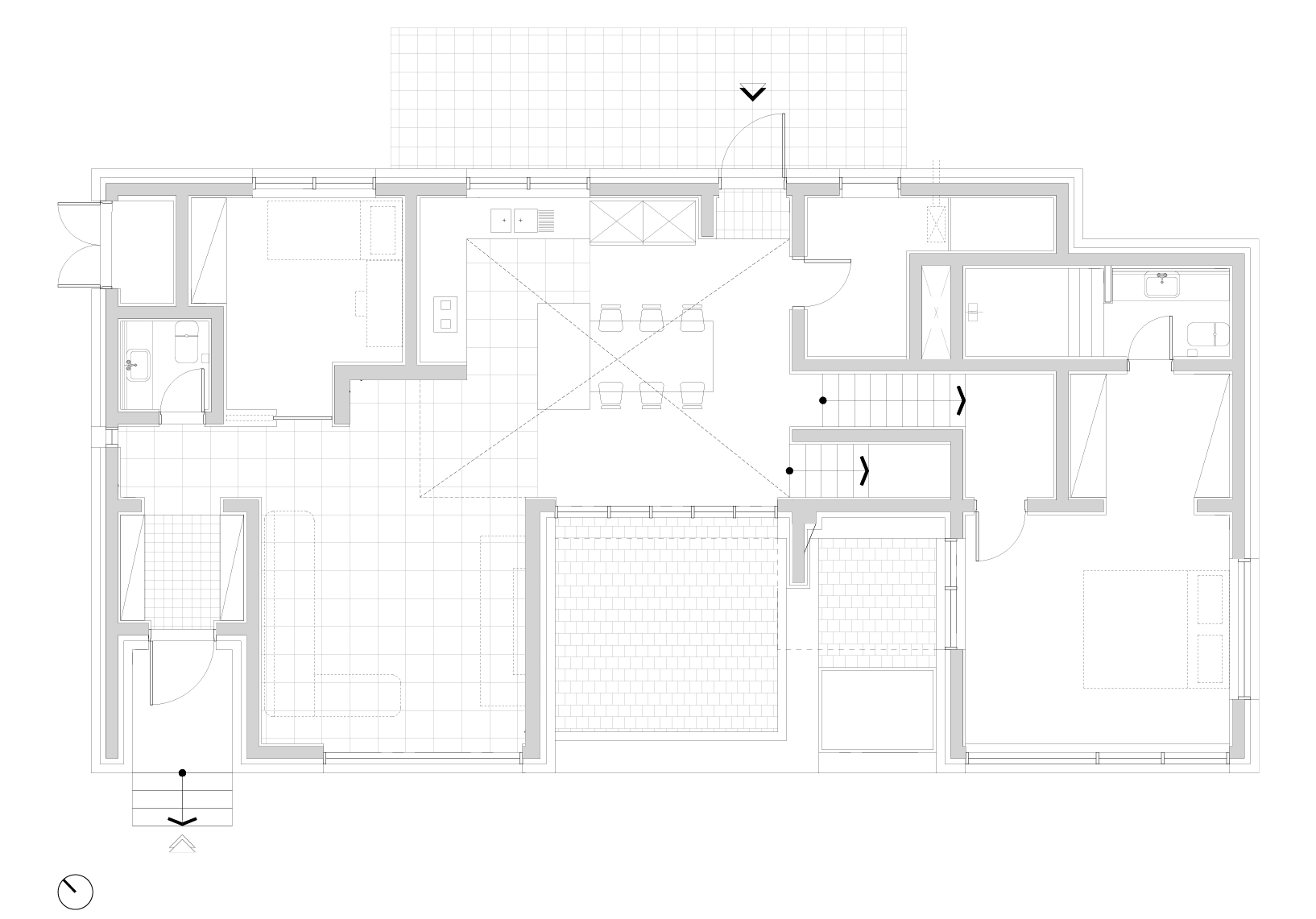 가사루 빌라는 대지의 경사를 반영하여 스킵플로어 형식으로 계획됐다. 중간 레벨에는 거실과 주방, 식당 같은 가족 공용 공간을 배치하고, 반 층의 위아래로 각각 가족 구성원의 개인 공간을 두었다.