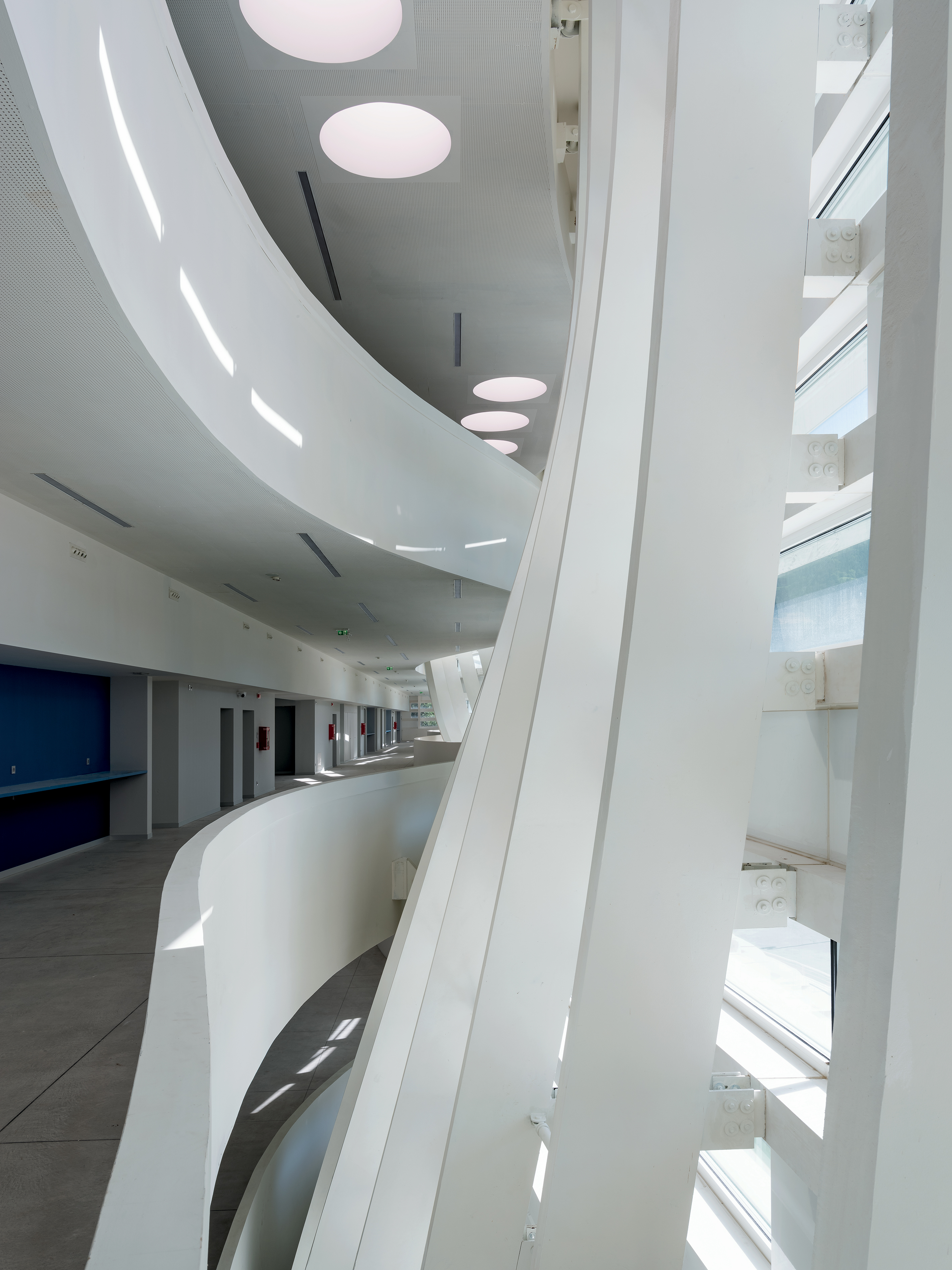 건물의 정체성과 외부 공간과의 상호작용을 결정짓는 가장 중요한 요소 중 하나는 입면 디자인이다. 도시를 향한 측면과 광장을 향한 측면의 입면 처리는 각각 다르게 설계되었다. 광장 측면에는 금속 스트립과 베타크릴 아크릴 스톤으로 구성된 프레임이 설치되어, 유리 및 불투명 부분을 지지하는 동시에 태양광 차단 기능을 한다. 철근 콘크리트 구조를 활용하여 내부에 기둥 없는 넓은 공간을 조성하였으며, 이를 통해 유연하게 강의실을 배치했다.