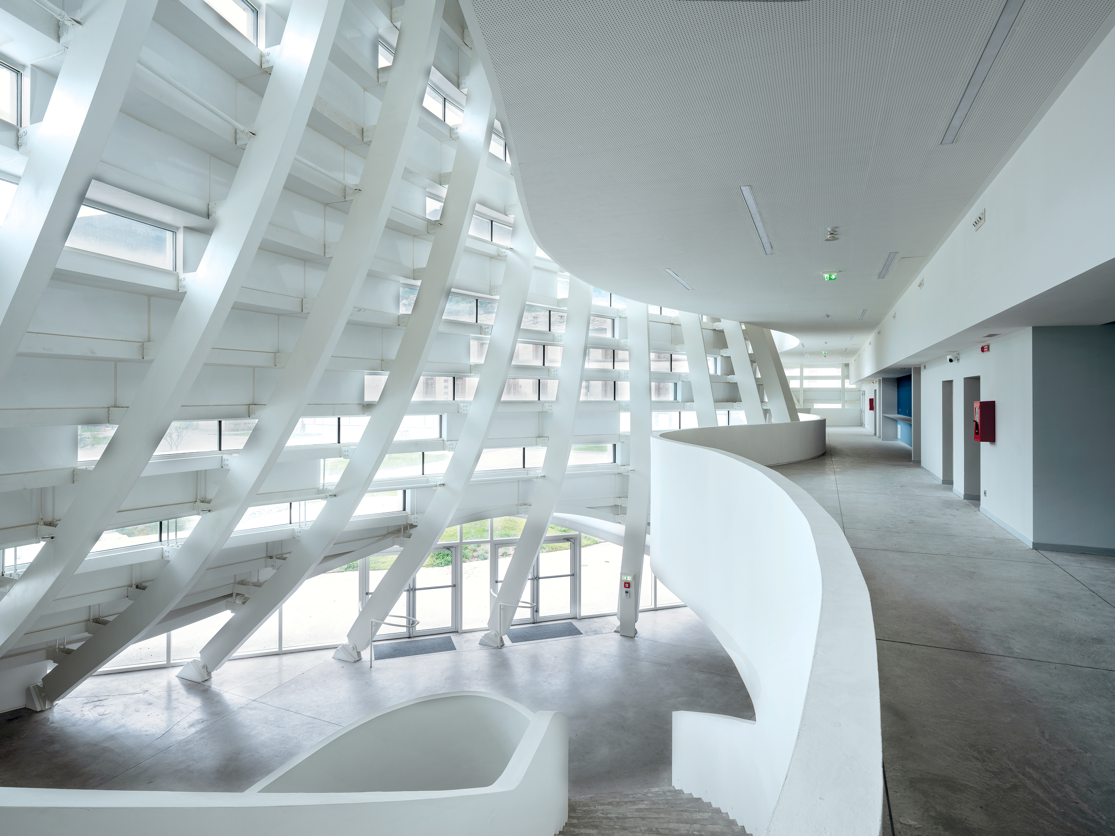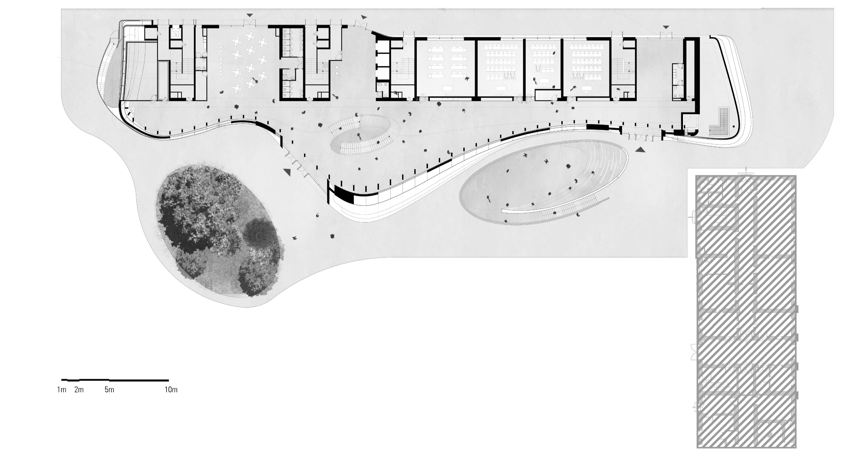 이 프로젝트는 지상 4층과 지하 2층으로 되어있다. 강의실이 배치된 외벽은 1층부터 점진적으로 개방도가 높아지며, 위치와 방향에 따라 빛의 유입과 조절이 최적화되었다. 반면, 대학 광장과 인접한 입면은 밀도를 높이고 변형을 가하여 건물의 일부가 도시 경관을 구성하는 요소로 기능하도록 했다. 1층에는 카페테리아와 대강당 입구가 배치되어 광장과 자연스럽게 연결되도록 설계되었다. 강의실은 모두 지상층에 위치하며, 창을 통해 도시 풍경을 조망할 수 있다. 지하층에는 설비 및 유지보수 공간이 배치되었으며, 일부 교육 공간도 포함되어 있다. 지하 1층에는 자연 채광과 환기를 확보한 두 개의 컴퓨터 실습실이 마련되었다. 지하 2층에는 최대 176명을 수용할 수 있는 대강당이 있다. 이전에는 폐쇄된 공간이었던 이 부지를 도시와 연결함으로써, 군사적·역사적 의미를 보존하는 동시에 새로운 공유 및 생활 공간으로 탈바꿈시켰다.