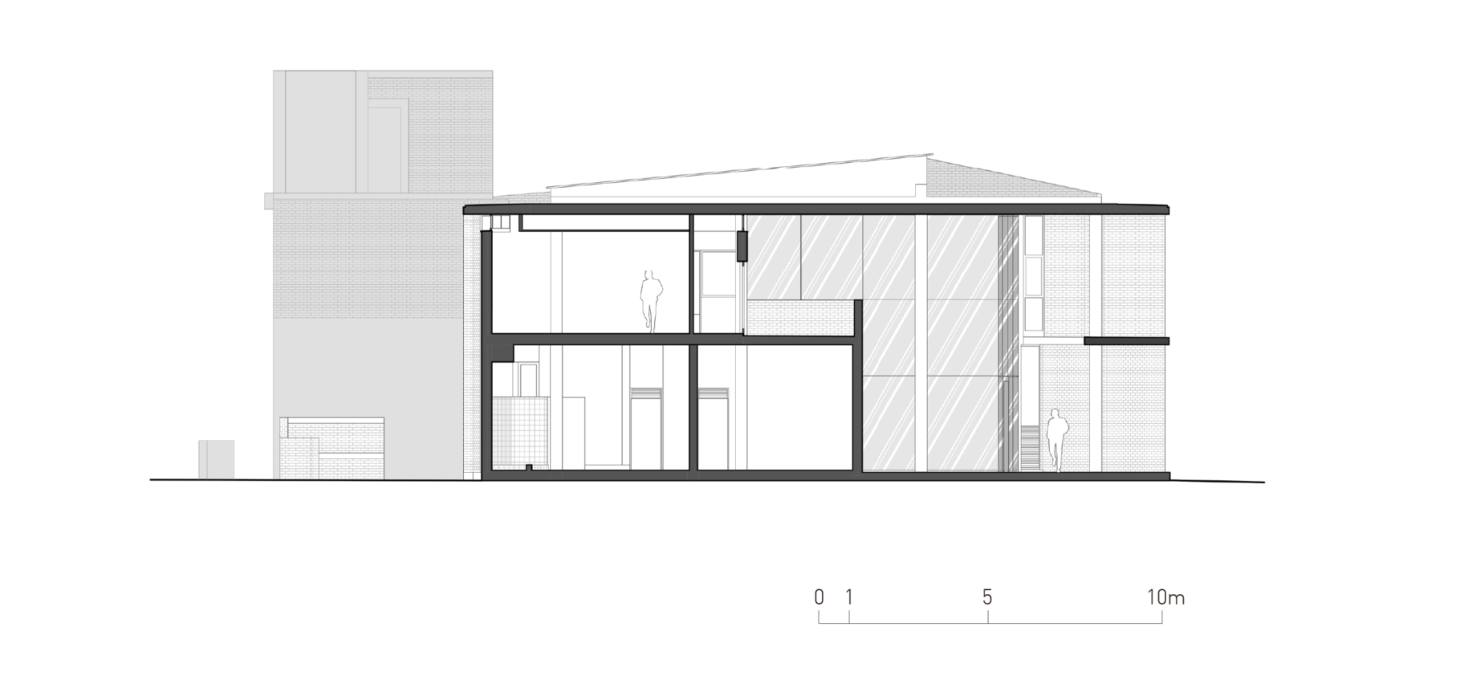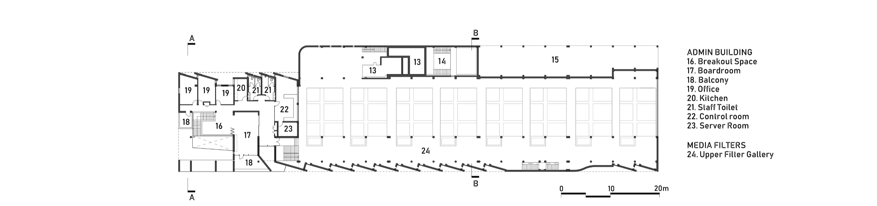 시설의 핵심인 관리동은 첫 번째 정수 건물과 통합된 형태로 설계되었으며, 외벽 패턴이 변화하는 디자인을 적용했다. 일부 벽돌 핀을 느슨하게 배열하여 차양 구조물을 형성하고, 이를 통해 빛과 공간을 조절하는 스크린 역할을 한다. 이는 단순한 기능적 공간을 넘어, 방문자들을 맞이하는 상징적 입구 역할을 수행한다. 건물 내부는 효율성과 편안함을 고려하여 설계되었으며, 1층에는 실용적인 공간, 2층에는 사무실, 회의실, 중앙 제어실이 배치되었다. 이 공간들은 운영자들이 원활하게 작업할 수 있도록 최적화되었다.