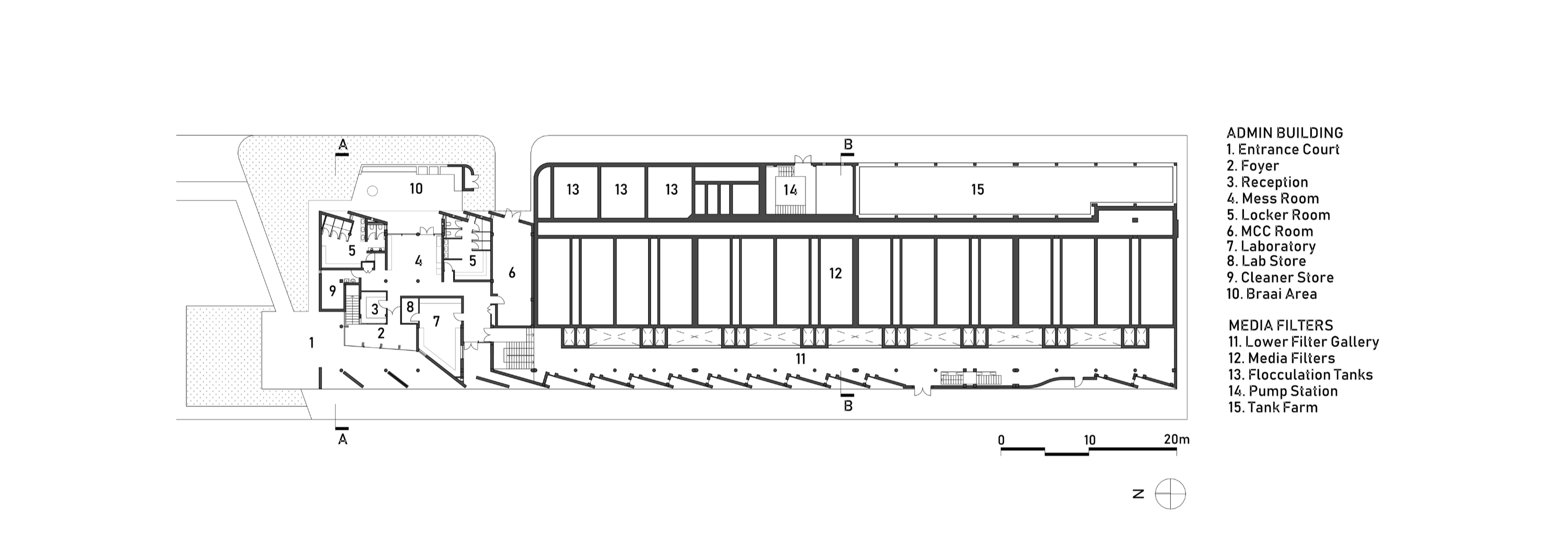 시설의 핵심인 관리동은 첫 번째 정수 건물과 통합된 형태로 설계되었으며, 외벽 패턴이 변화하는 디자인을 적용했다. 일부 벽돌 핀을 느슨하게 배열하여 차양 구조물을 형성하고, 이를 통해 빛과 공간을 조절하는 스크린 역할을 한다. 이는 단순한 기능적 공간을 넘어, 방문자들을 맞이하는 상징적 입구 역할을 수행한다. 건물 내부는 효율성과 편안함을 고려하여 설계되었으며, 1층에는 실용적인 공간, 2층에는 사무실, 회의실, 중앙 제어실이 배치되었다. 이 공간들은 운영자들이 원활하게 작업할 수 있도록 최적화되었다.