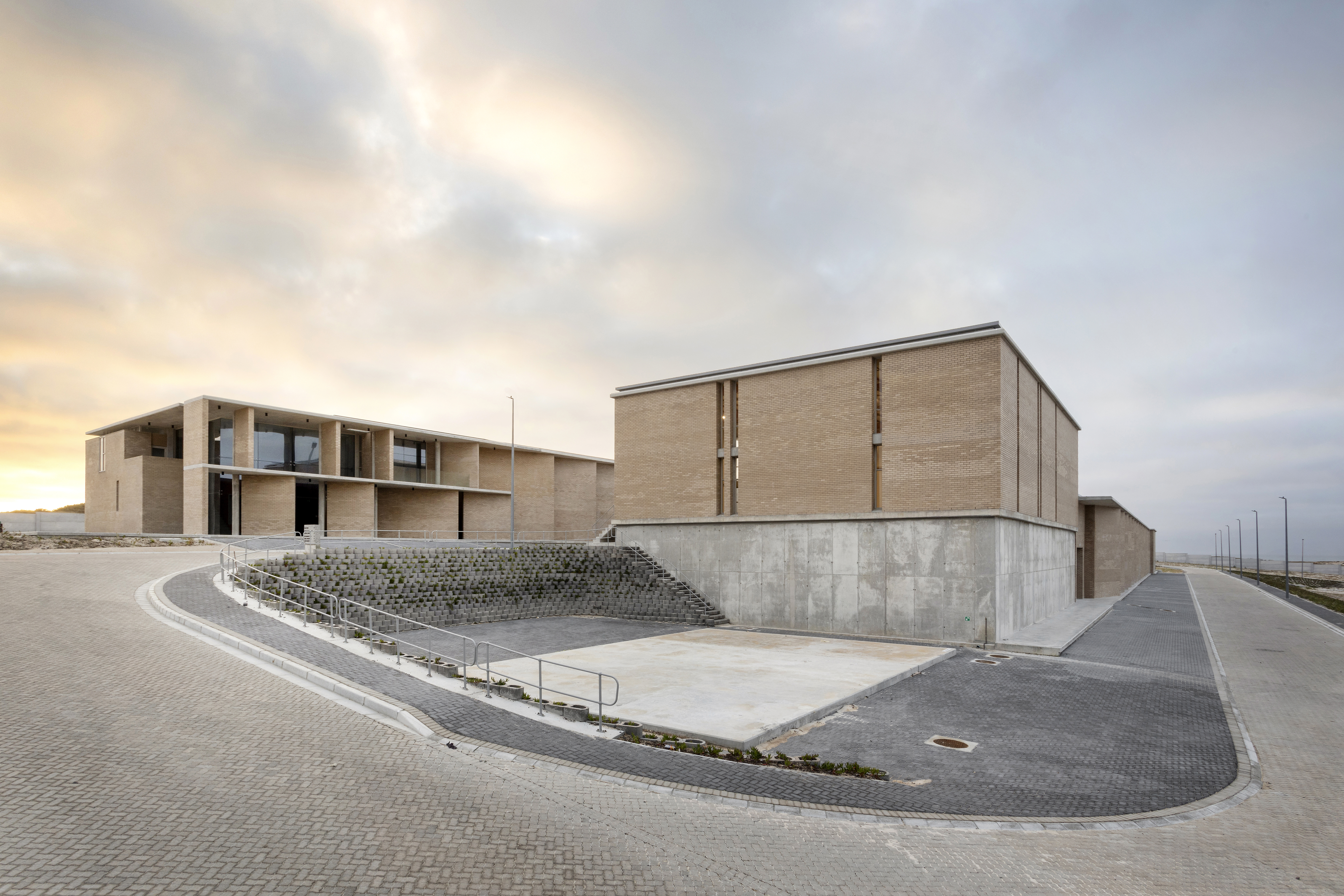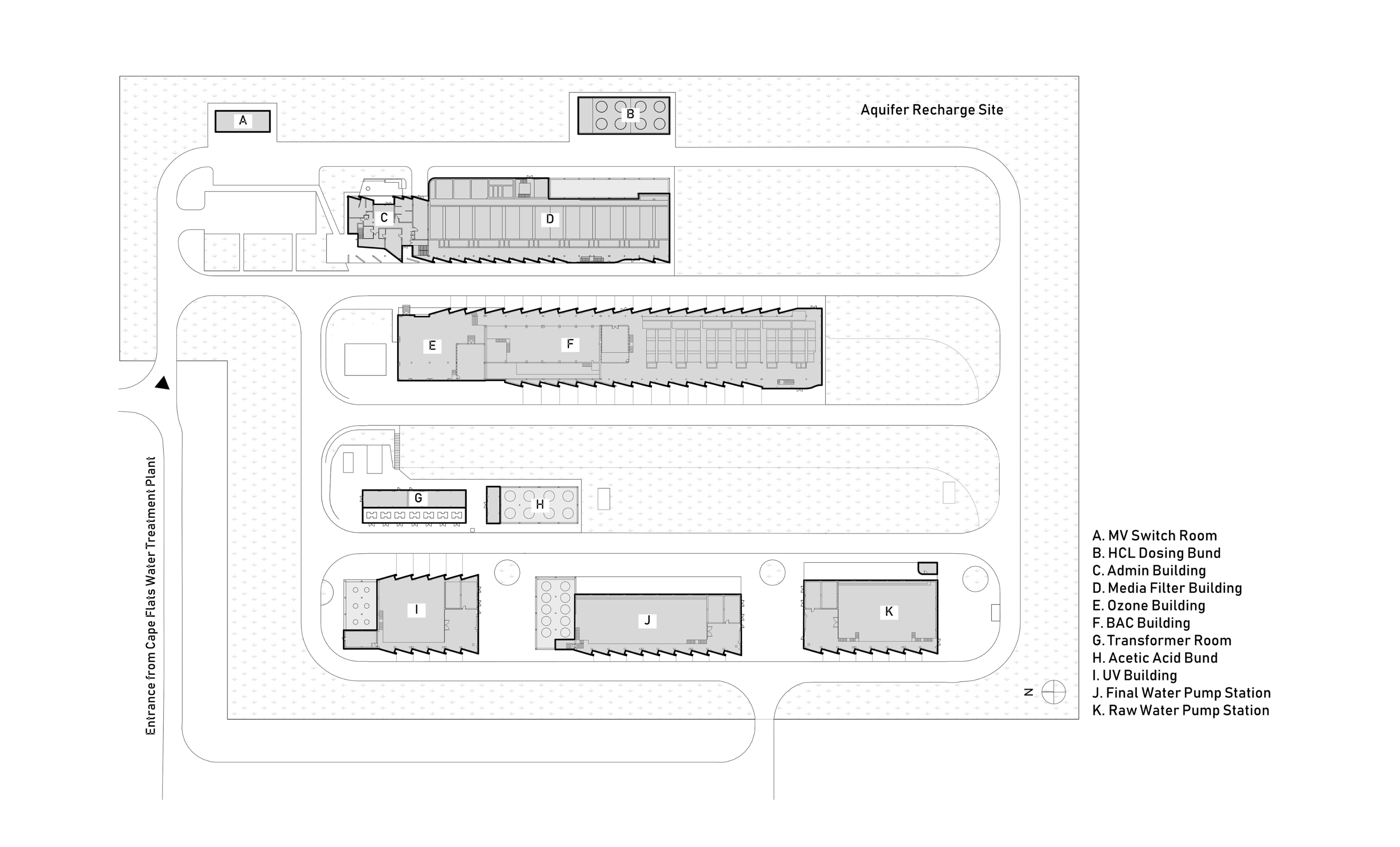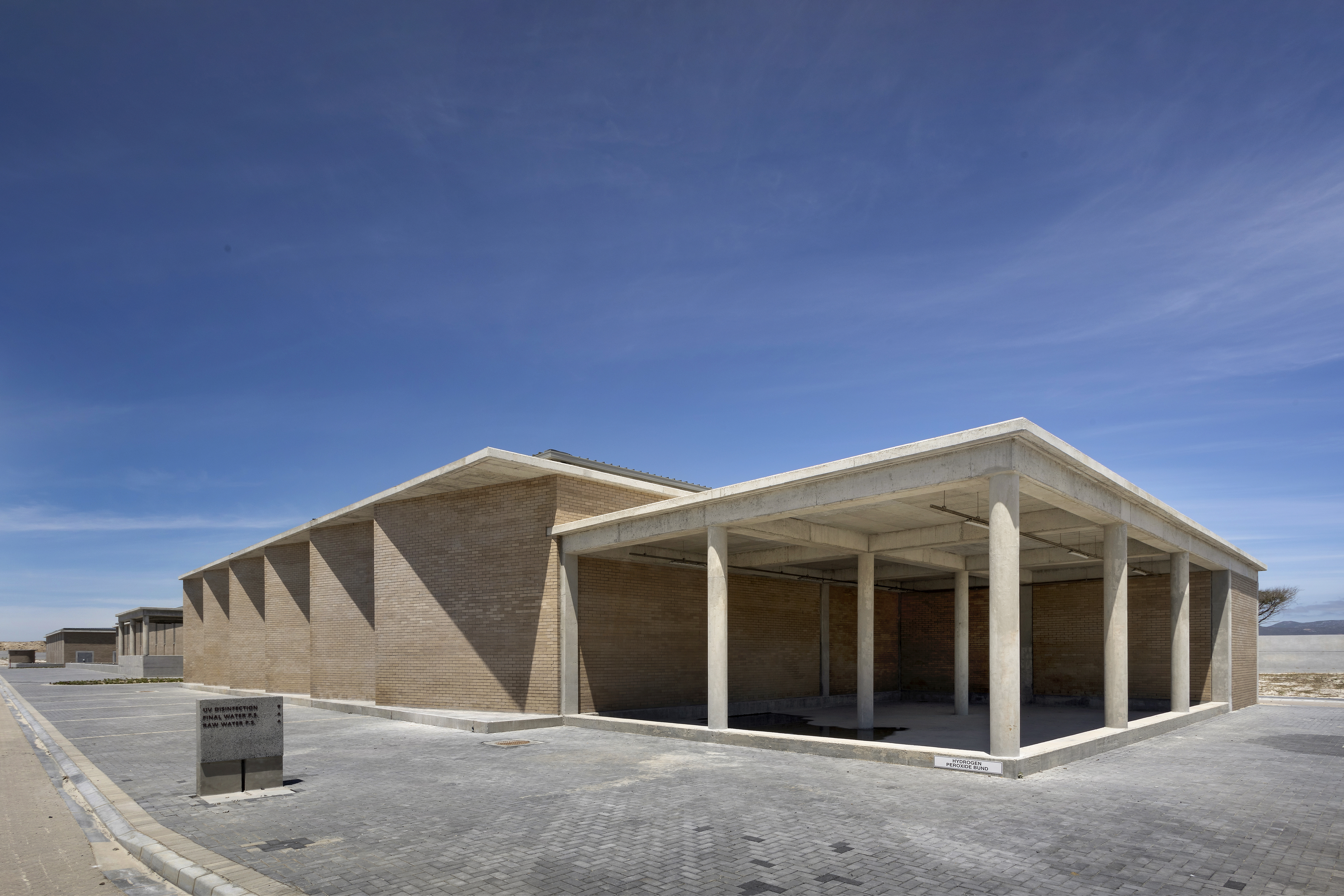 케이프 플랫츠 대수층 관리형 함양(MAR) 시설은 케이프타운의 물 위기에 대응하기 위한 선구적인 해결책으로, 도시의 미래 수자원을 보호하는 방안을 제시한다. 이 시설은 펠리칸 공원의 폴스 베이 자연 보호구역에 위치하며, 처리된 방류수를 식수 수준으로 정화한 후 케이프 플랫츠 대수층에 재주입하는 방식으로 운영된다. 이곳은 평탄한 모래 지형으로, 모래 언덕에 둘러싸여 있으며 강한 남동풍과 부식성이 높은 해안 환경의 영향을 받는다. 이러한 환경적 조건은 시설 설계에 중요한 요소로 작용한다. 이 프로젝트의 핵심은 케이프 플랫츠 대수층을 보존하고 보충하는 과정이다. 처리된 방류수를 정화하여 대수층에 재주입함으로써 수위를 안정적으로 유지한다. 이 과정은 4개의 직선형 정수 건물을 통해 이루어지며, 건물들은 인공 경사면을 따라 배치되어 중력의 흐름을 이용한 자연적인 정수 시스템을 형성한다. 가장 높은 곳에 있는 정수 건물에서 정화가 시작되며, 물은 차례로 낮은 곳으로 흘러가면서 정화 과정을 거친다. 마지막 정수 건물에서는 최종적으로 깨끗해진 물이 대수층으로 되돌아간다. 각 정수 건물의 동서 방향 정면은 각진 벽돌 핀과 남향의 좁은 창문으로 구성되어 있어 빛을 효과적으로 걸러내고 조류 발생을 방지하는 역할을 한다. 이 외벽은 단순한 필터 역할을 넘어, 정수 과정을 건축적 상징 요소로 승화시키는 디자인적 특징을 갖는다.