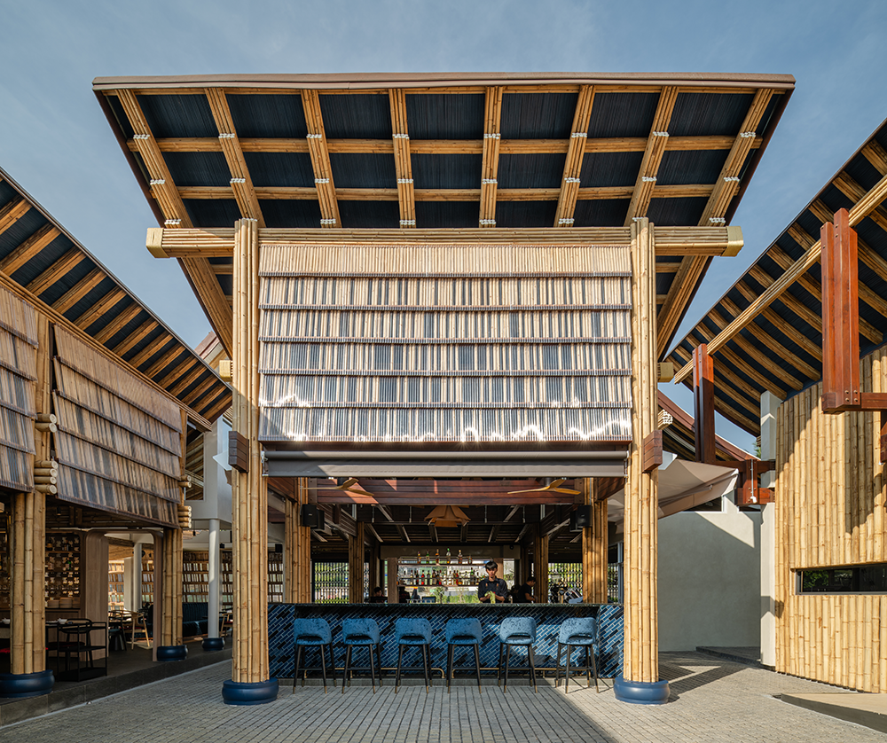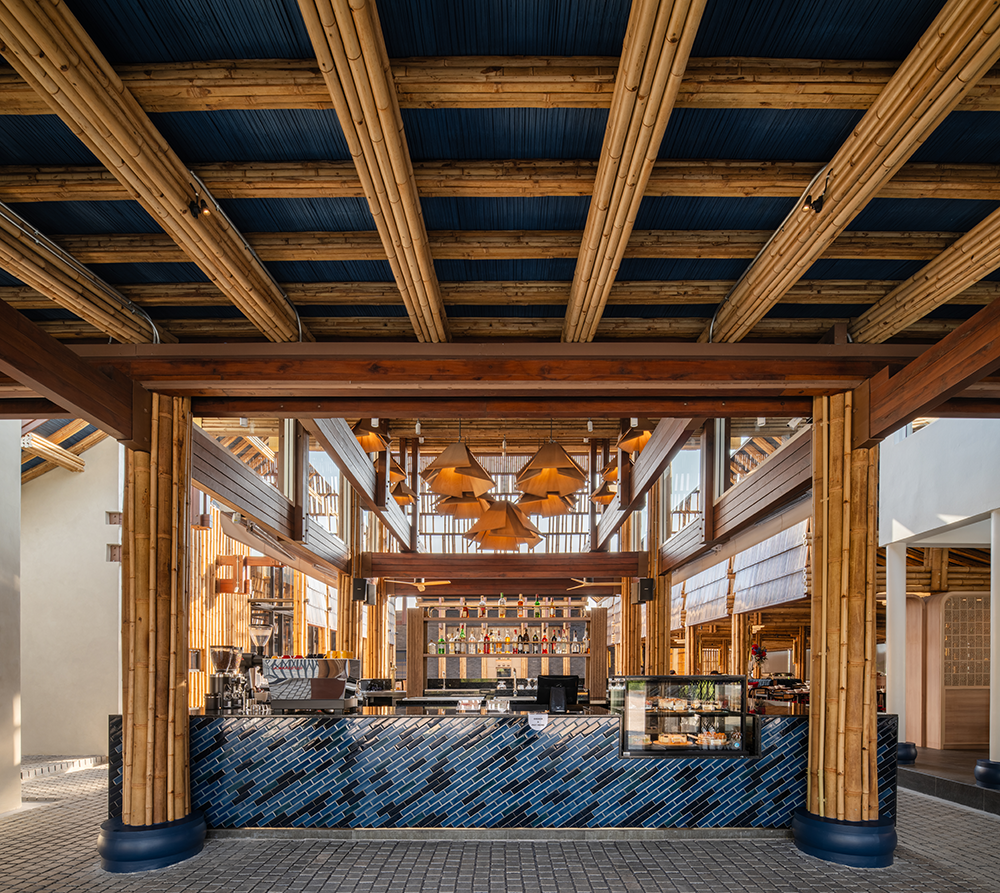 디자이너는 대나무의 독창성을 강조하기 위해 특별한 염색 기법을 개발하고, 푸른색으로 염색된 대나무를 공간의 핵심 요소로 활용했다. 카페 공간의 천장에도 적용된 푸른 대나무는 자연 그대로의 대나무와 교차 배치되어 물고기 비늘 패턴을 만들고, 커피 바 뒤편에는 ‘SM’ 로고가 새겨진 천공 벽을 디자인하여 독창적인 포인트를 더했다. 바 카운터 역시 푸른색의 대각선 타일로 마감하여 물고기 비늘 모티프를 한층 강조했다. 디자이너는 이 공간이 고객들이 편안한 분위기 속에서 식사와 공간을 온전히 즐길 수 있는 장소가 되도록 디자인했으며, 동시에 브랜드의 정체성을 명확하게 드러낼 수 있도록 했다.