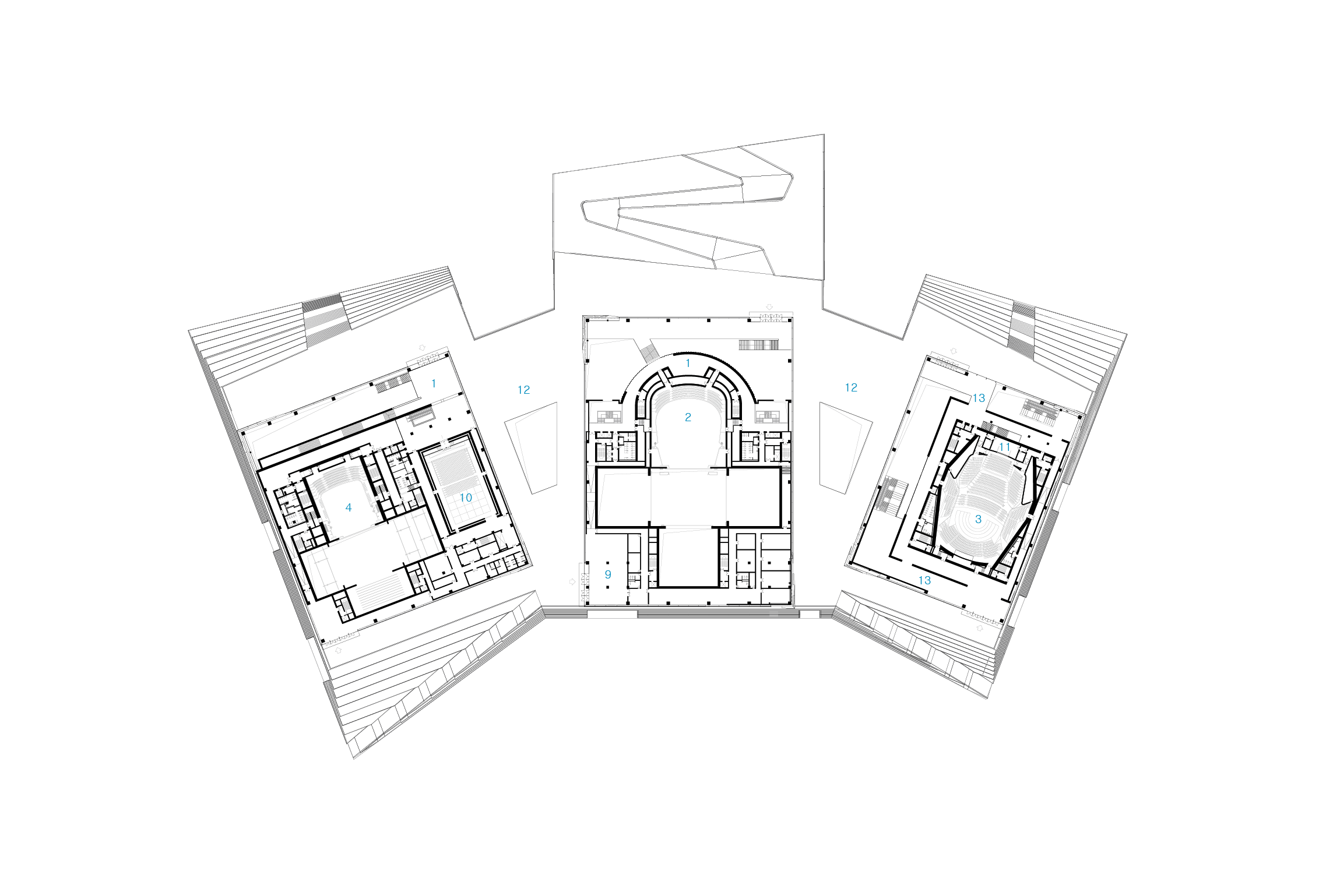 세 개의 매스는 하나의 플랫폼 위에 놓여있으며, 세 개의 건축물은 하나의 복합단지로 통합된다. 시민들은 모든 방향에서 접근할 수 있으며, 플랫폼은 시민들을 위한 공원이 되고 주변의 호수나 숲으로 확장되어 주변 환경과의 관계를 형성한다.