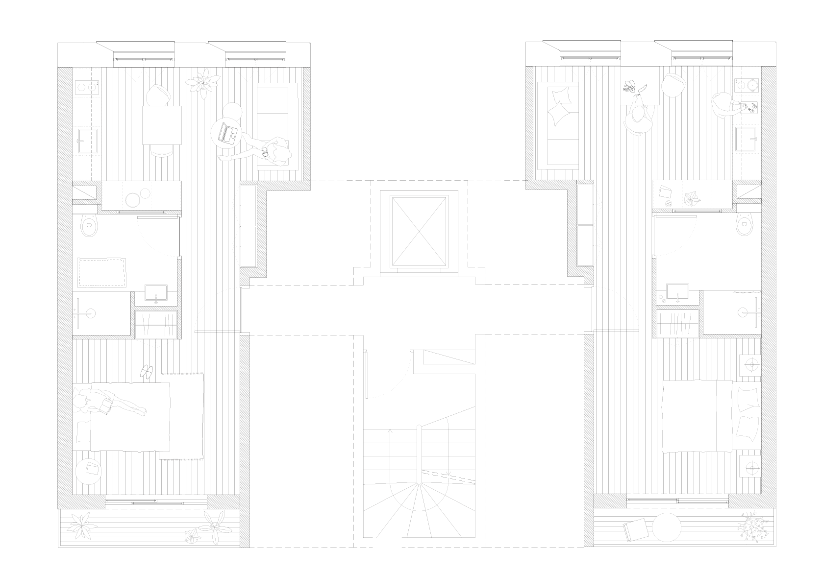 17 루에 데스 콰트레-케미네에스 레지던스는 지상층의 두 개의 출입구를 통해 상업 공간과 주거 공간이 각각 독립적으로 형성된 건축물이다. 대지의 후면은 조경을 통해 연결성을 유지했으며, 정원을 마주한 계단은 풍부한 자연광을 확보할 수 있도록 설계됐다. 도로변을 향한 창문은 남서향으로 빛을 최대한 받을 수 있도록 사선으로 설계됐으며, 침실은 남동향으로 배치되어 있어 햇볕이 잘 드는 발코니와 연결된다. 이중 향을 고려한 디자인 덕분에 각 유닛에서는 풍부한 일광과 자연 환기를 확보할 수 있다.
