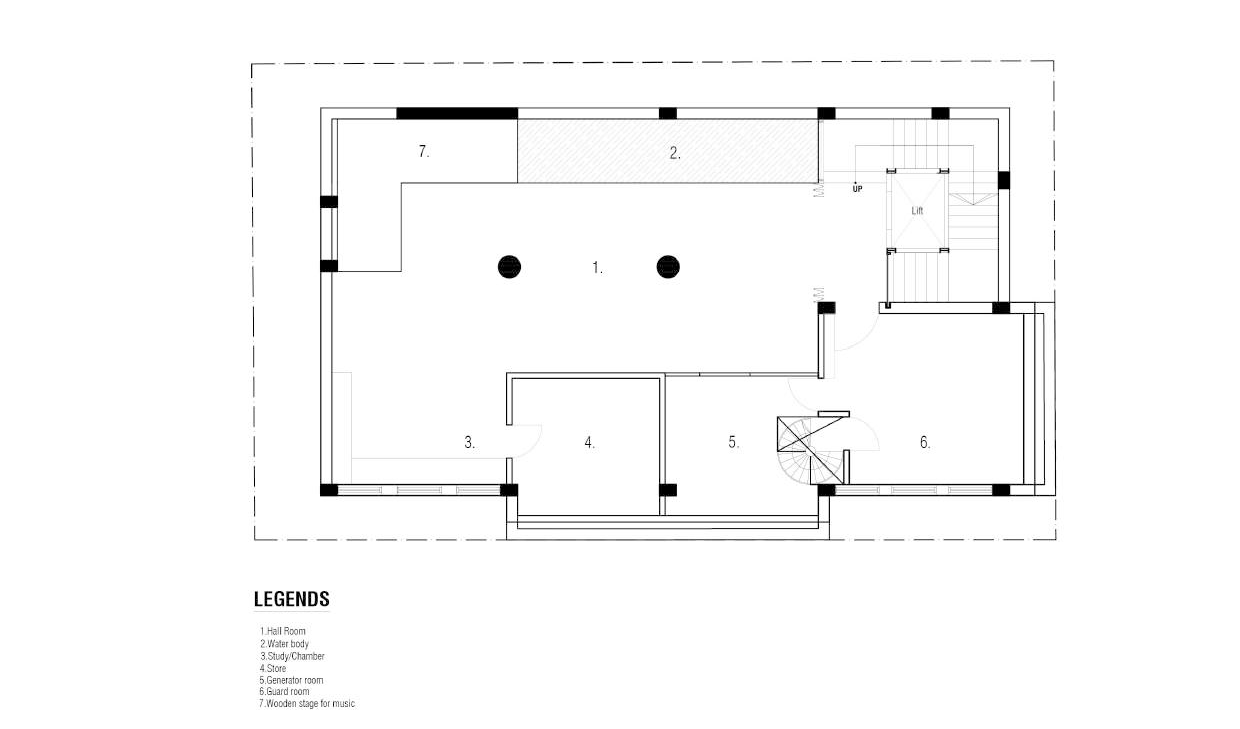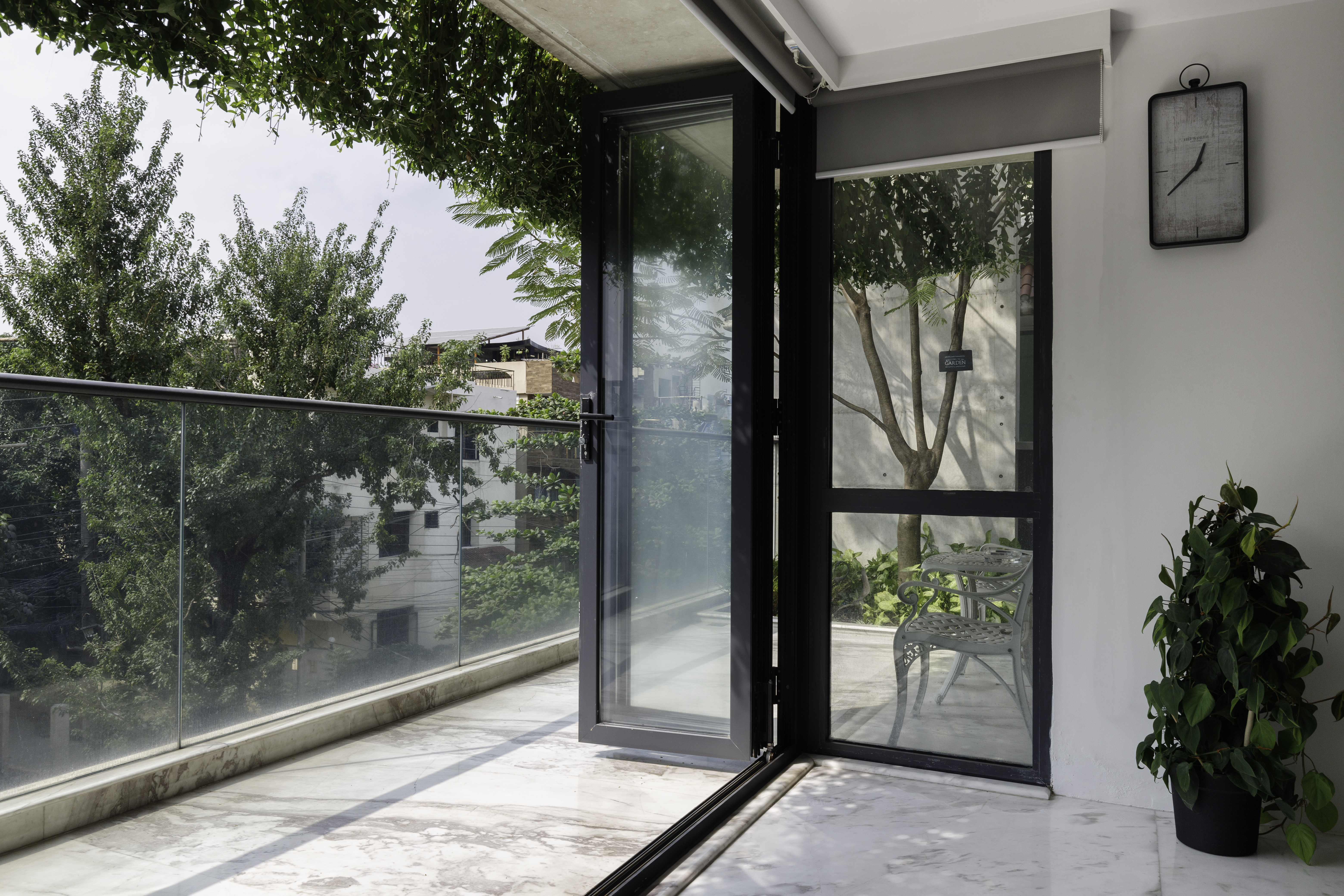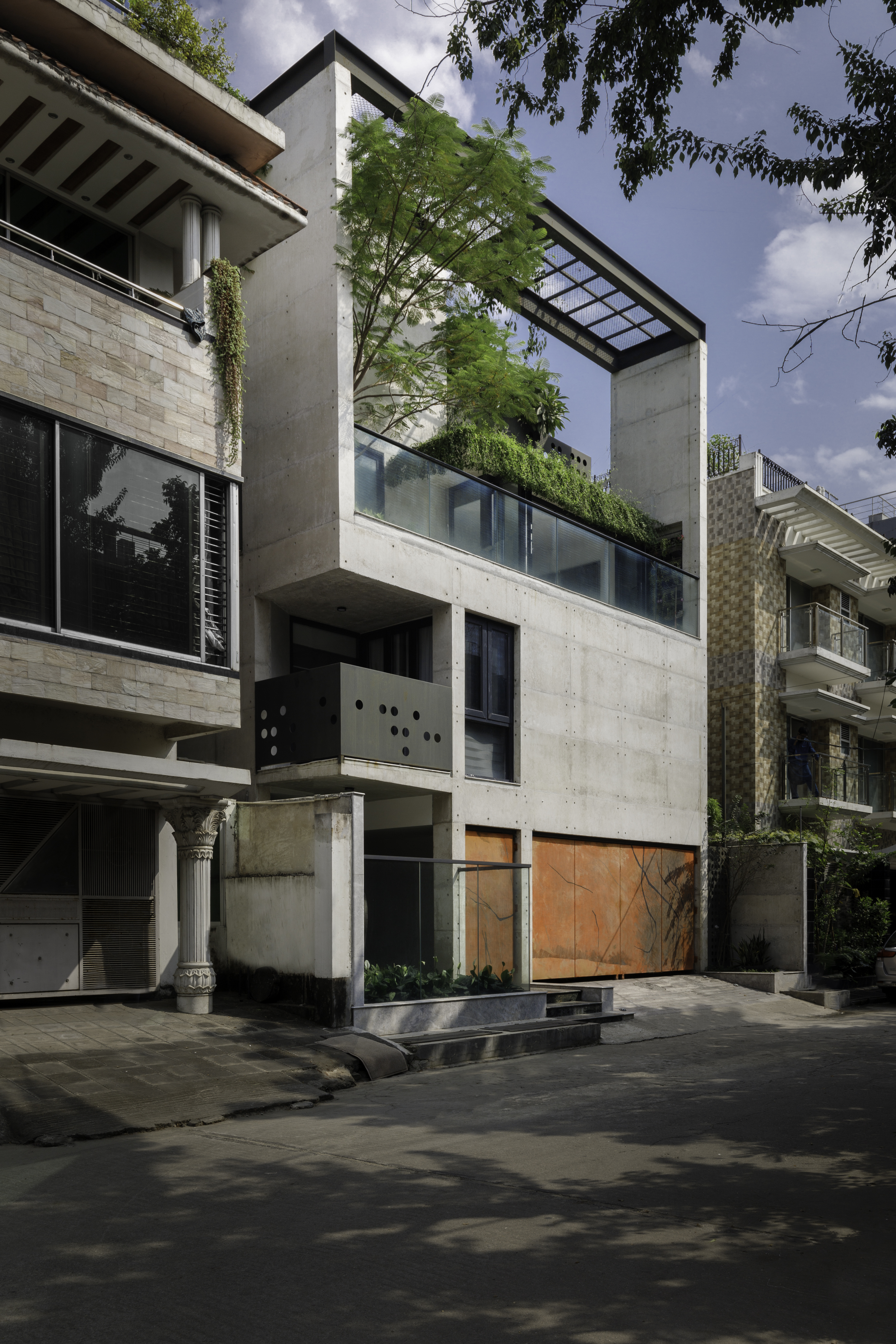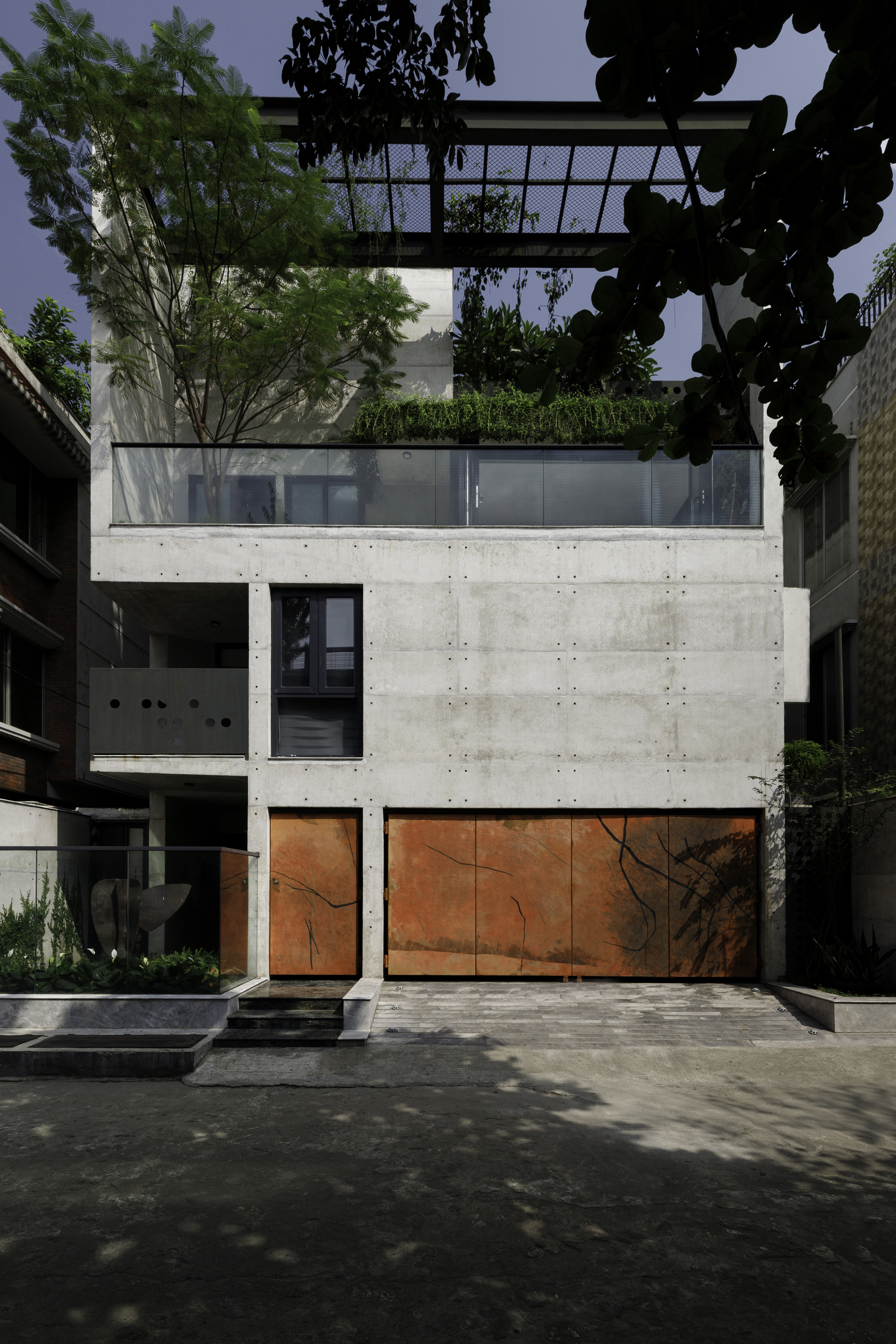 1층은 주차 공간이지만, 초록 정원과 수공간, 풍부한 자연 채광이 어우러진 로비가 함께 조성되어 있다. 로비 벽면에는 엄선된 예술 작품들이 전시되어 집의 첫인상부터 감성적이고 예술적인 분위기를 자아낸다. 전통적인 공간 배치에서 벗어나, 응접실과 같은 포멀한 공간은 상층에 배치되었으며, 이들은 하늘로 열린 테라스와 연결된다. 서쪽 햇살을 받으며 무성하게 자란 식물들은 생동감 있게 뻗어 나가며, 공간 자체를 삶의 방식에 대한 새로운 제안으로 승화시킨다. 3층에는 여름을 상징하는 붉은 꽃을 피우는 나무가 심어져 있다. 자연의 생동감과 계절의 아름다움을 시각적으로 체험하게 하며, 이 집에 열정과 활기를 더해준다.