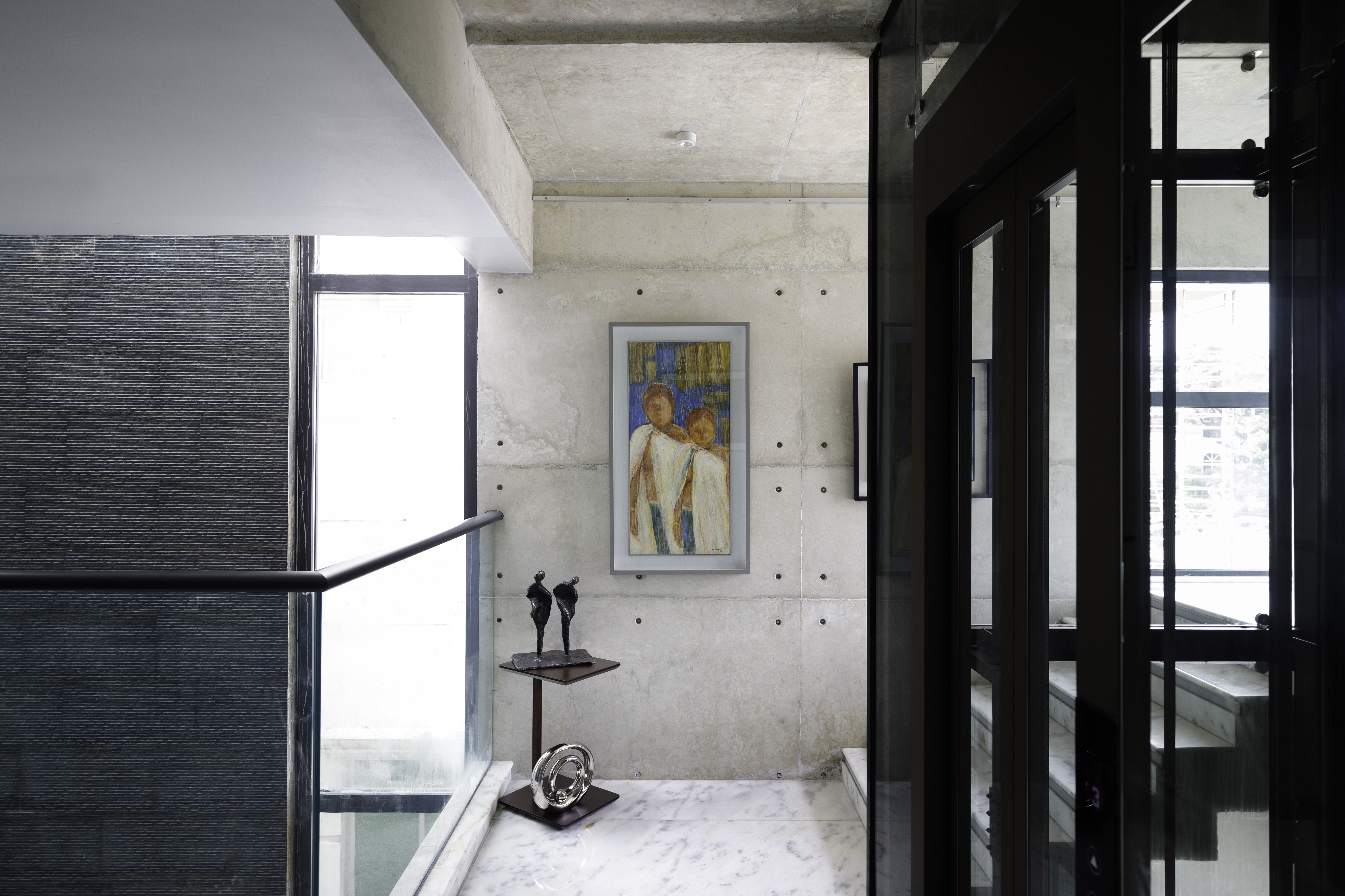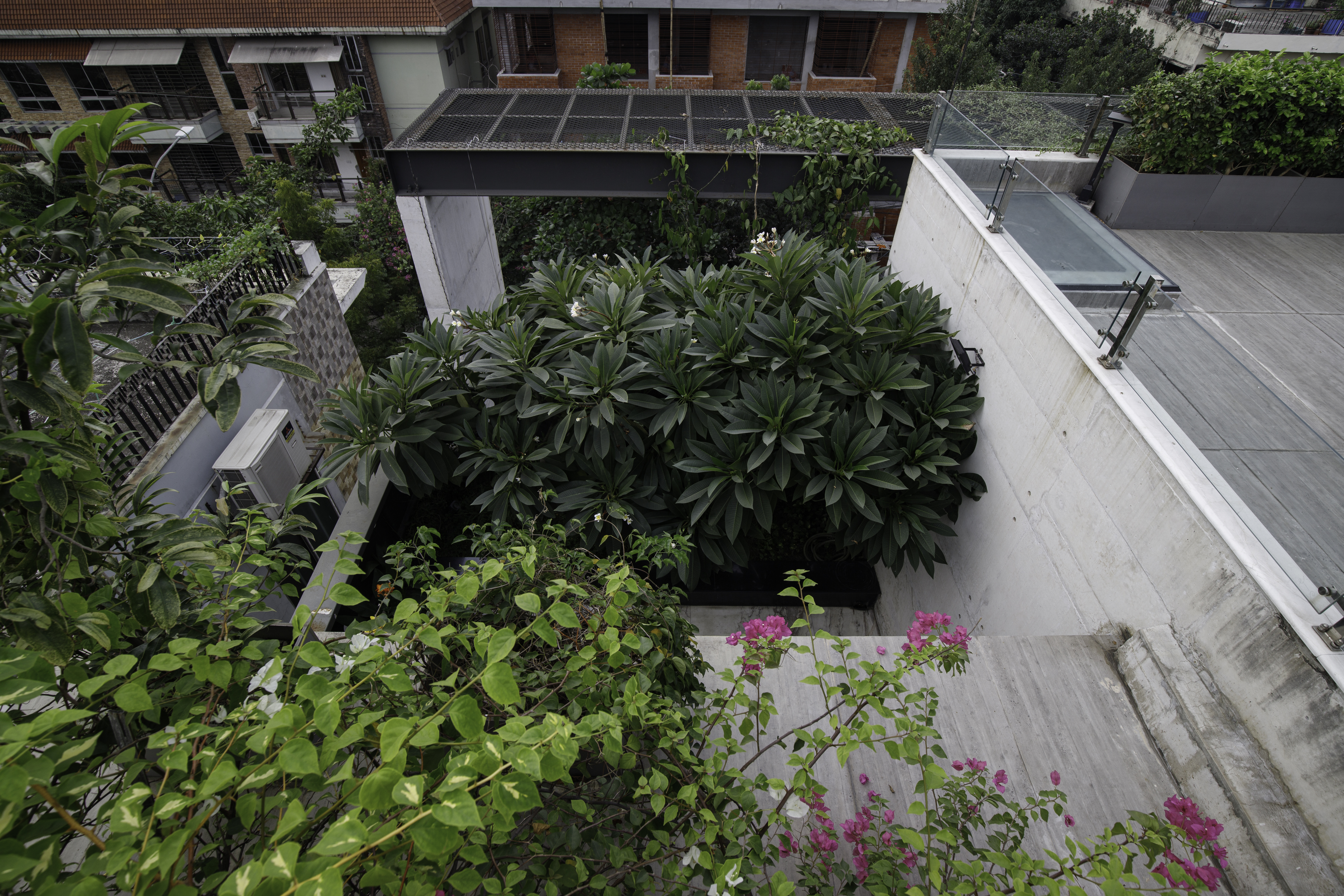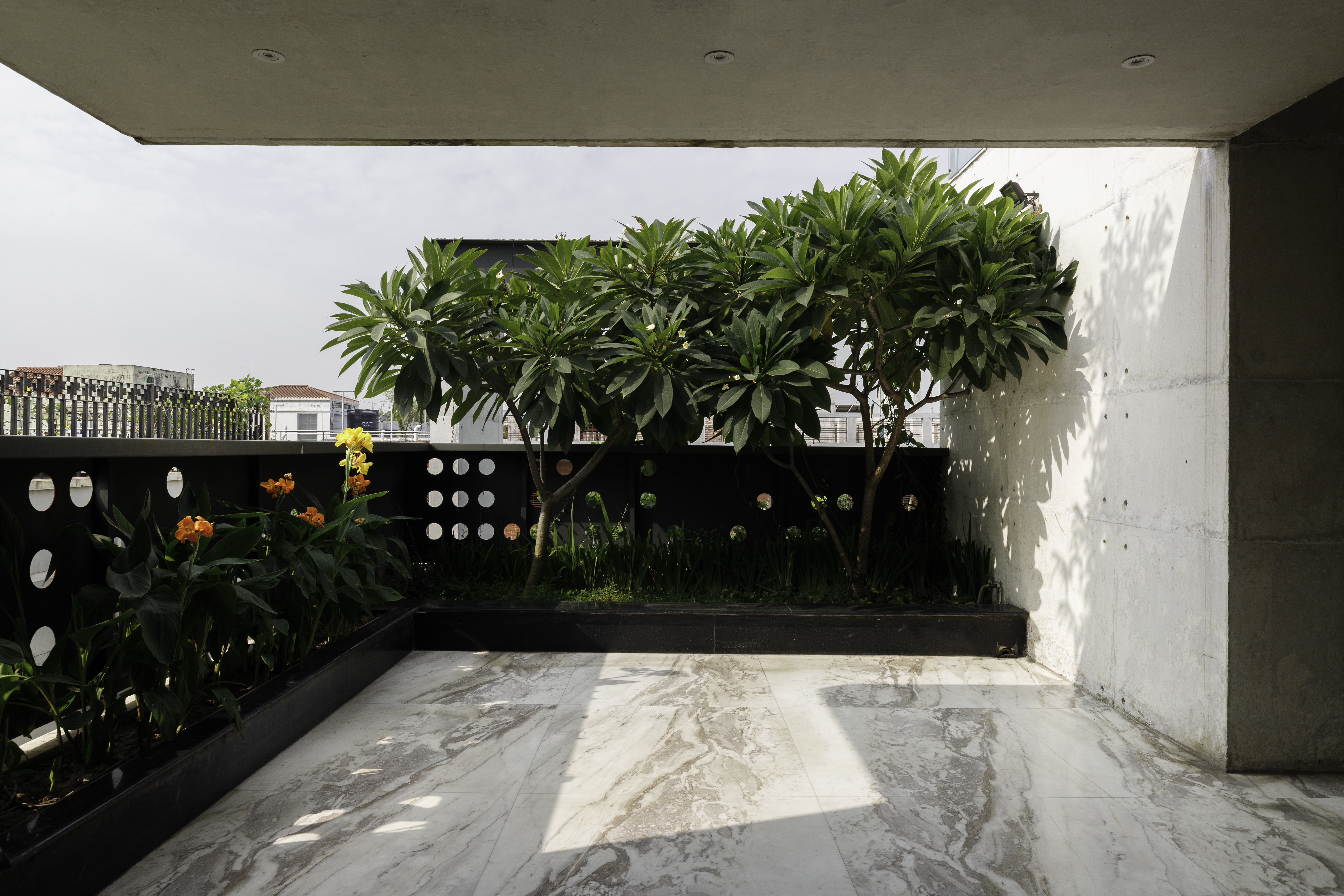 1층은 주차 공간이지만, 초록 정원과 수공간, 풍부한 자연 채광이 어우러진 로비가 함께 조성되어 있다. 로비 벽면에는 엄선된 예술 작품들이 전시되어 집의 첫인상부터 감성적이고 예술적인 분위기를 자아낸다. 전통적인 공간 배치에서 벗어나, 응접실과 같은 포멀한 공간은 상층에 배치되었으며, 이들은 하늘로 열린 테라스와 연결된다. 서쪽 햇살을 받으며 무성하게 자란 식물들은 생동감 있게 뻗어 나가며, 공간 자체를 삶의 방식에 대한 새로운 제안으로 승화시킨다. 3층에는 여름을 상징하는 붉은 꽃을 피우는 나무가 심어져 있다. 자연의 생동감과 계절의 아름다움을 시각적으로 체험하게 하며, 이 집에 열정과 활기를 더해준다.