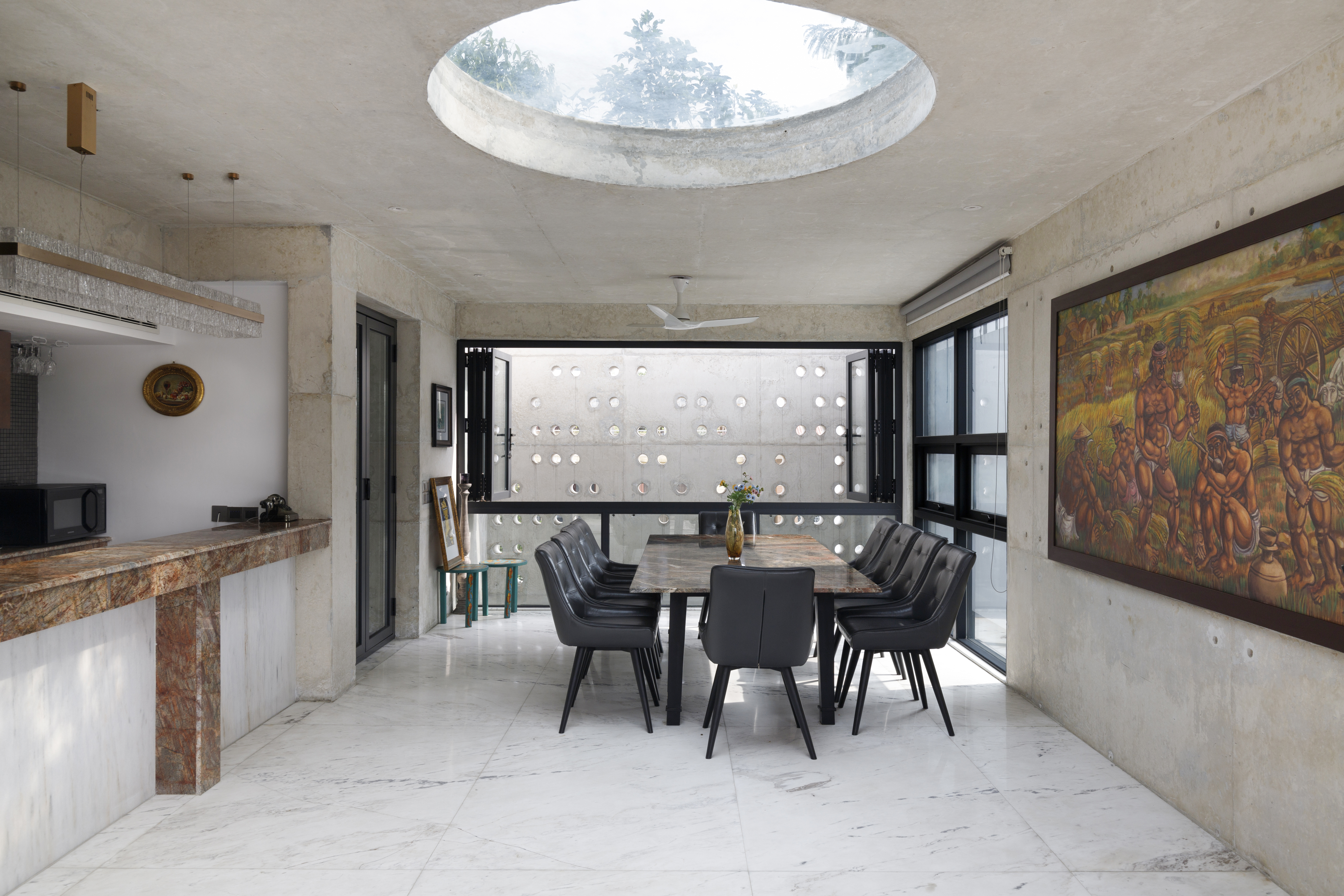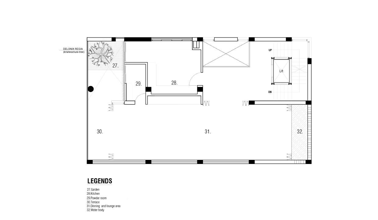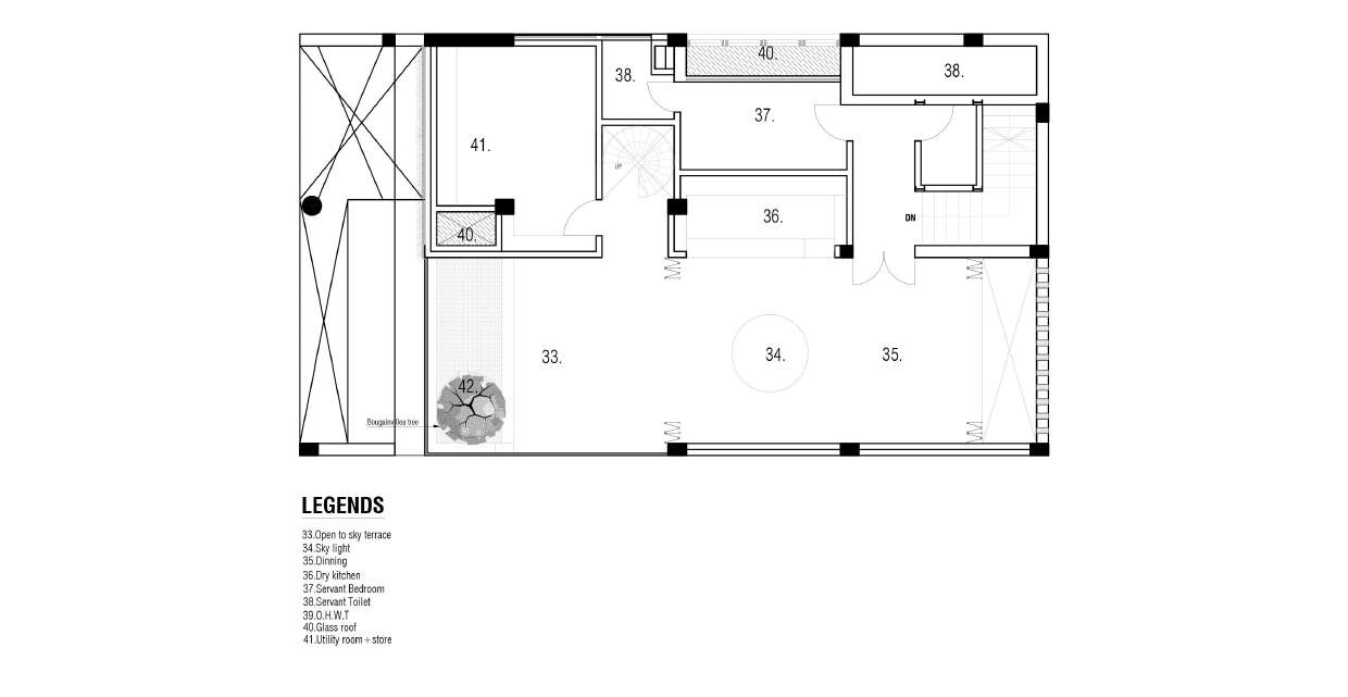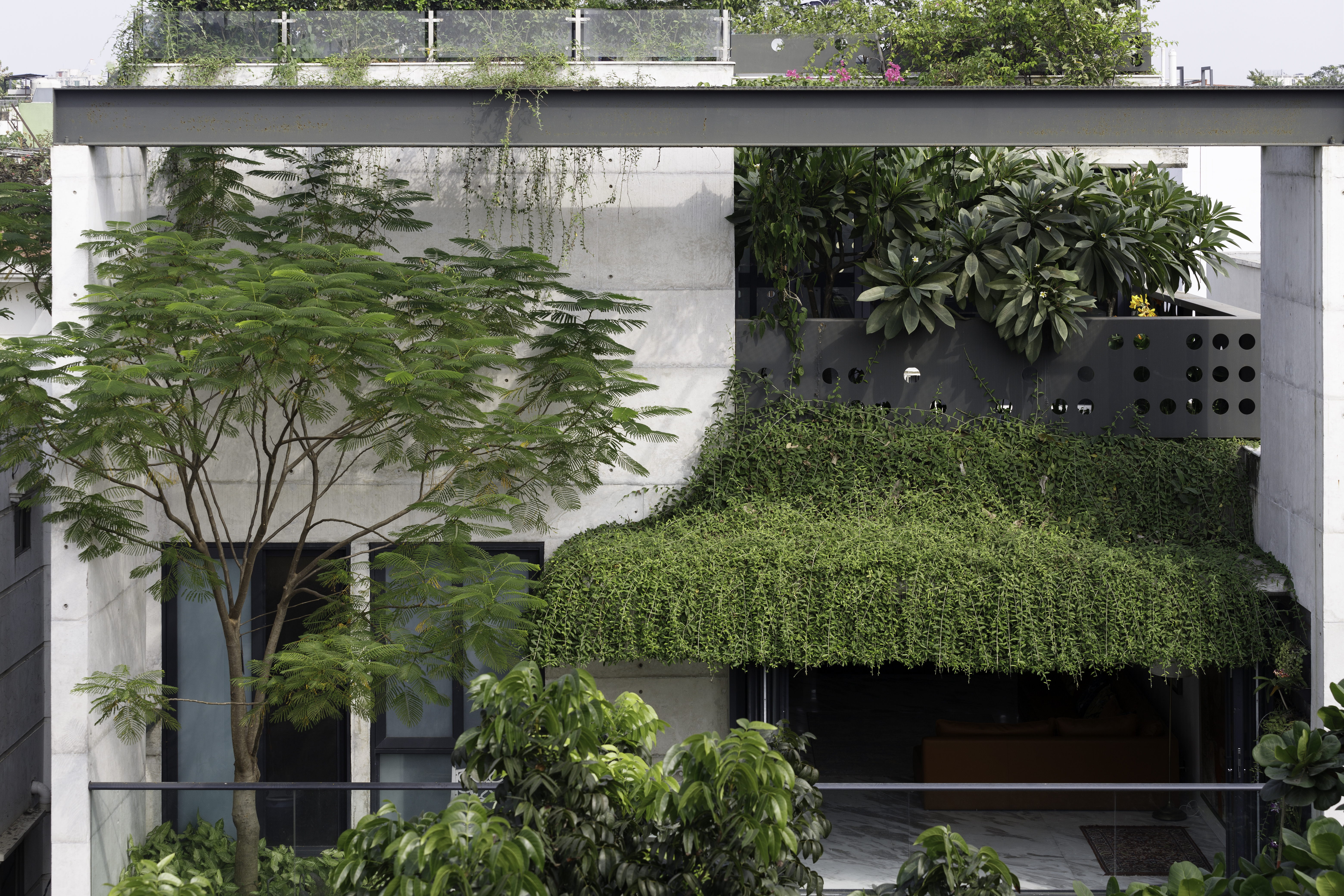 1층은 주차 공간이지만, 초록 정원과 수공간, 풍부한 자연 채광이 어우러진 로비가 함께 조성되어 있다. 로비 벽면에는 엄선된 예술 작품들이 전시되어 집의 첫인상부터 감성적이고 예술적인 분위기를 자아낸다. 전통적인 공간 배치에서 벗어나, 응접실과 같은 포멀한 공간은 상층에 배치되었으며, 이들은 하늘로 열린 테라스와 연결된다. 서쪽 햇살을 받으며 무성하게 자란 식물들은 생동감 있게 뻗어 나가며, 공간 자체를 삶의 방식에 대한 새로운 제안으로 승화시킨다. 3층에는 여름을 상징하는 붉은 꽃을 피우는 나무가 심어져 있다. 자연의 생동감과 계절의 아름다움을 시각적으로 체험하게 하며, 이 집에 열정과 활기를 더해준다.