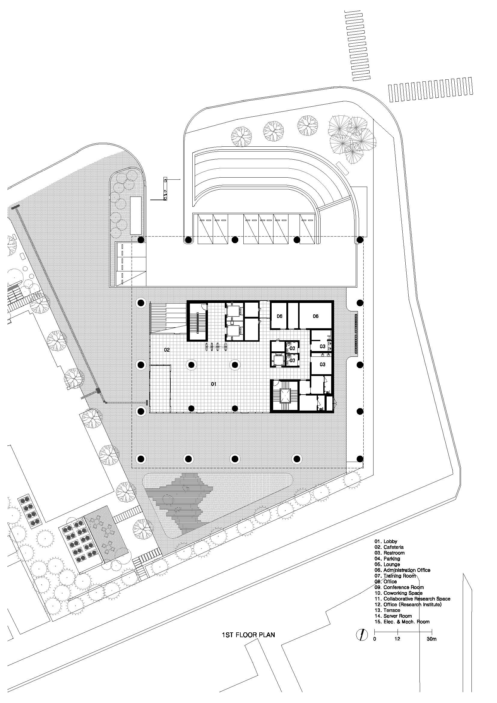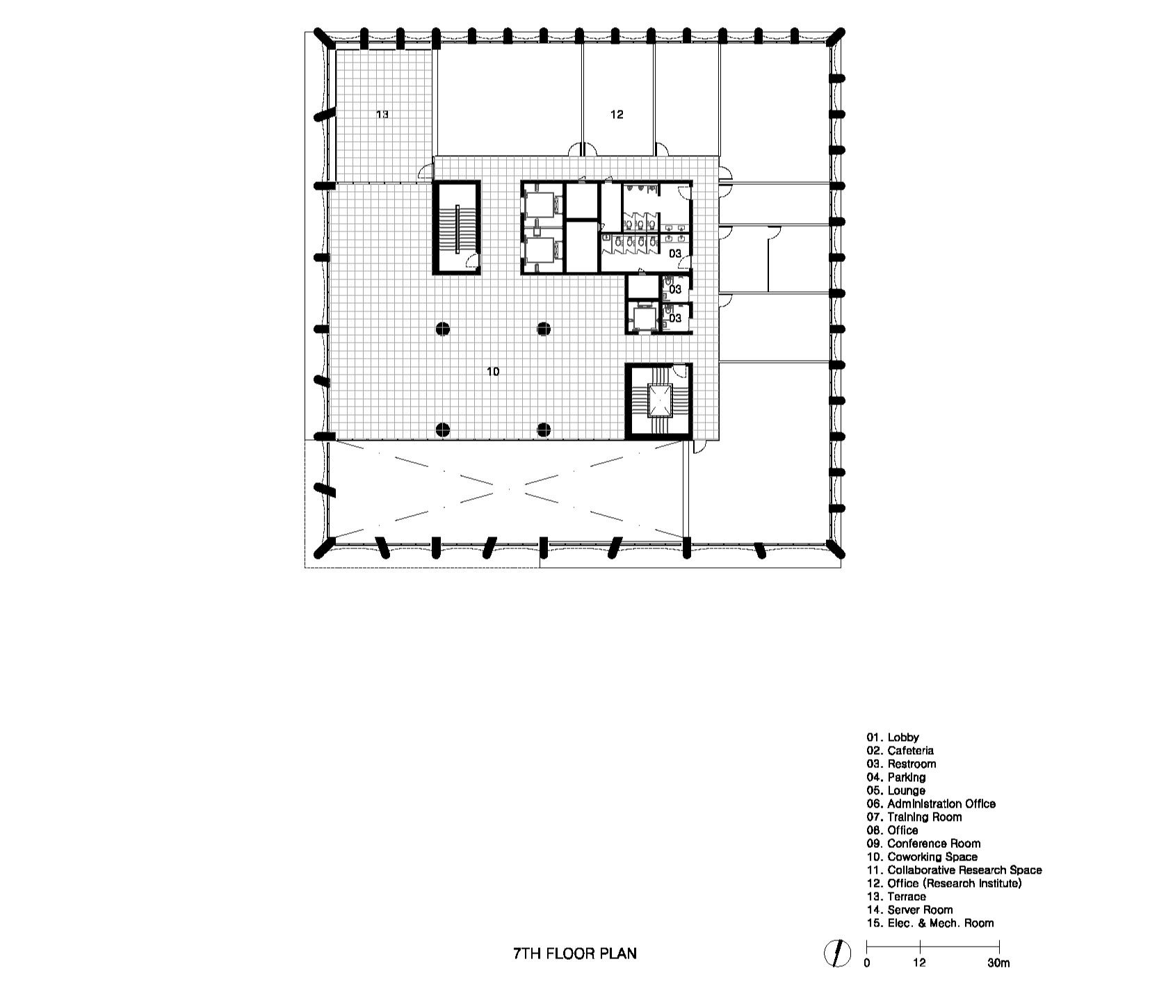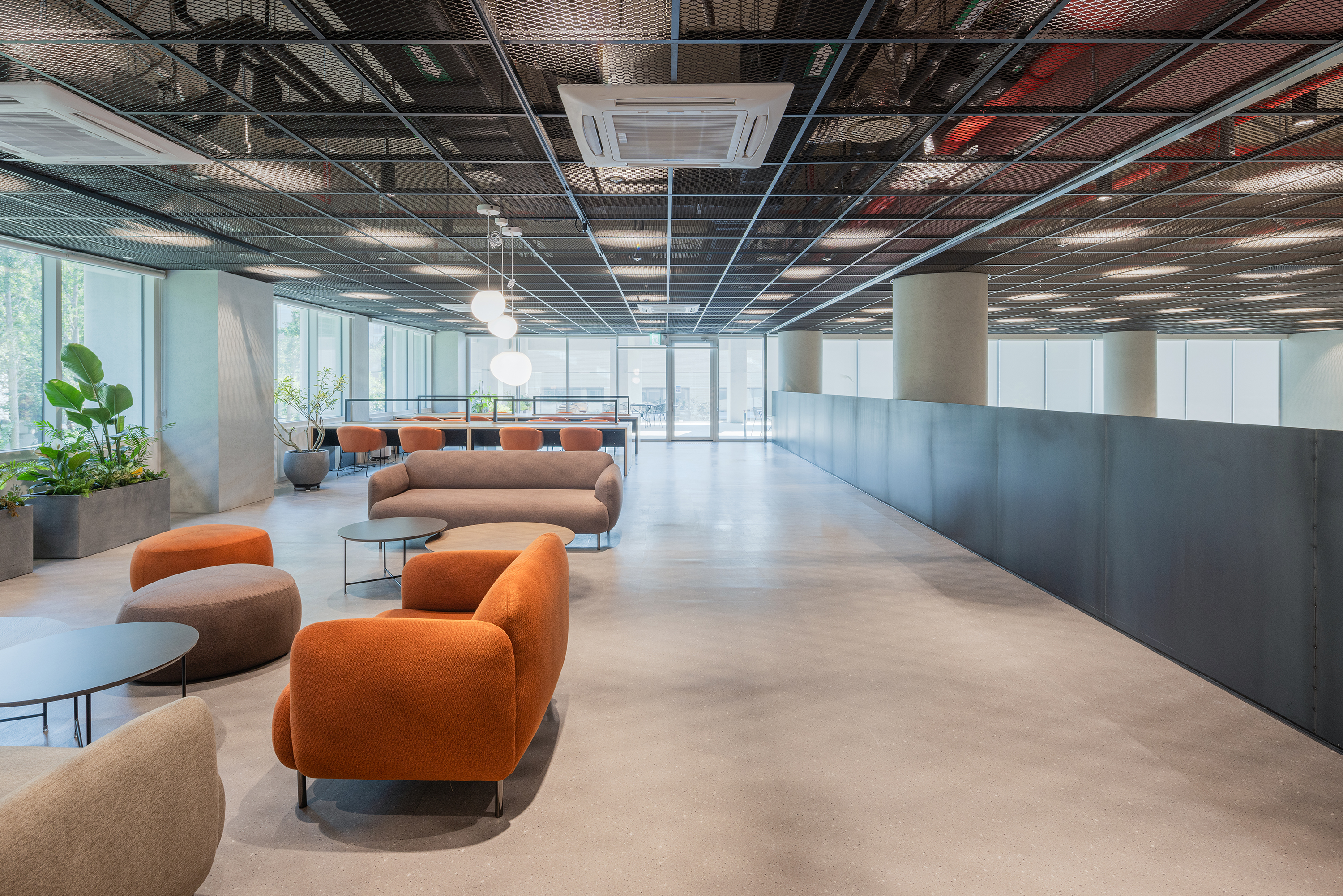 Mega Floor는 확장된 ‘공유’의 개념을 평면, 단면 및 외부공간에 적용하고 있다. ‘ㄱ’자 형태의 코어를 중심으로 조망이 좋은 북쪽과 동쪽으로는 입주기업을 위한 업무시설을 배치하고 채광이 좋은 남쪽과 서쪽으로는 프로그램을 특정하지 않은 커다란 공유공간(neutral space)을 계획한다. 이 공간은 입주기업의 목적에 맞게 회의실과 집중 업무공간은 코어의 한쪽에 통합하여 계획되며 층간 공유공간의 활용에 따라 그 위치를 달리한다. 결국 층별 평면 상의 위계는 사적이며 보안 영역에서 공적이며 개방 영역으로 확장되어 입주기업(Private/Secured), 코어 존의 공유업무(Semi-Private/Semi-Secured), 공유공간(Public/non-secured), 그리고 외부공간으로 연결된다. 이는 단면에서도 적용되는데, 두 개 층의 공유공간을 하나로 묶어 층간 시선과 동선이 확장되도록 계획하며 이는 전 층을 관통하는 void와 연계되어 채광, 온도 및 습도를 조절하여 에너지 소비를 줄이면서 쾌적한 내부 공간 환경을 제공한다.