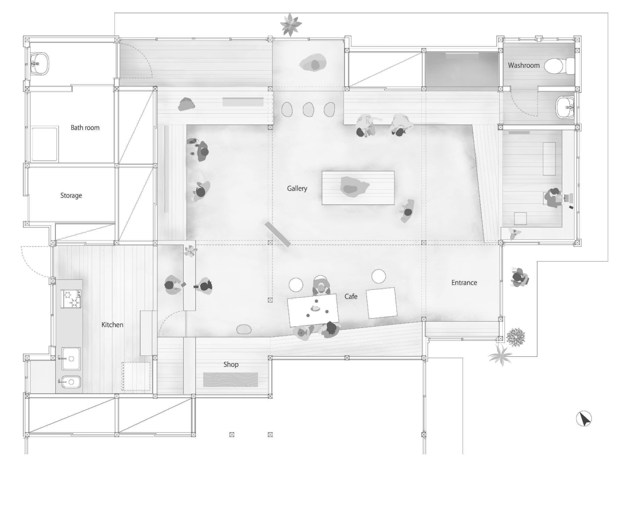 철거 후의 바닥은 노출 콘크리트 흙바닥으로 마감되며, 골목길에서부터 내부까지가 자연스럽게 이어지는 열린 접근성을 확보한다. 기존의 나무 마루에는 안쪽을 향하는 엔가와를 덧대어 흙바닥을 감싸는 구성으로 계획했으며, 실내 공간은 마치 도시 속의 작은 광장 혹은 큰 정자처럼 많은 사람들이 모일 수 있는 장소가 된다. 전시 공간은 예술가에게 자유롭게 위임되며, 프로젝트마다 다른 공간이 나타난다. 방문객은 작품과 공간이 어우러지는 독특한 분위기를 매번 새롭게 경험할 수 있다. 엔가와에 앉아 차를 마시며 작품을 감상하는 시간은 예술과 공간이 만나는 순간을 더욱 깊게 만들어준다.