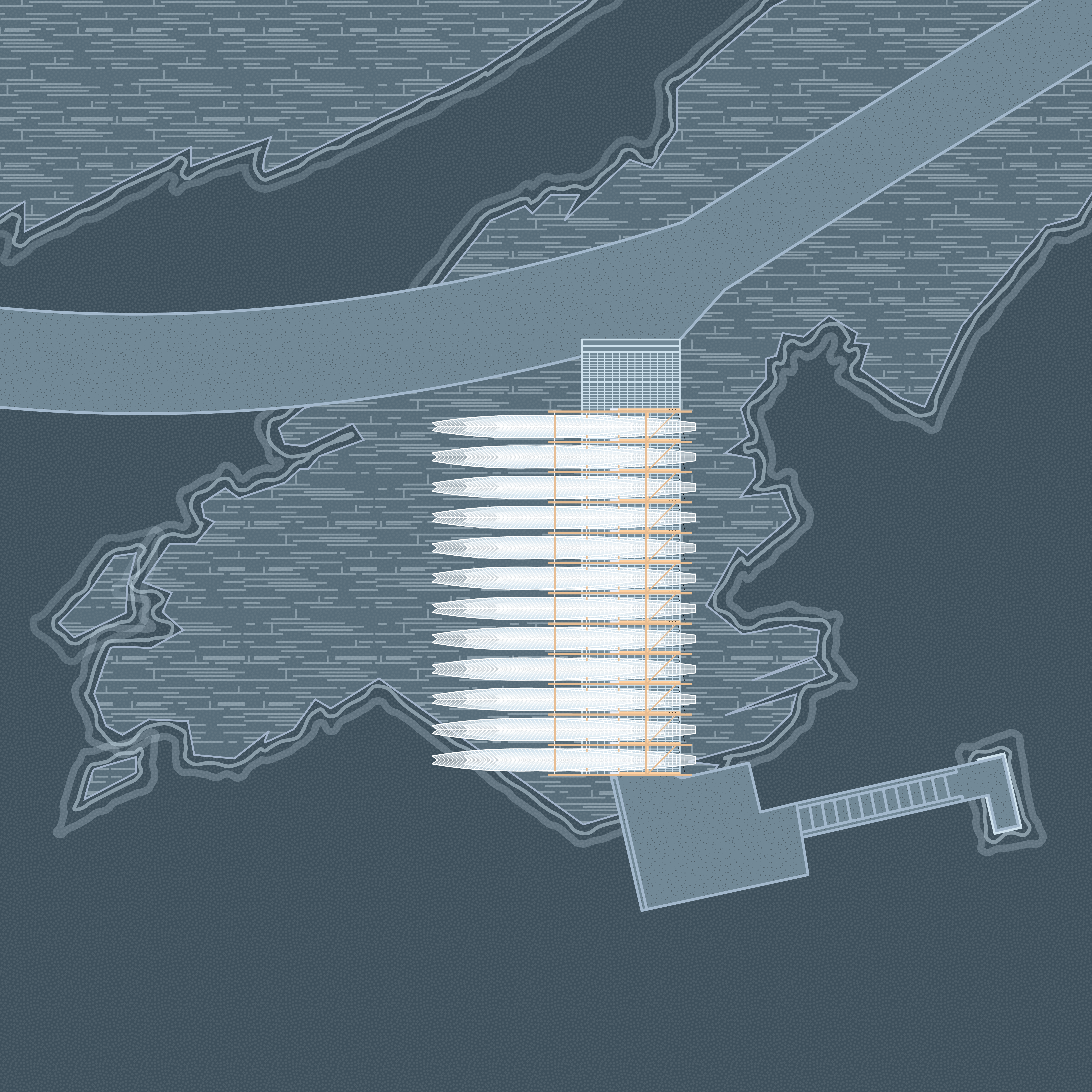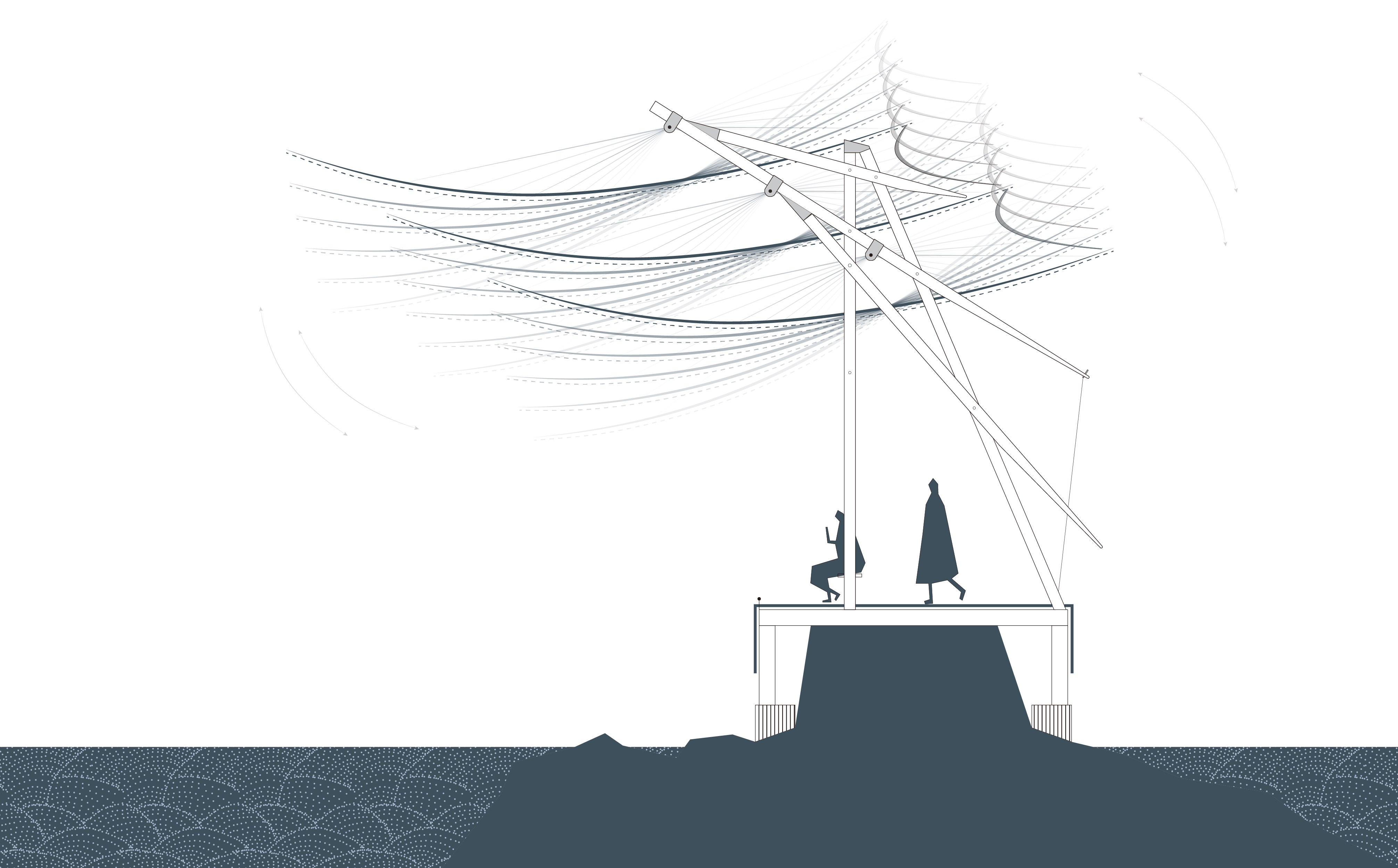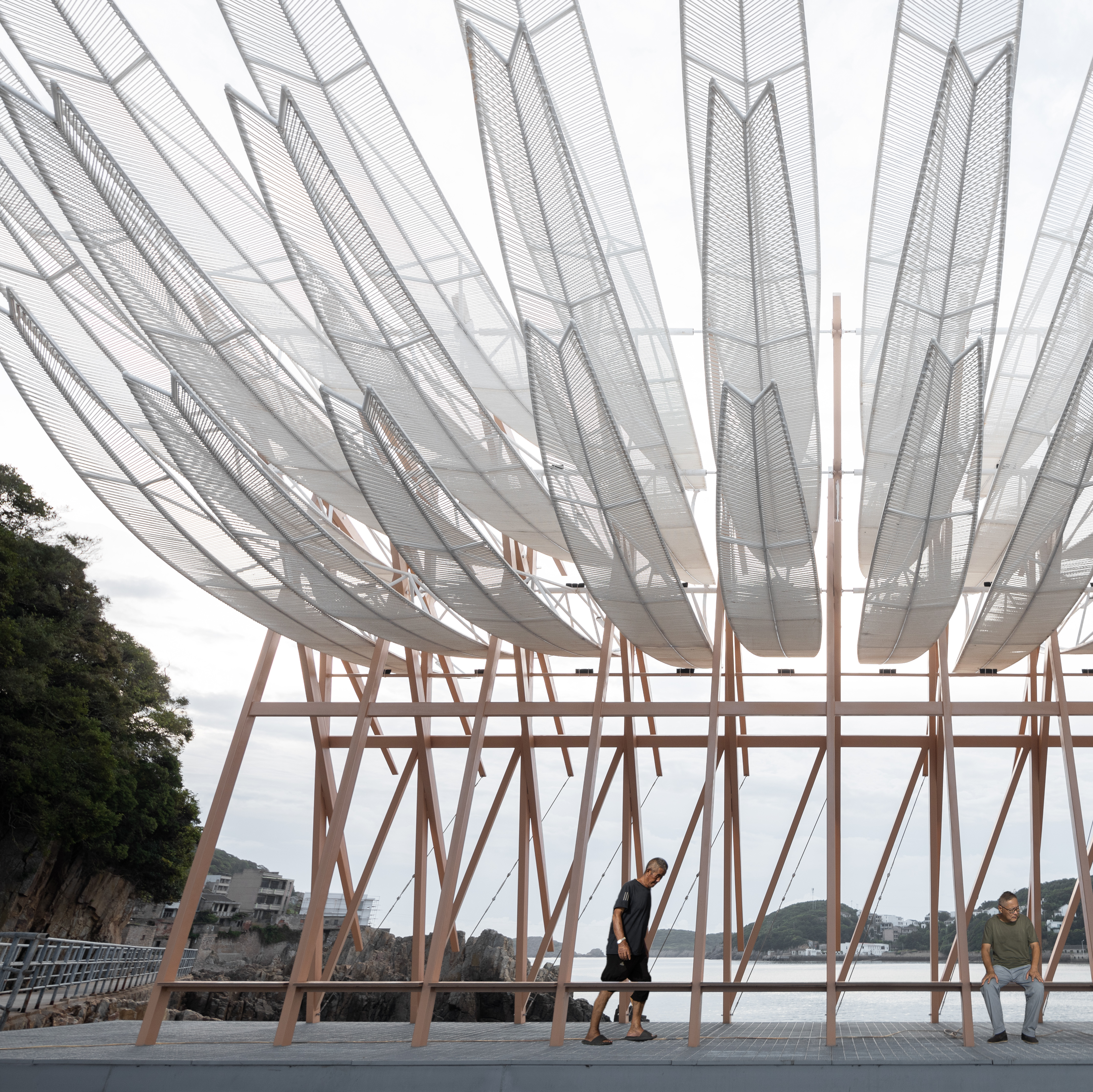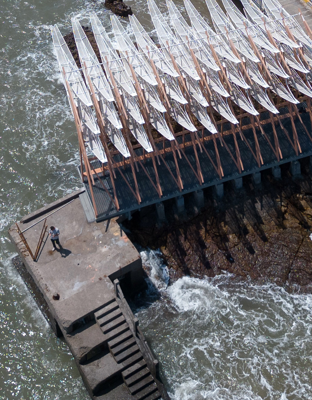 이 파빌리온은 섬의 입구에 위치하며, 과거 어업으로 번성했던 부두를 리모델링해 설계된 구조물이다. 원래는 조수의 오르내림에 따라 움직이도록 구상되었으나, 관광객 중심의 이용 방식을 고려해 바람에 반응하는 구조로 변경되었다. 긴 날개 형태의 구조물이 해풍에 따라 부드럽게 흔들리며, 파도와 함께 섬의 리듬을 시각적으로 표현한다.