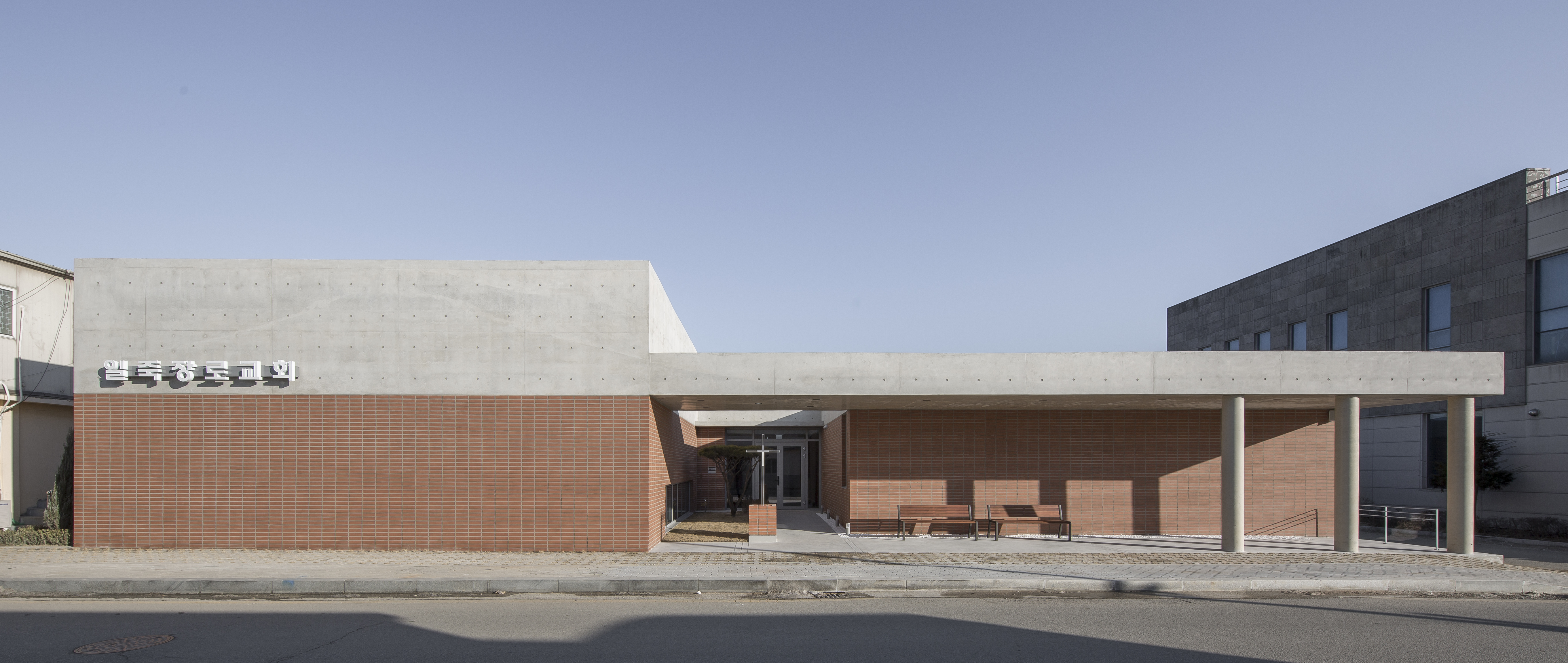 하늘 높이 세우는 대신 바닥에 놓인 작고 겸손한 십자가는 교회의 상징을 낮은 시선으로 끌어내려, 보다 일상적인 공간의 일부로 만든다. 전면 필로티를 받치는 세 개의 원기둥은 삼위일체 교리를 은유하며, 예배실 전면의 천창 아래로 빛이 쏟아지는 붉은 벽은 그리스도의 보혈을 상징하면서 공간에 강렬한 인상을 더한다.