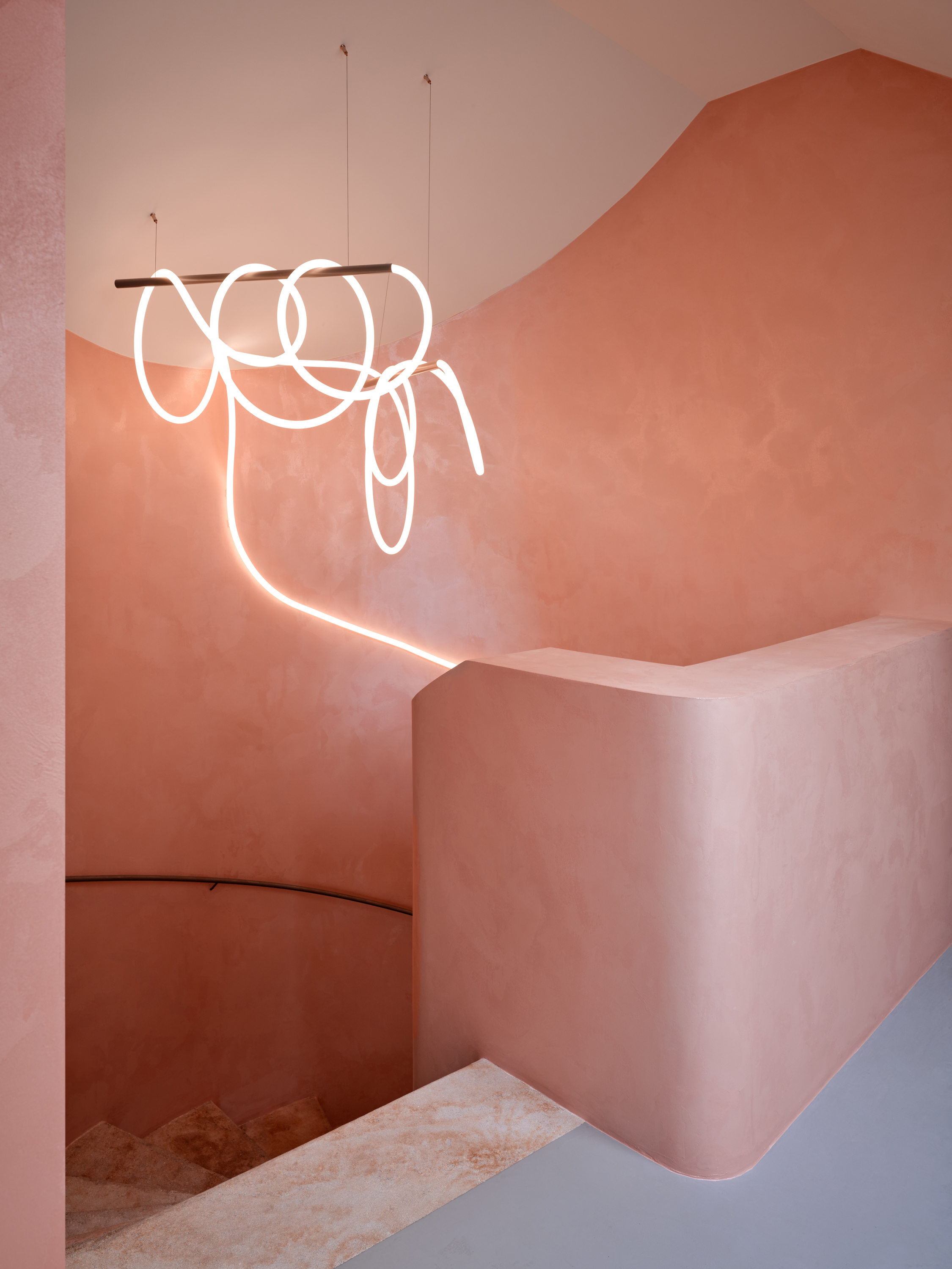 공용부의 중심에는 곡선형 원형 계단이 배치되어 있으며, 브러시 마감과 보호 코팅을 통해 질감을 살렸다. 계단을 따라 설치된 라인 조명은 공간의 흐름을 강조하며, 계단실은 전체 공간에서 강한 시각적 중심이 된다.