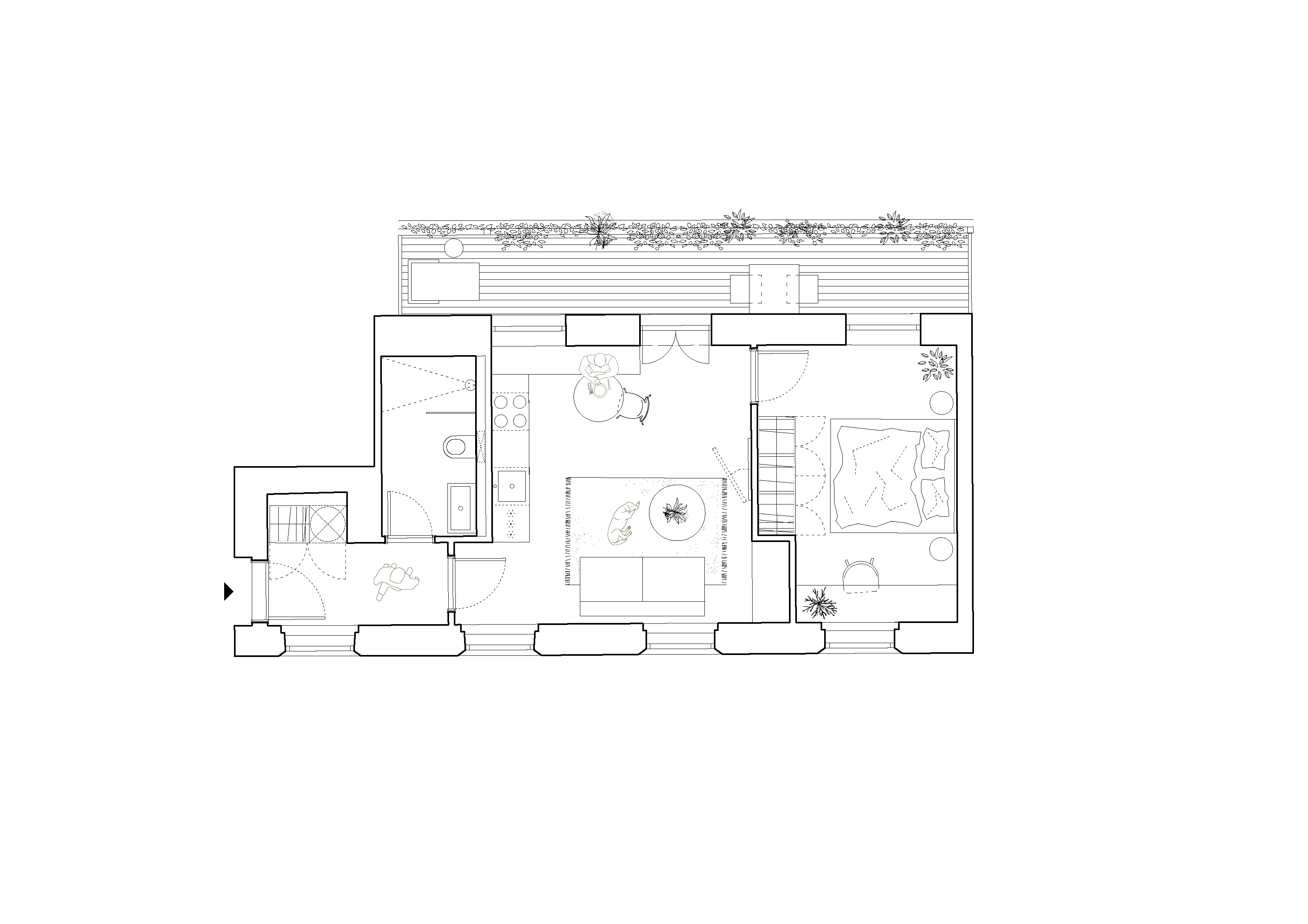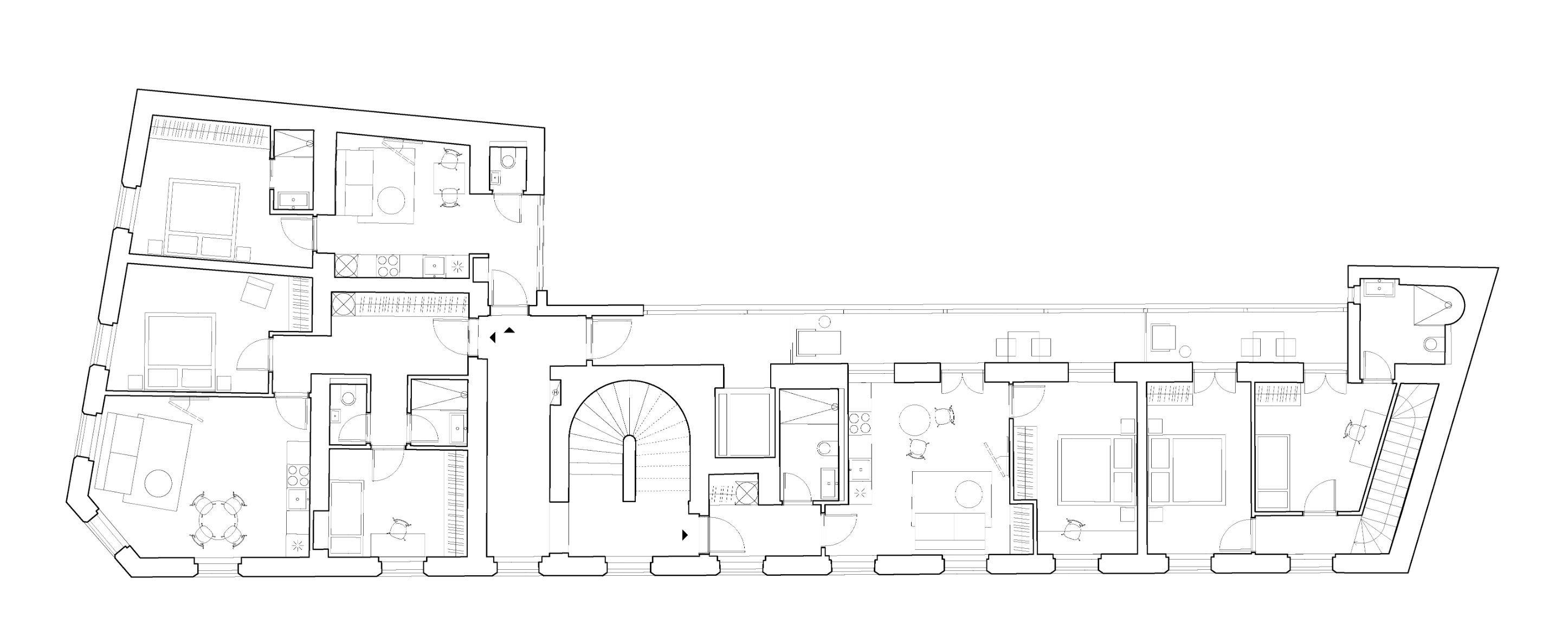 각 세대는 서로 다른 평면 구조를 가지고 있다. 일부 유닛에는 발코니가 추가되었고, 1층과 2층 사이에는 독립 진입이 가능한 중층형 유닛이 있다. 가장 큰 변화는 다락층에서 이루어졌으며, 기존 로프트 공간은 4개의 유닛으로 재구성되었다. 자연 채광을 고려한 창 설계와 라운드형 채광 웰이 도입되었다.