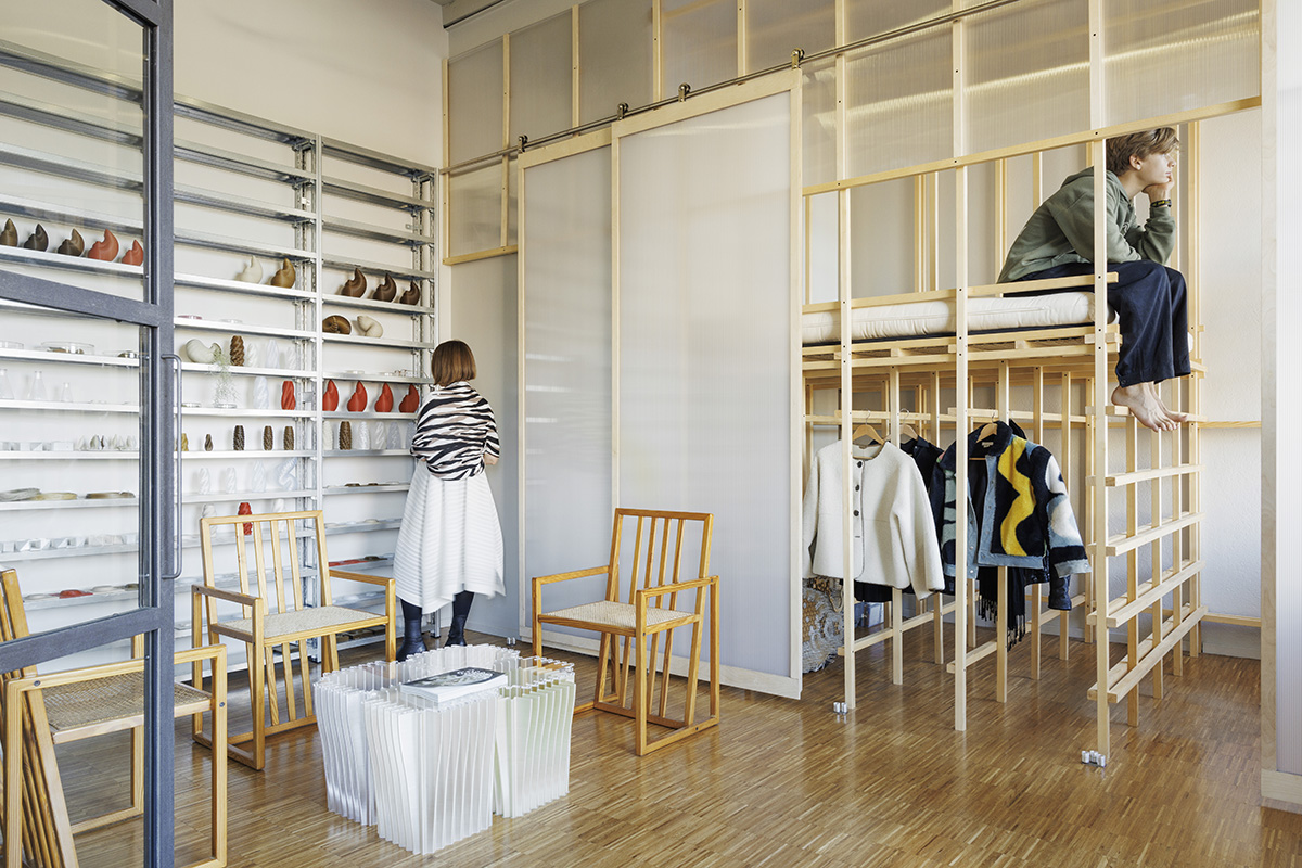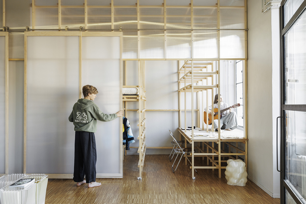 마지막으로 게스트룸은 전나무 격자 구조를 기반으로 한 콤팩트한 입체 공간으로 구성되어 있다. 두 개의 다다미 침대, 책상, 수납장, 도시 조망을 위한 독서 공간이 집약된 구조로 구성된다.