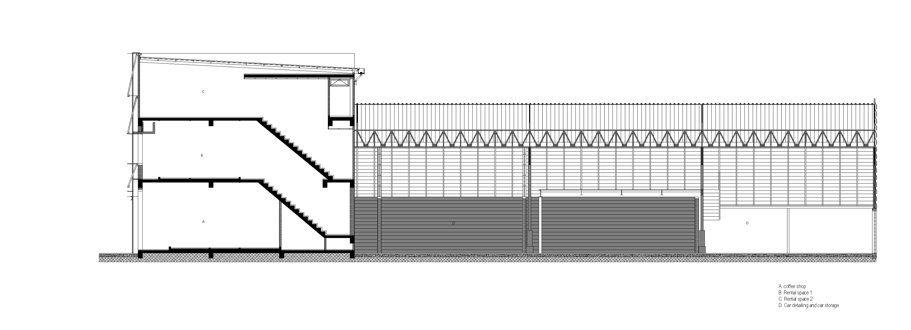지붕 구조는 전면 보수 및 도장을 거쳐 보강되었고, 일부 영역은 자연광 유입과 환기를 위한 개구부로 변형되었다. 전면부의 카페 공간은 재료의 재해석과 재사용을 콘셉트로 설계되었다. 기존 건물에 설치되어 있던 다수의 롤러 셔터 도어 중 일부는 양호한 상태였는데, 이들은 커피 바 뒤편의 디자인 포인트 벽체로 재활용되었다.