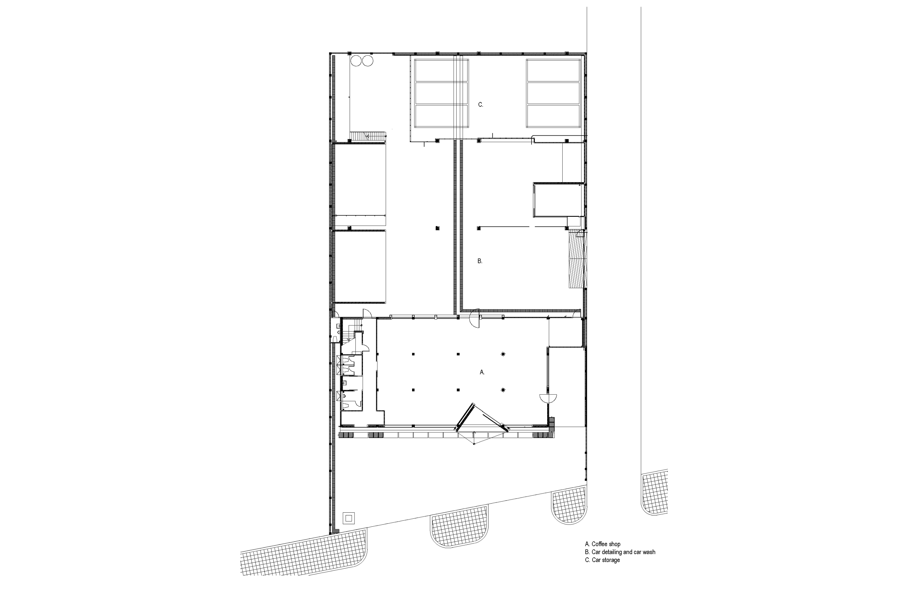 지붕 구조는 전면 보수 및 도장을 거쳐 보강되었고, 일부 영역은 자연광 유입과 환기를 위한 개구부로 변형되었다. 전면부의 카페 공간은 재료의 재해석과 재사용을 콘셉트로 설계되었다. 기존 건물에 설치되어 있던 다수의 롤러 셔터 도어 중 일부는 양호한 상태였는데, 이들은 커피 바 뒤편의 디자인 포인트 벽체로 재활용되었다.