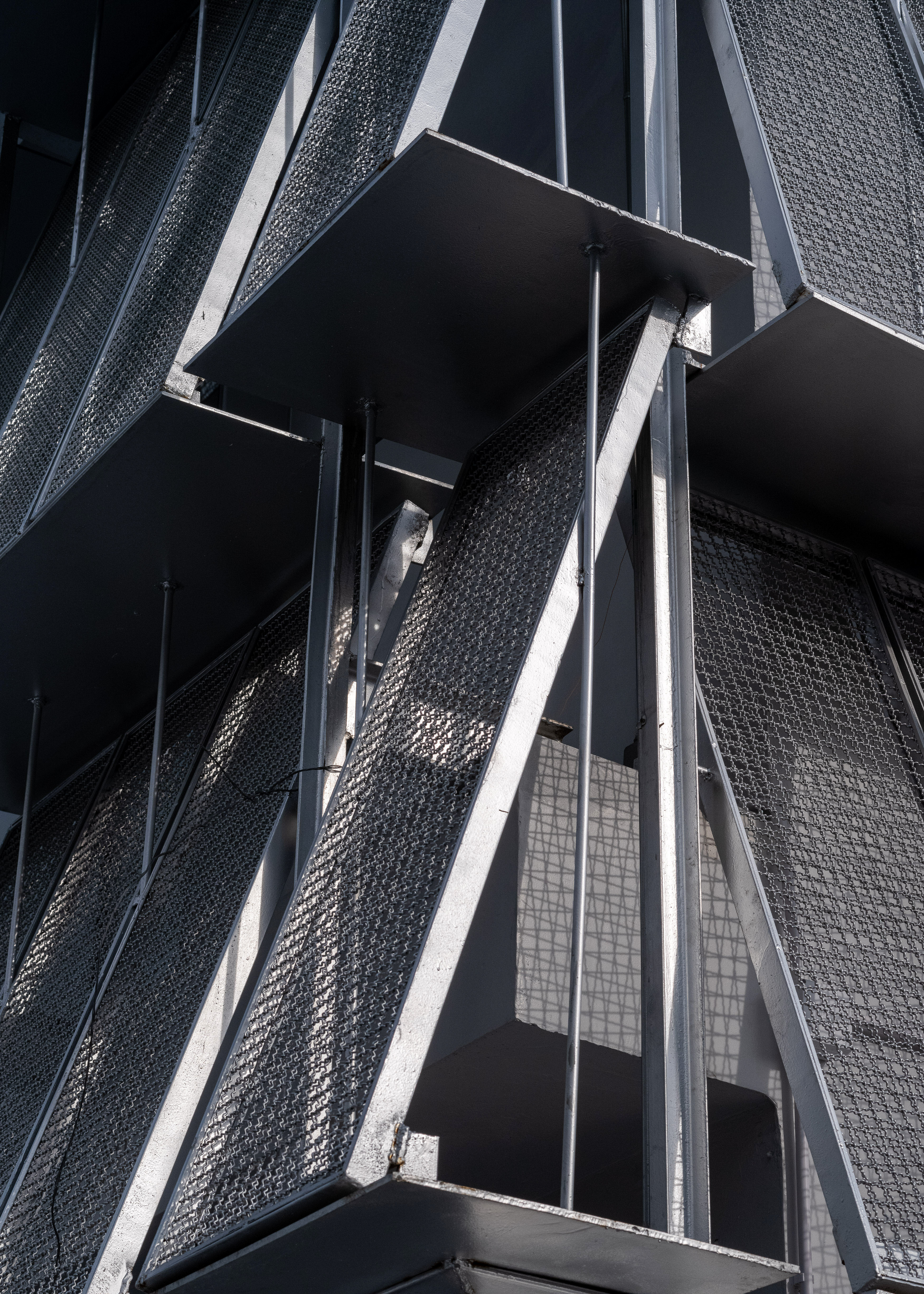 대각선과 수직 방향으로 조합된 메시 패널은 외부에서의 시각적 투명성을 확보하면서도, 자연 환기와 보안 기능을 동시에 충족하도록 설계되었다. 또한 메시를 비스듬히 배열해 차양 기능을 수행하는 돌출 처마를 형성함으로써, 태양을 효과적으로 차단하고 입면에 리듬감 있는 볼륨감을 부여했다. 이 구조는 별도의 높은 담장을 두지 않으면서도 공개성과 경계성 사이의 균형을 이루는 해법이기도 하다.