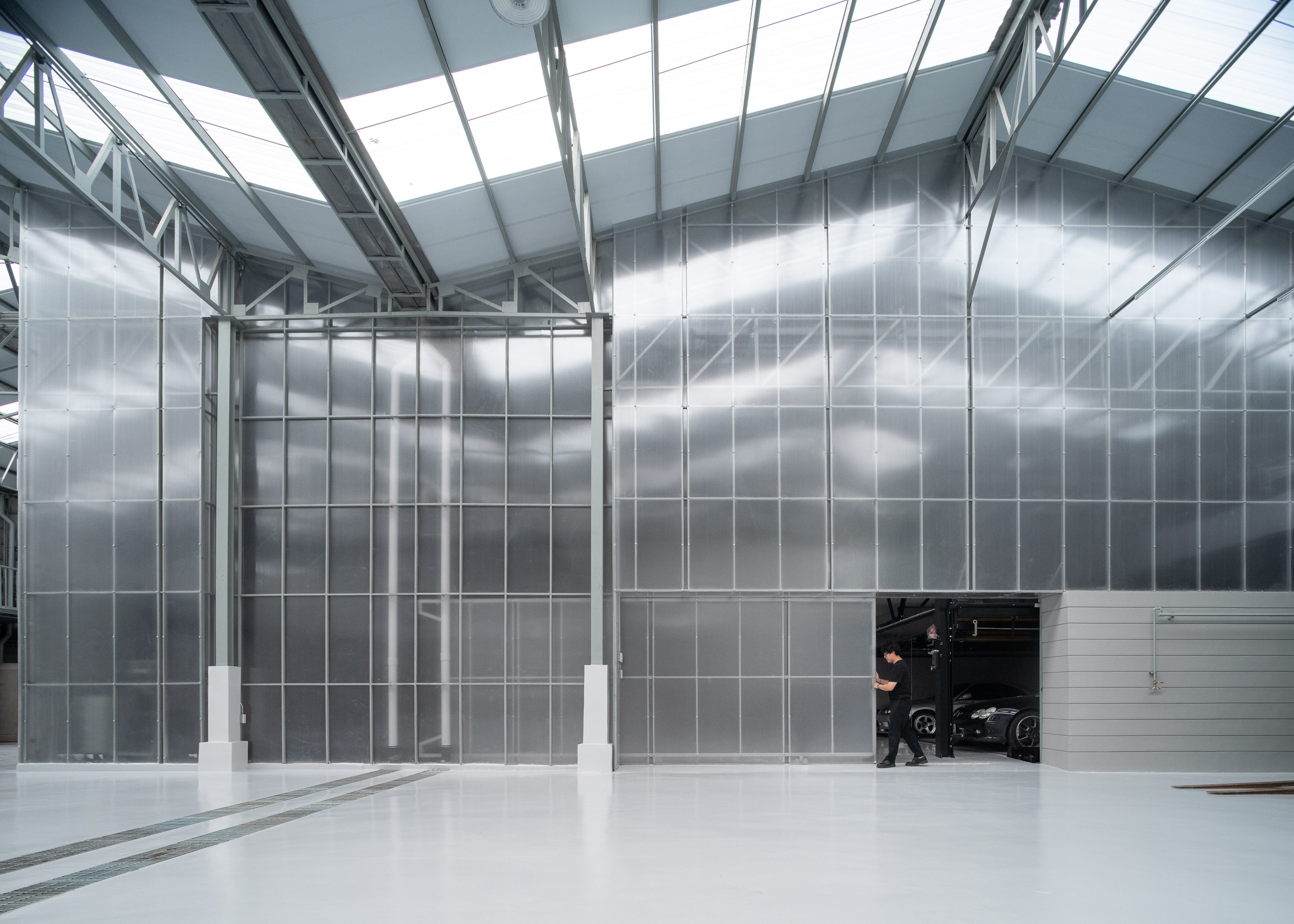 이 프로젝트는 방나 지역에 위치한 세차, 자동차 외장 관리, 차량 보관 호텔 등의 차량 복합 서비스 공간이다. 이러한 서비스는 일반적으로 긴 대기 시간을 수반하기 때문에, 고객 경험을 확장하기 위한 부가 프로그램으로 카페 공간이 함께 설계되었다. 이 카페는 도로변에서 잘 보이는 기존 건물의 전면부에 배치되었다. 후면의 자동차 서비스 공간과도 연결되어 있어, 고객은 커피를 마시며 차량 관리 과정을 직접 바라볼 수 있다.
