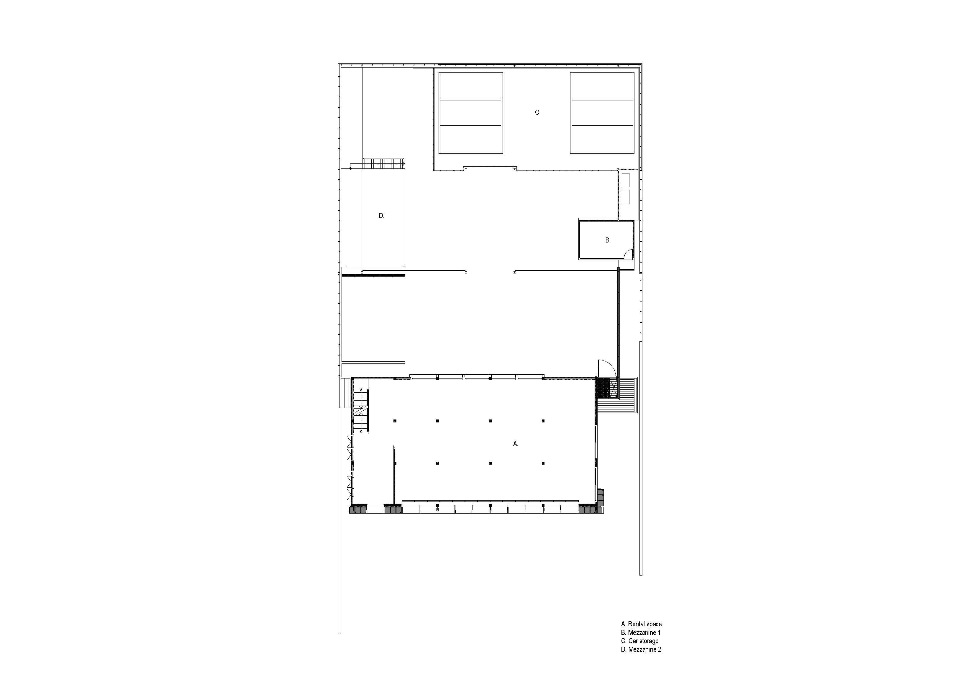 건축가는 많은 고정 계단 대신 이동 가능한 철제 계단을 도입하여, 층간 이동이 자유로우면서도 시공 비용과 공간을 절감할 수 있도록 했다. 이 계단을 통해 중층에 접근할 수 있으며 건물 상부 정비 작업에도 활용된다. 차량 호텔 공간은 반투명한 벽체가 적용되어 공간을 명확히 구분하면서도 폐쇄적인 인상을 주지 않는다.