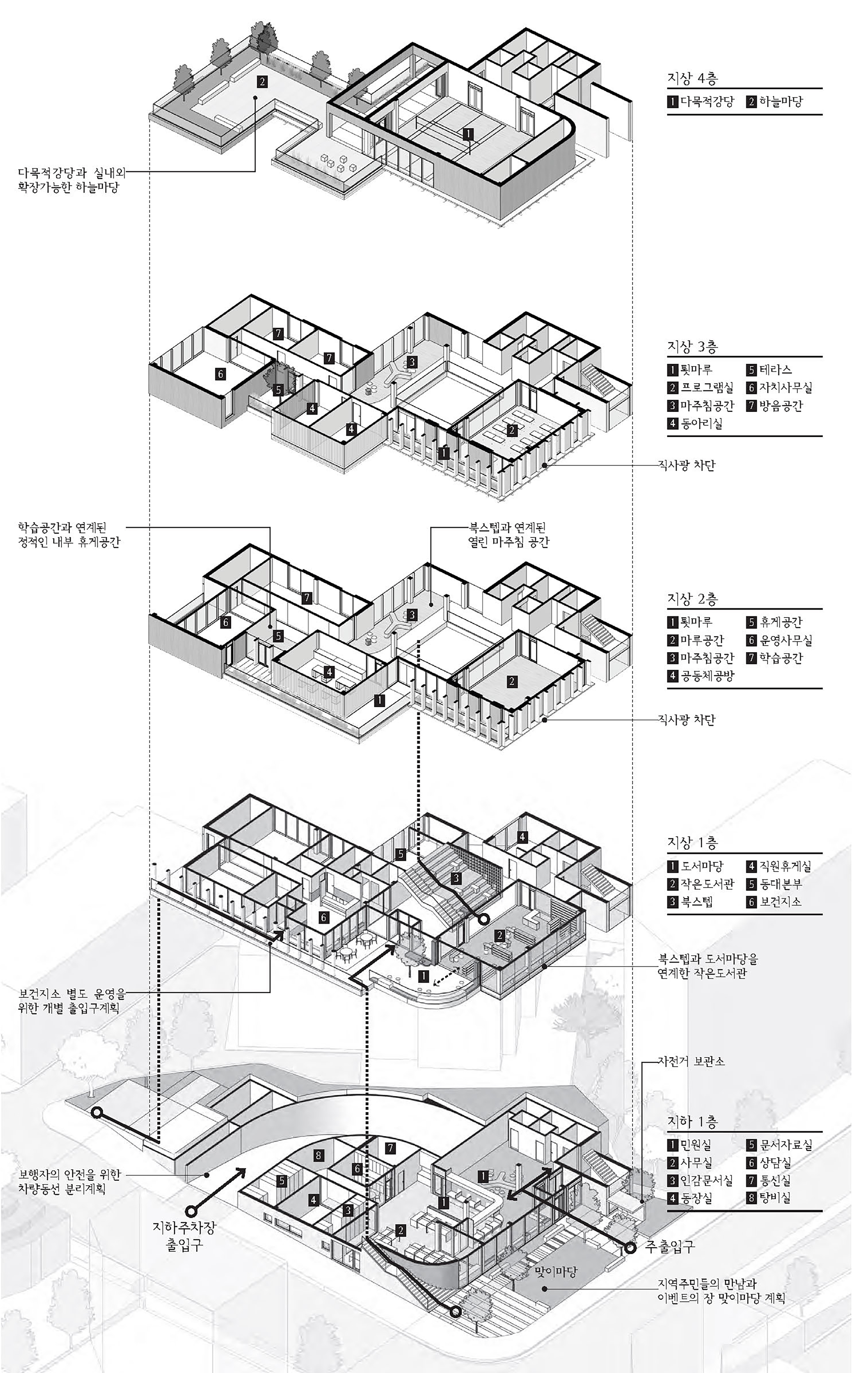 - 다양한 외부공간을 계획하여 지역주민들의 만남과 휴식을 하며, 인접한 내부 프로그램들과 연계 및 확장 가능한 공간으로 계획
