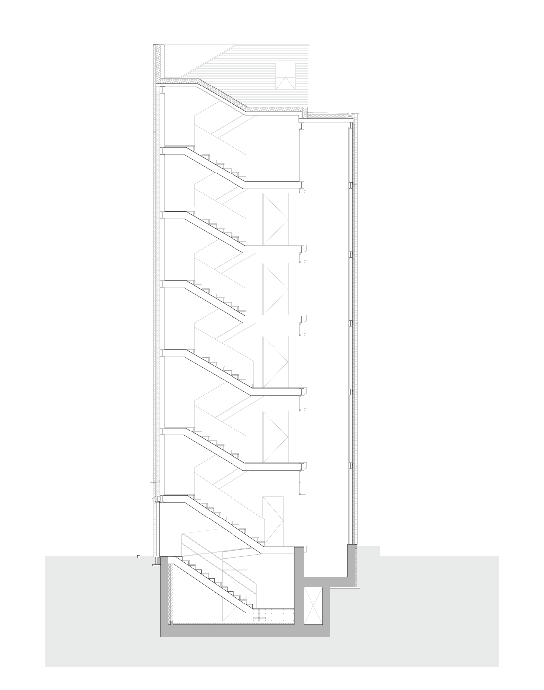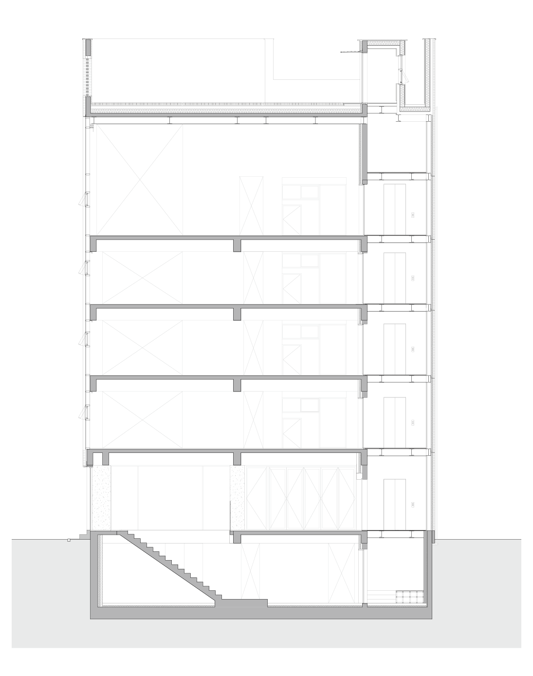 도로 사선 제한으로 인해 기울어졌던 기존의 벽체는 내부 공간의 활용도를 저해하는 요소였다. 철거하고 5m 이상의 층고를 확보함으로써 공간의 개방감을 극대화했다. 철골 구조를 도입하여 수직적으로 확장하고, 내부의 공간감을 만듦과 동시에 외부에서 인지할 수 있는 입면을 만들어 기존 건축물의 구조적인 한계를 극복하고자 했다.