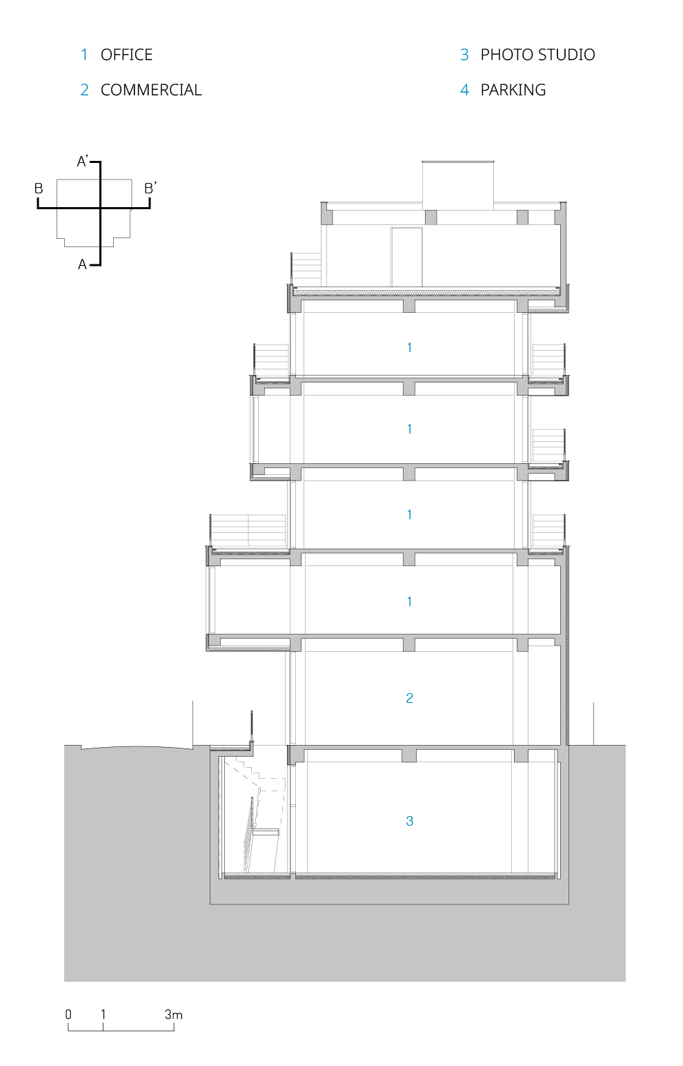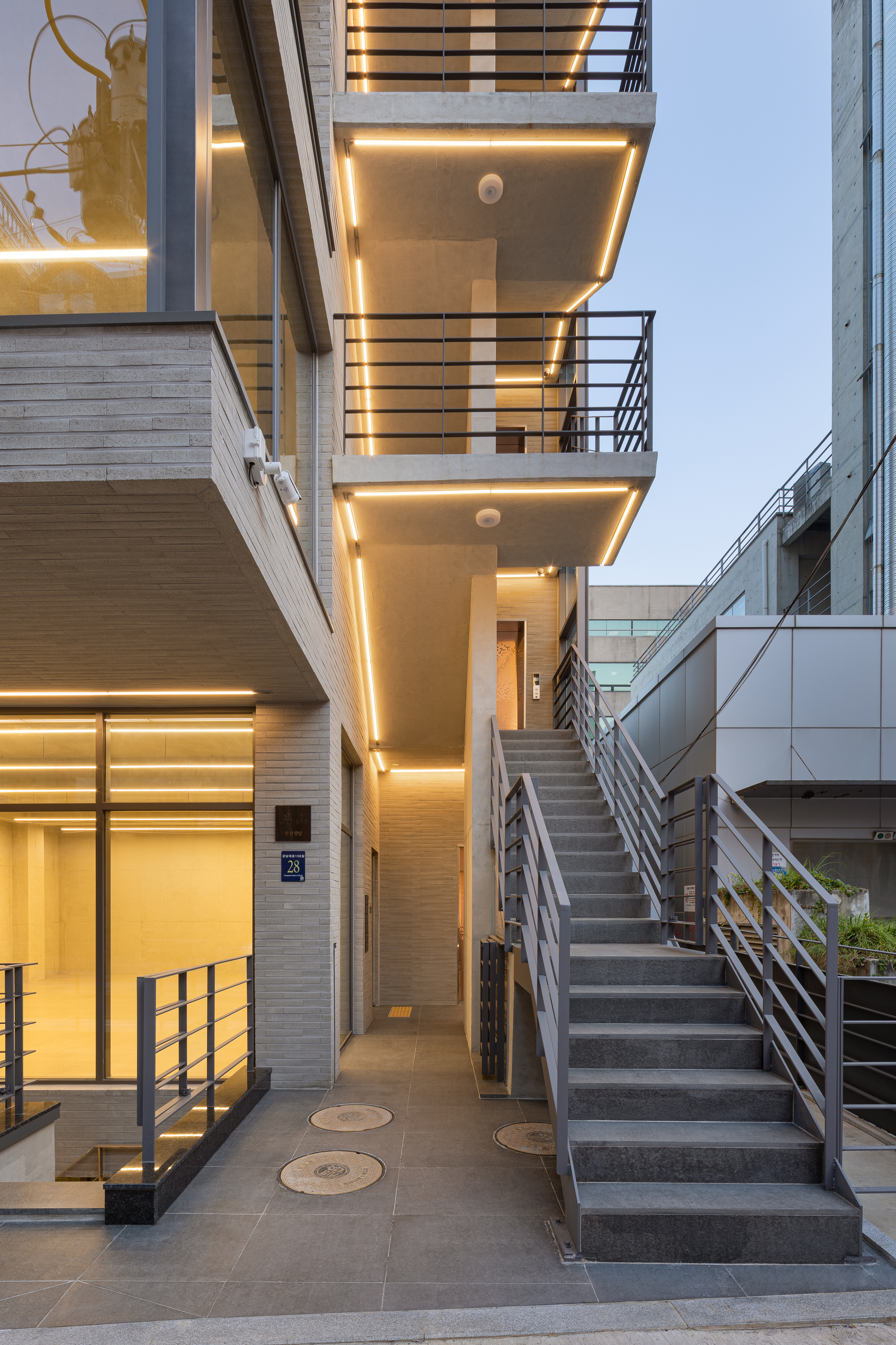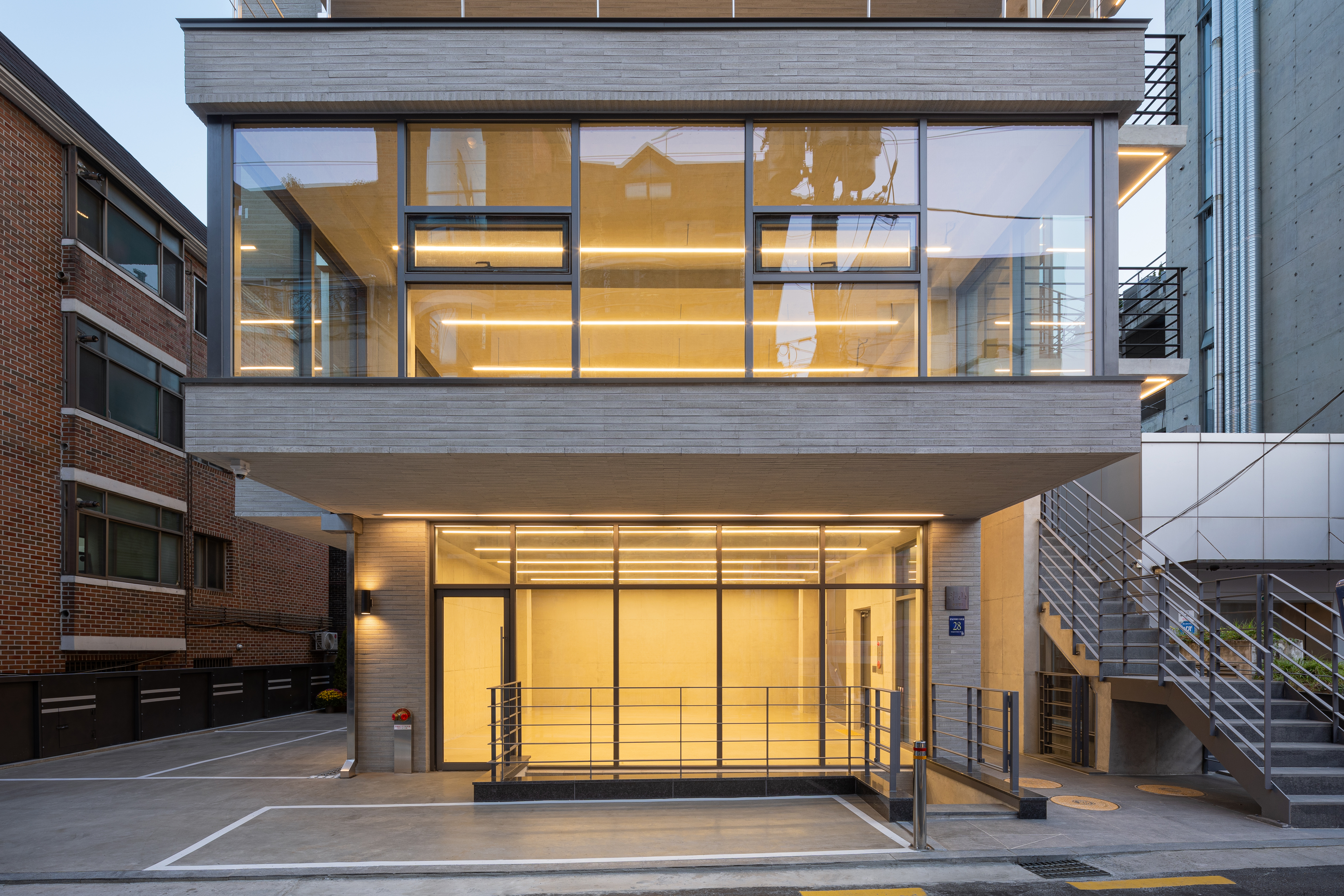 건축물의 매스는 보행자들에게 친밀하게 다가가기 위 해 분절하여 스케일을 작게 만들었다. 1층은 주차 공간을 조성하며 대지 경계에서 전면으로 물러난 대신, 2층의 매스는 대지의 경계까지 최대한 돌출시켰다. 전면도로 방향에는 작은 선큰을 두어 지하에서도 자연채광과 환기가 가능하다.