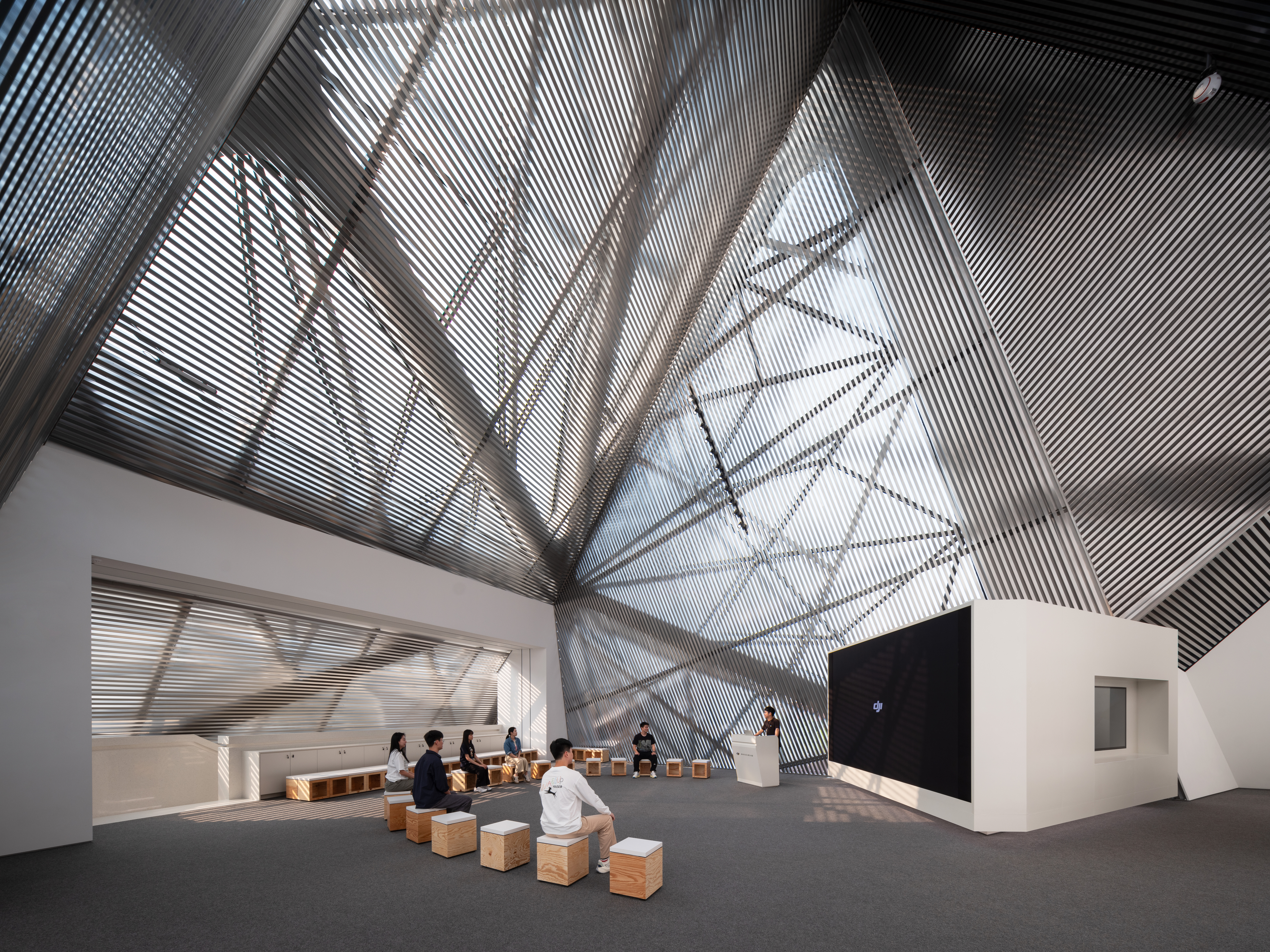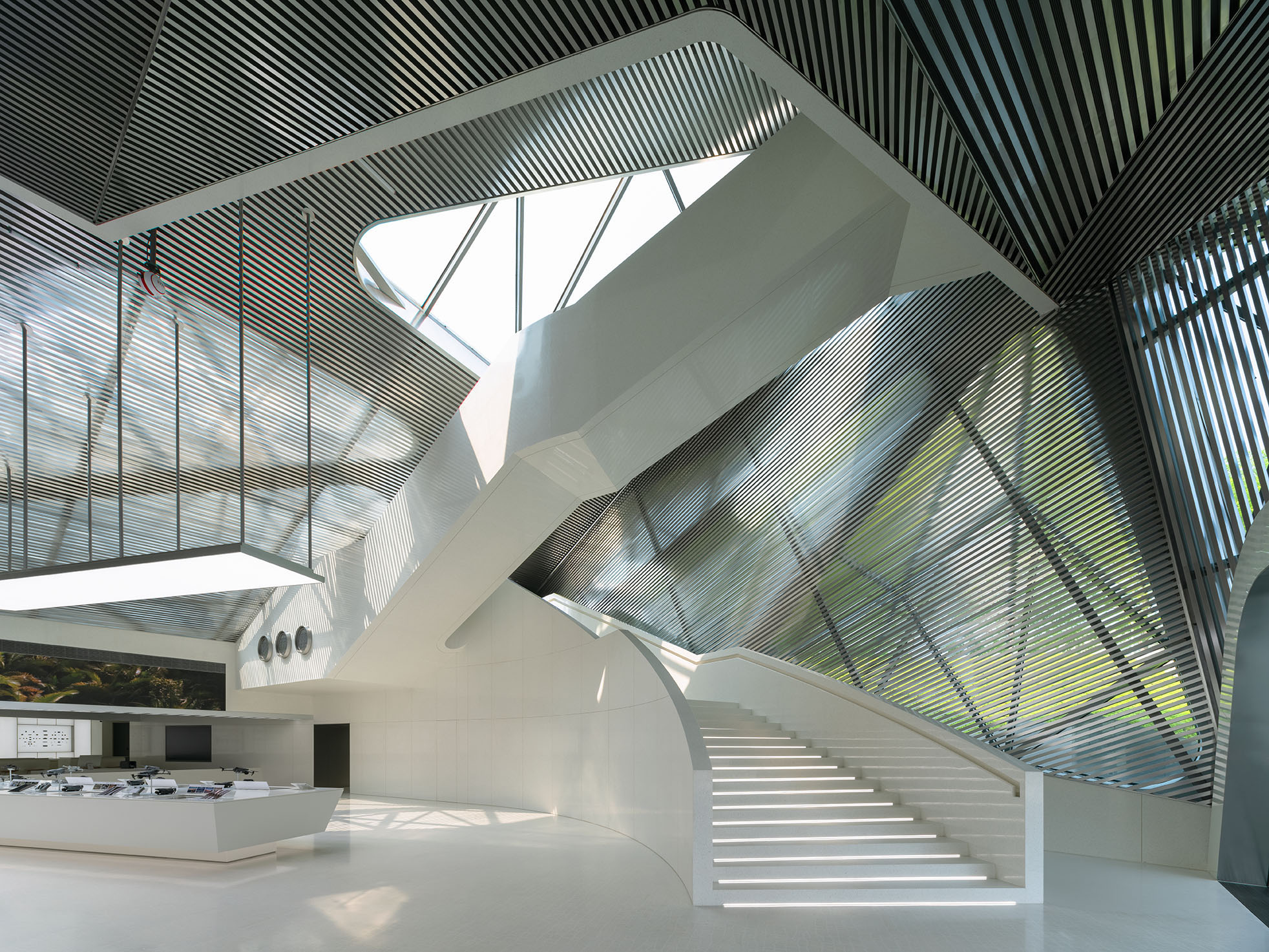 디자이너는 지역적 특성에 따른 강렬한 햇빛 노출 문제를 해결하기 위해 종이접기에서 영감을 얻은 기하학적인 비정형의 매스를 통해 다양한 각도의 유리 커튼 월로 자연광이 풍부하게 유입되게 하였다. 또한, 기존의 외피와 그 안쪽에 빛의 흐름을 고려한 새로운 한 겹의 스킨을 더하며 각도와 형태에 따라 강한 인상을 부여했다. 출입구와 이어진 완만한 경사로와 잔디밭이 어우러진 산책로는 드론 테스트를 위한 플랫폼 역할을 한다.