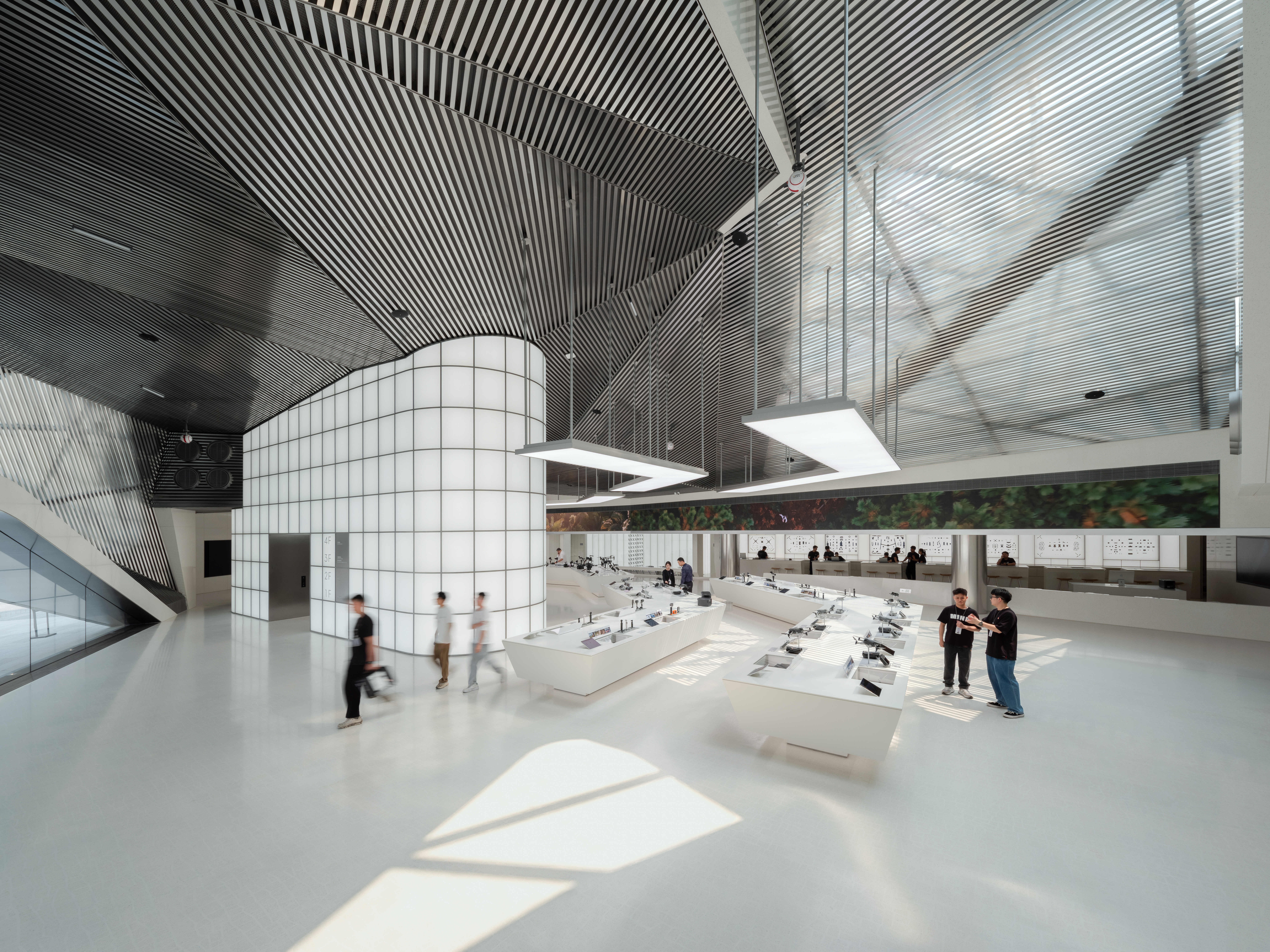드론의 프로펠러에서 영감을 얻은 내부 공간은 각 프로그램에 따른 공간을 유기적으로 연결됐으며, 2층의 전망 데크에서는 선전 지역의 전경을 감상할 수 있다. 계단을 따라 3층으로 이동하면 ‘Hasselblad’ 브랜드와의 협업을 통해 마련된 갤러리형 아트 존과 별도의 프라이빗 응접실이 있다. 이 공간은 전체적으로 밝은 톤으로 조성된 다른 공간과 달리, 차분하고 어두운 컬러를 통해 예술성과 중후함을 강조했다.