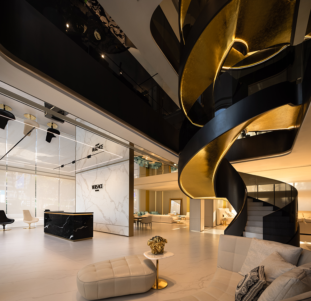 금속과 유리의 조합은 세련된 광택을 만들며 도시의 스카이라인을 반사한다. 로비 리셉션의 벽면은 베르사체 세라믹의 시그니처 석재로 마감하여 브랜드 고유의 고전적인 분위기를 강조한다. 나선형 계단은 공간을 수직으로 가로지르며 유려한 곡선과 빛과 그림자의 대비를 통해 역동적인 분위기를 연출한다. 또한, 금색과 블랙의 대비를 통해 계단에 조각적인 미감을 더했다.