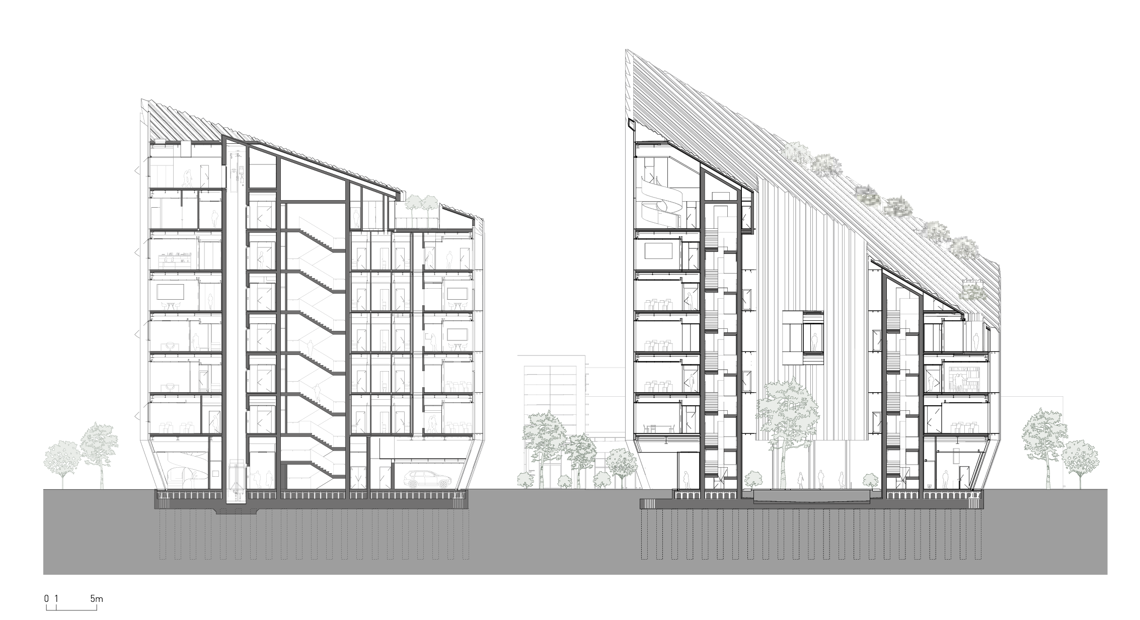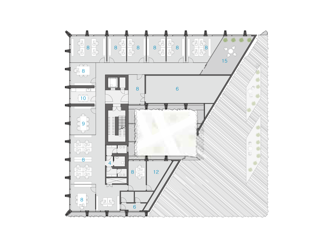 건축가는 미래의 유연성을 고려하여 엑소스켈레톤(Exoskeleton) 파사드를 적용하고 기둥이 없는 개방형 공간을 제안했다. 내부는 현대적인 업무 환경을 고려하여 연결성과 협업을 촉진하는 공간으로 설계되었다. 각 층에는 공용 공간이 배치되어 있어 상호작용과 주변 건물과의 시너지를 극대화했다.
