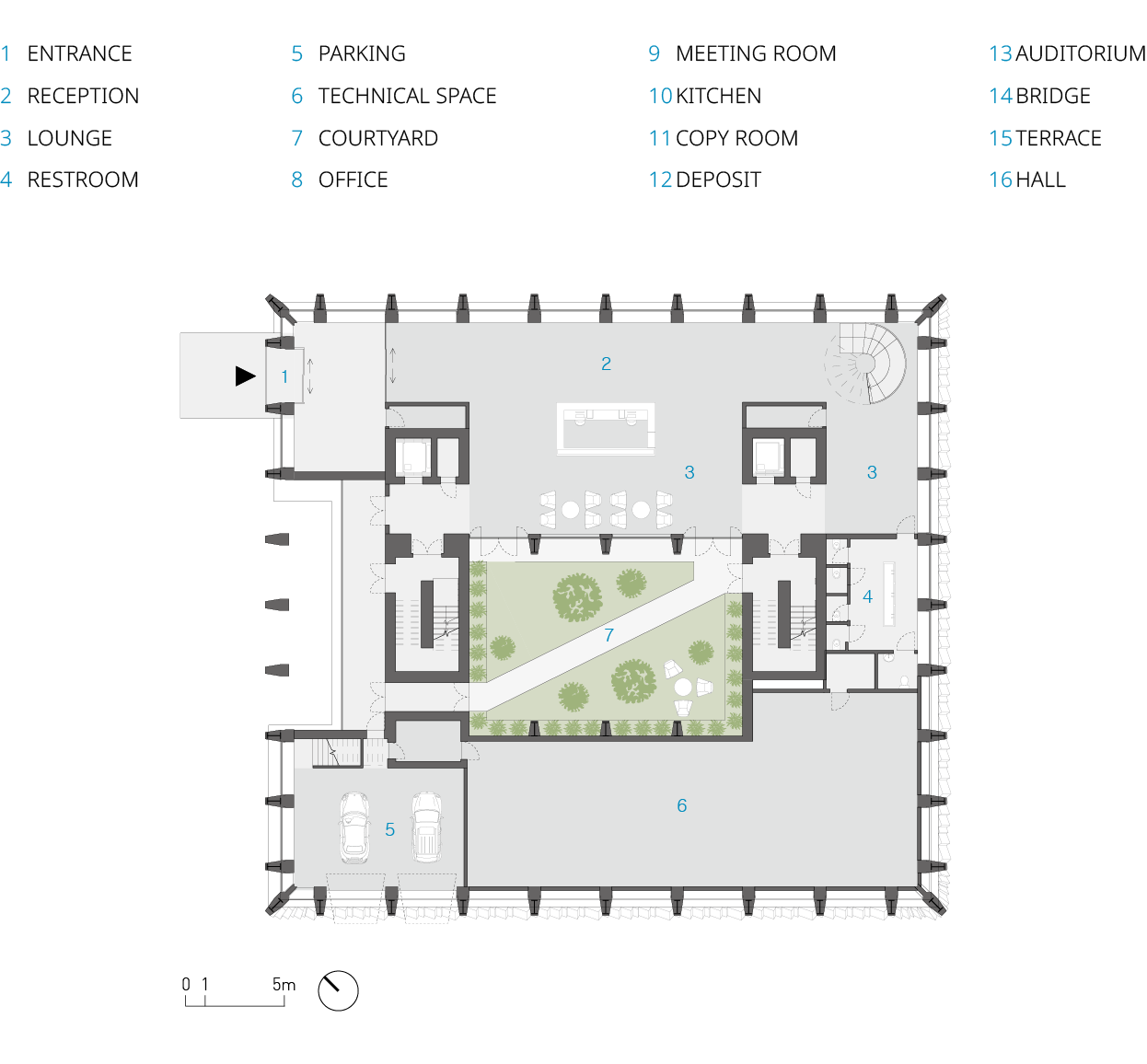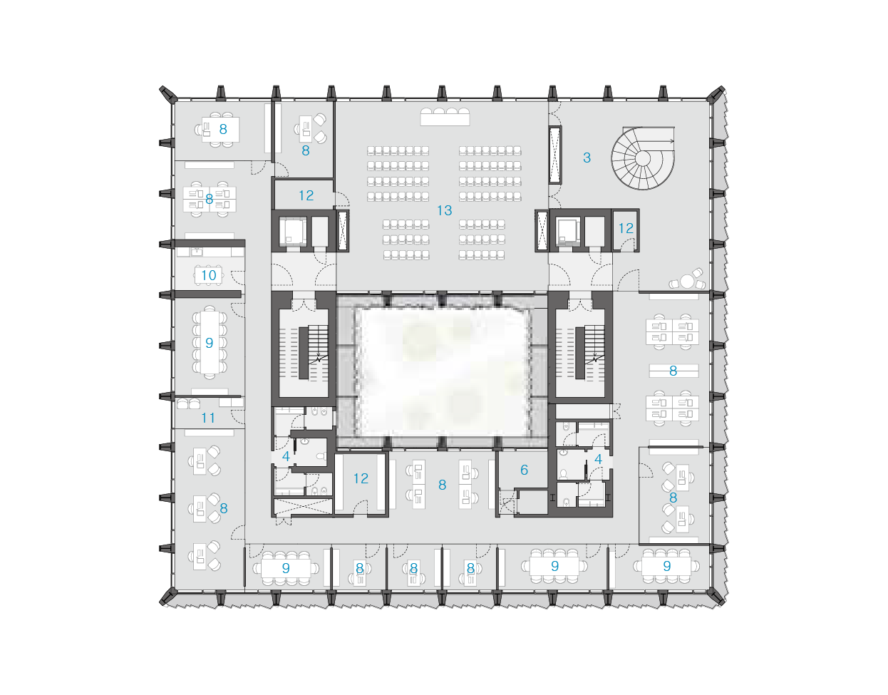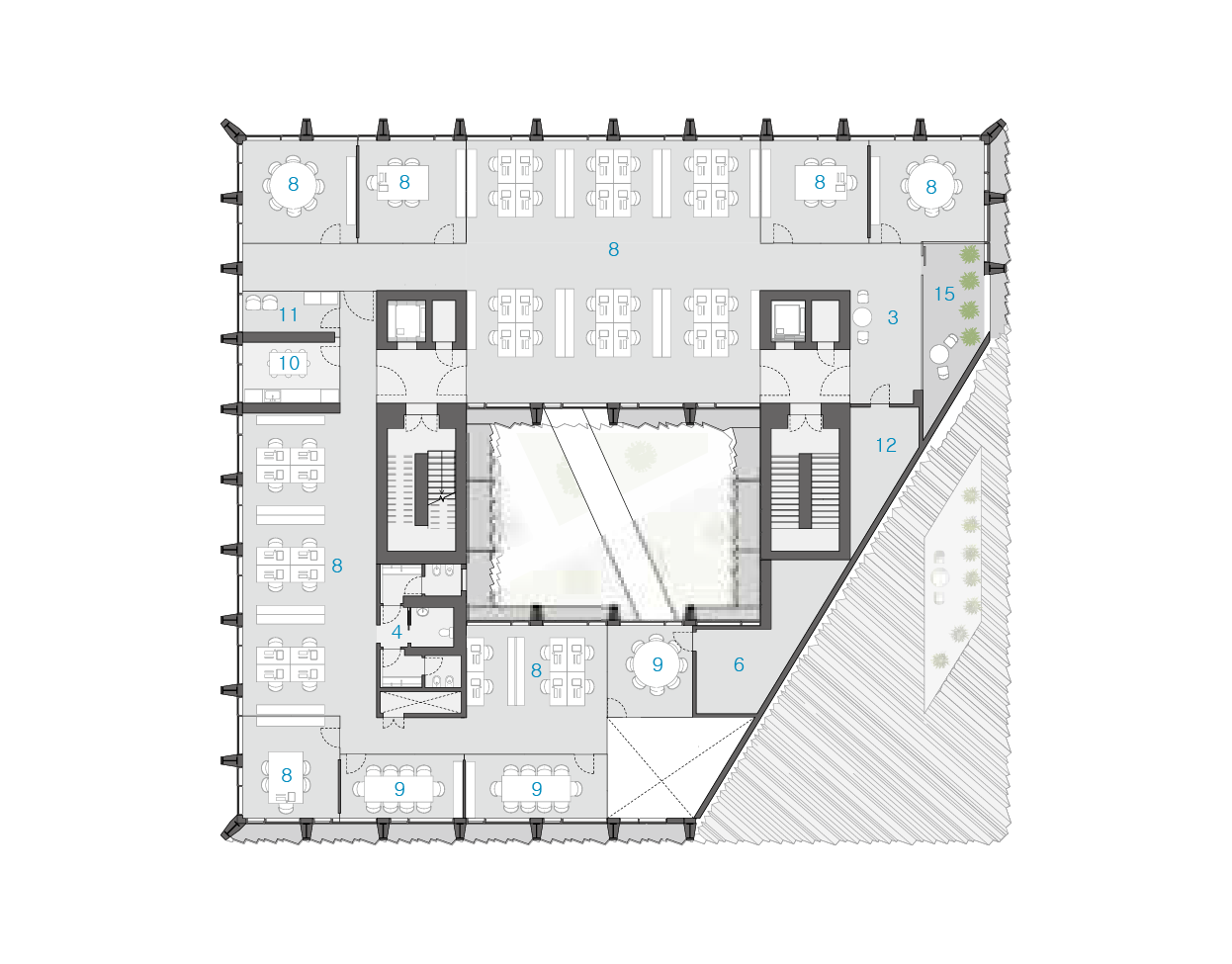건축가는 미래의 유연성을 고려하여 엑소스켈레톤(Exoskeleton) 파사드를 적용하고 기둥이 없는 개방형 공간을 제안했다. 내부는 현대적인 업무 환경을 고려하여 연결성과 협업을 촉진하는 공간으로 설계되었다. 각 층에는 공용 공간이 배치되어 있어 상호작용과 주변 건물과의 시너지를 극대화했다.