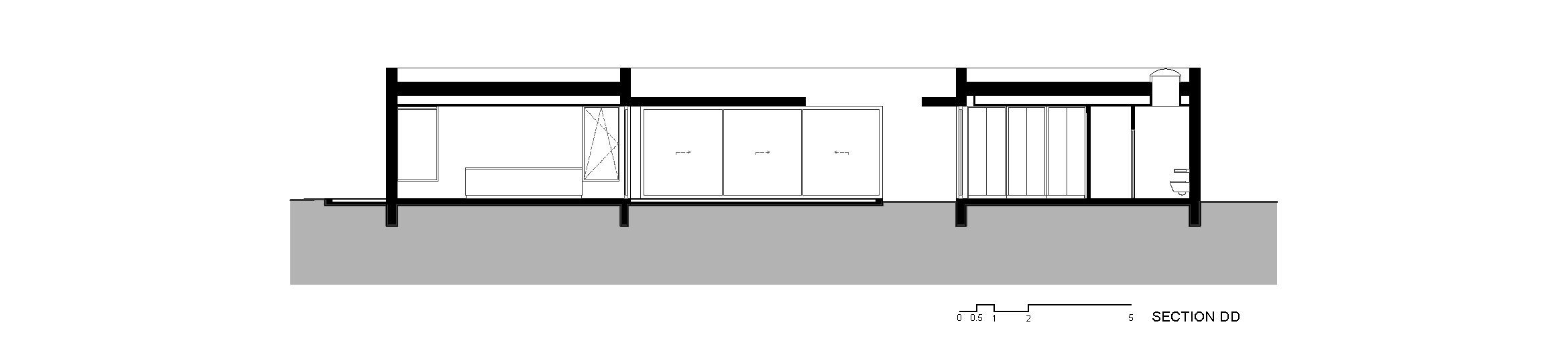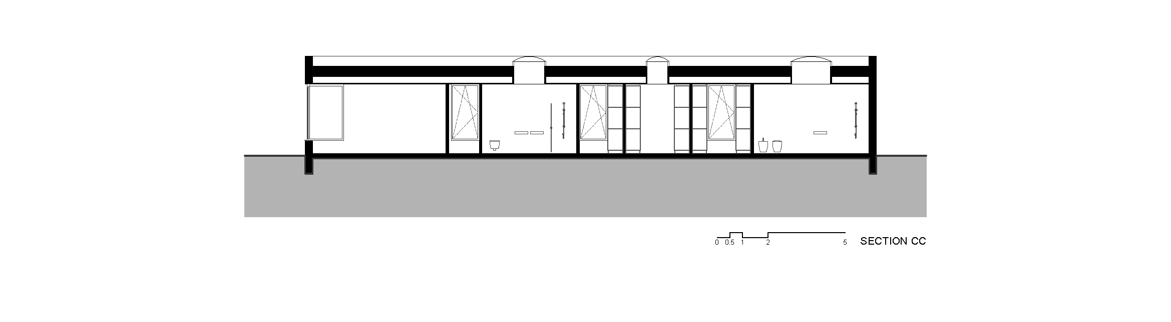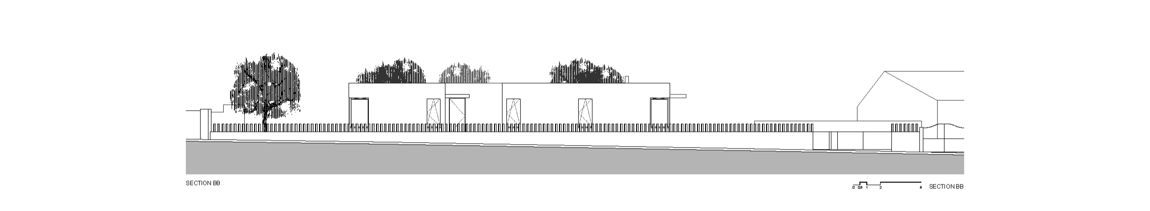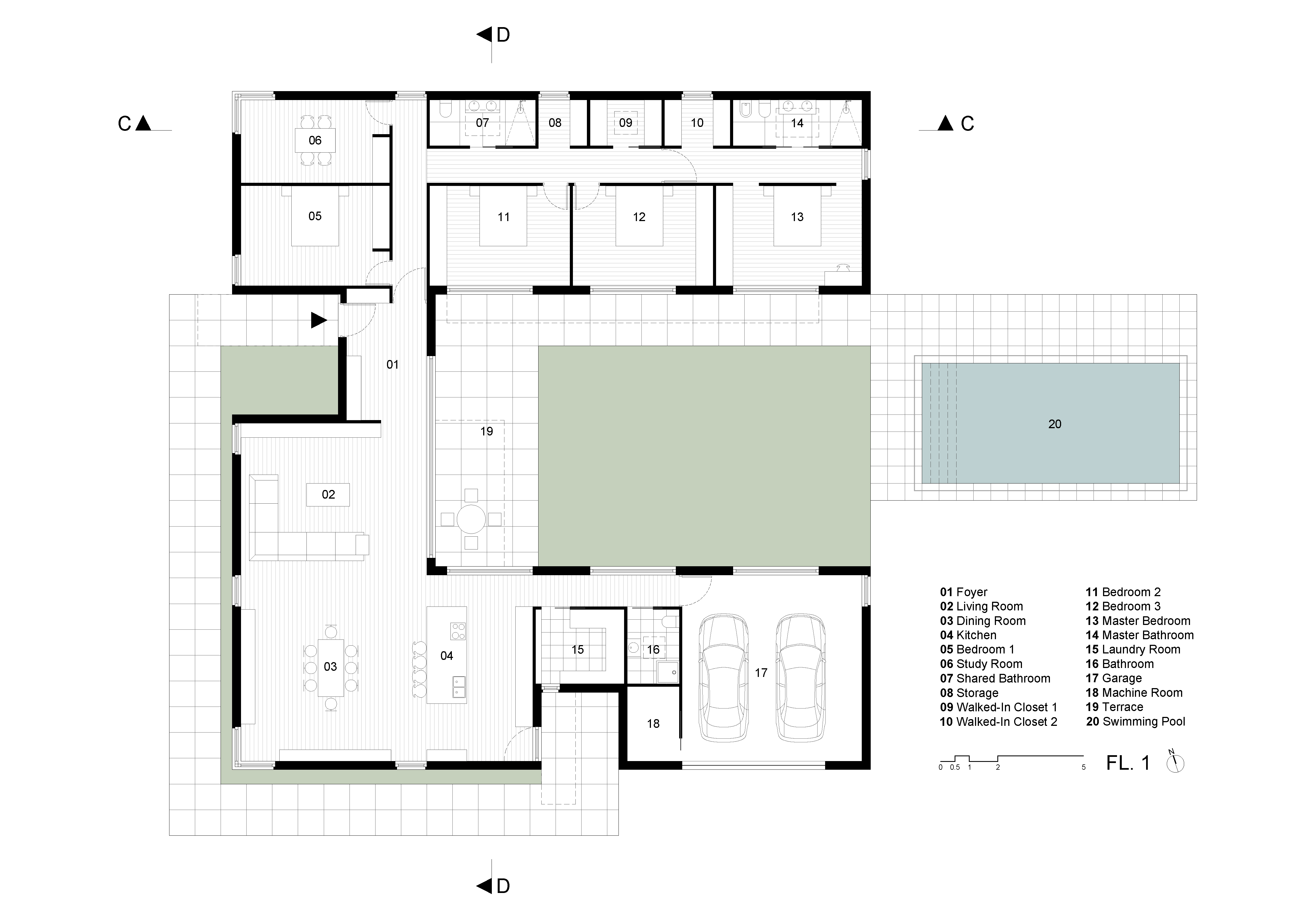 건물은 U자 형태로 깎여 내부에 프라이빗한 안뜰을 만들었고, 이는 대지 끝에 자리한 별동 수영장과 연결된다. 이러한 구성은 공간의 명확한 기능 분배를 가능하게 하며, 안뜰을 중심으로 생활공간이 감싸는 구조를 통해 사생활 보호와 햇빛 조절을 동시에 달성하였다. 매스는 두 개의 모서리 창을 통해 절제된 외형에 변화를 주며, 내부 공간의 특수성을 강조한다. 도로를 향한 입면에는 통제가 강화된 개구부를 두고, 마당을 향해서는 열린 시각적 관계를 구축하여 아침부터 저녁까지 공간마다 다양한 빛의 변화를 누릴 수 있게 한다.