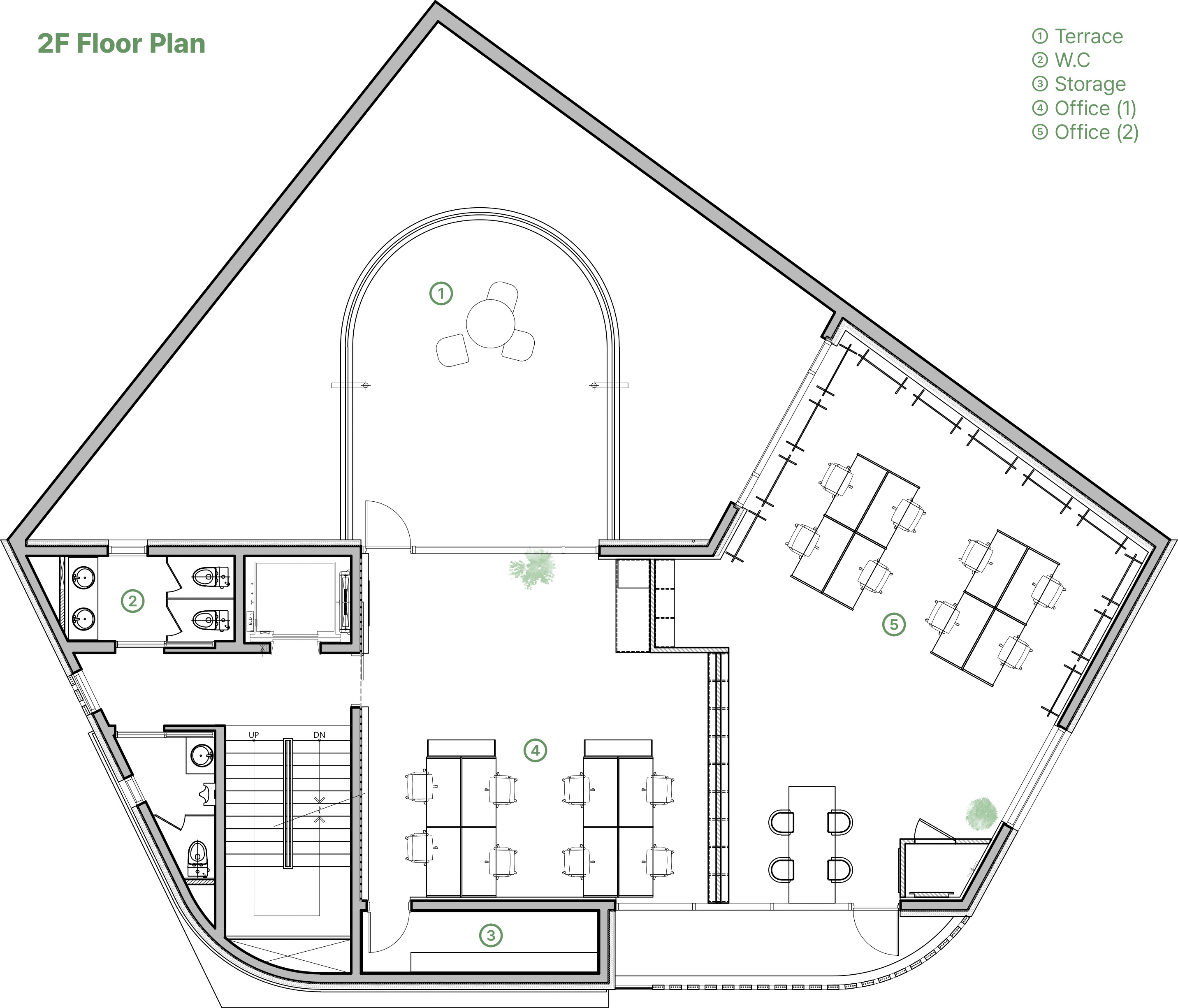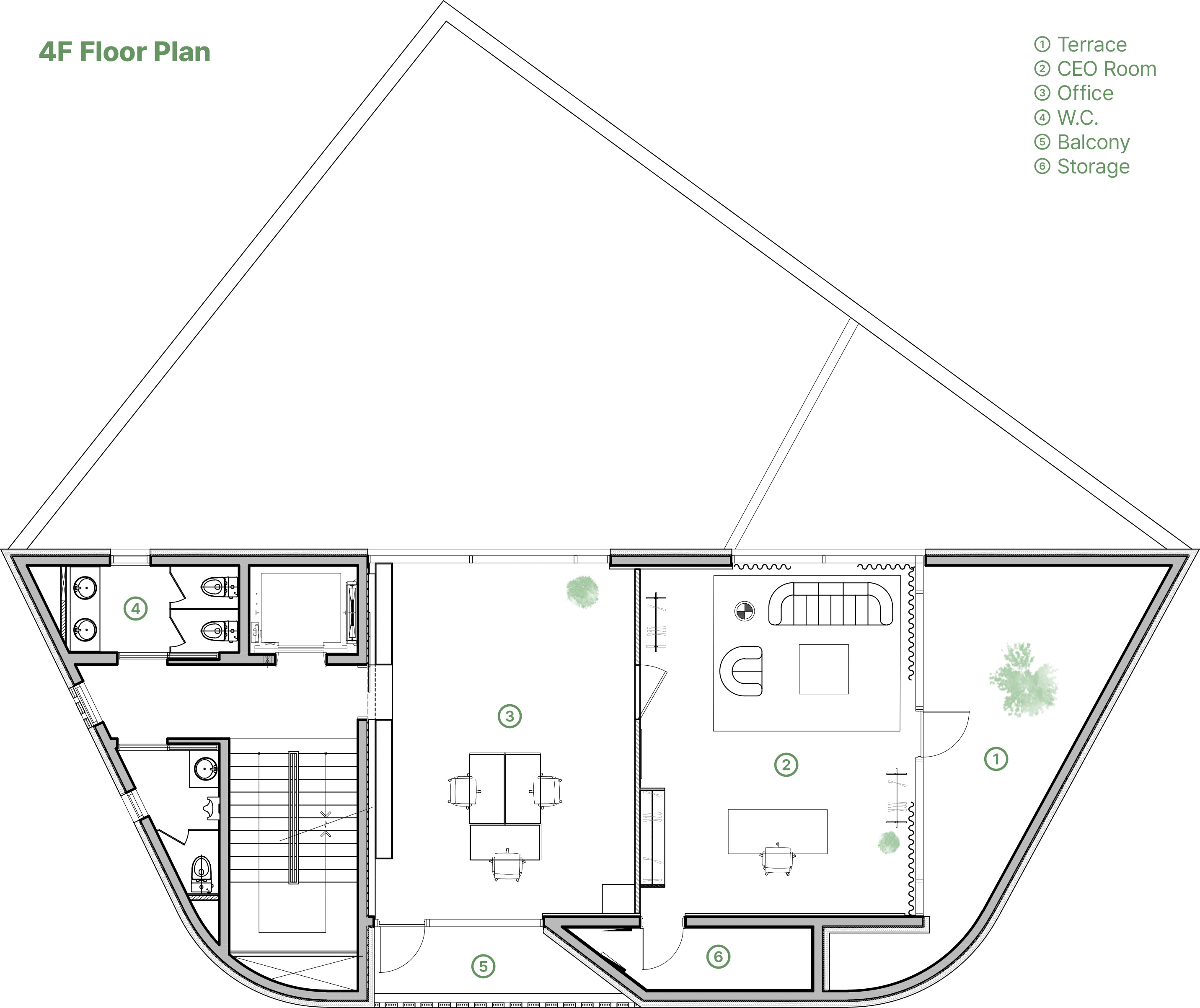 2층 오피스는 수납장에 타공 디자인을 적용해 공간을 나누면서도 시야를 확보했고, 3층 라운지는 노출 천장과 콘크리트 마감으로 편안한 분위기를 연출했다. 4층 CEO 사무실은 거울과 조명을 활용해 정제된 공간을 구성하고, 테라스와의 연결을 통해 휴식 공간을 확보했다. 전체 공간은 브랜드의 감성과 철학을 반영하여 설계되었다.