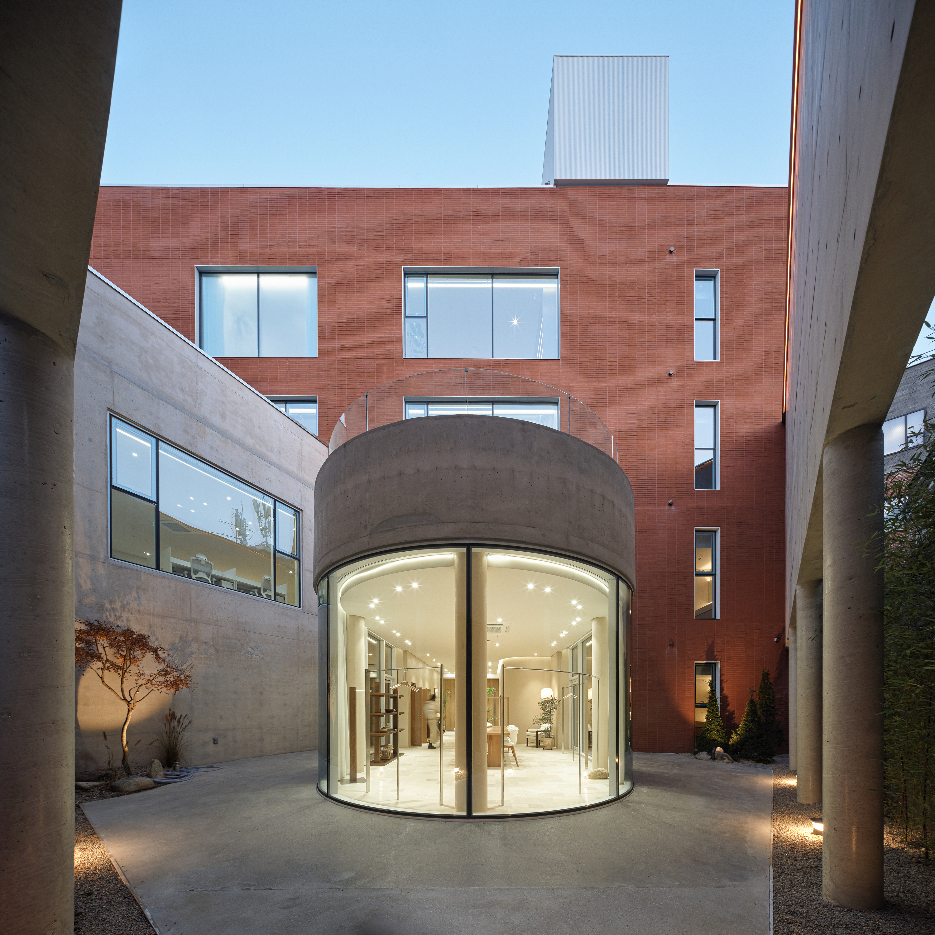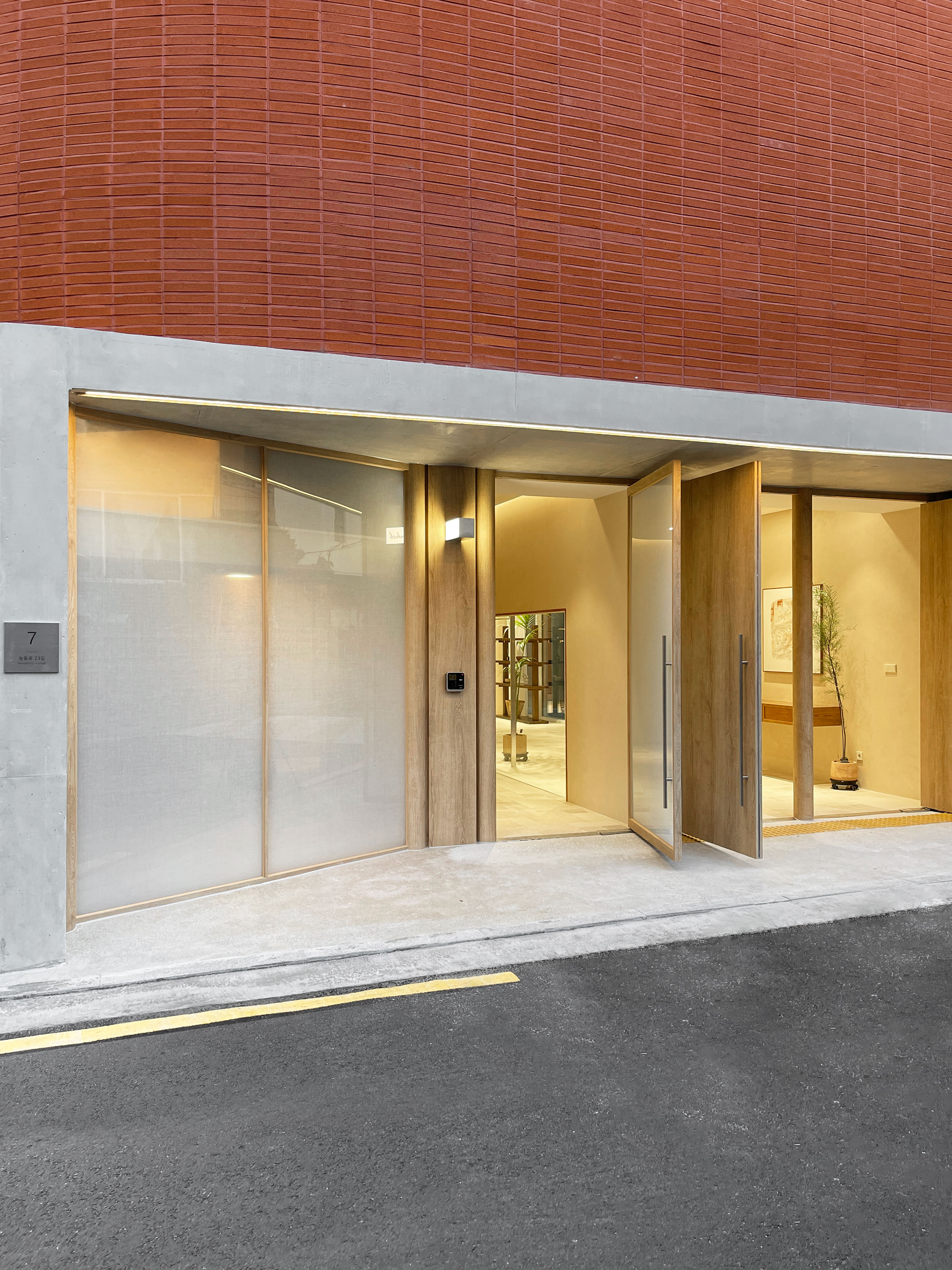 1층은 세 개의 출입구로 동선을 분리하고, 원목 도어와 유리 소재를 활용해 대비감 있는 파사드를 구현하였다. 내부는 뉴트럴 색조의 페인트와 애쉬우드를 사용하여 차분한 분위기를 조성하고, 불규칙 타일로 자연스러운 질감을 더했다. 원형 유리 쇼룸과 테라스를 통해 외부와의 시각적 연결을 유도했으며, 쇼룸 중앙에는 대형 테이블과 행거를 배치해 실용성과 전시 효과를 높였다.