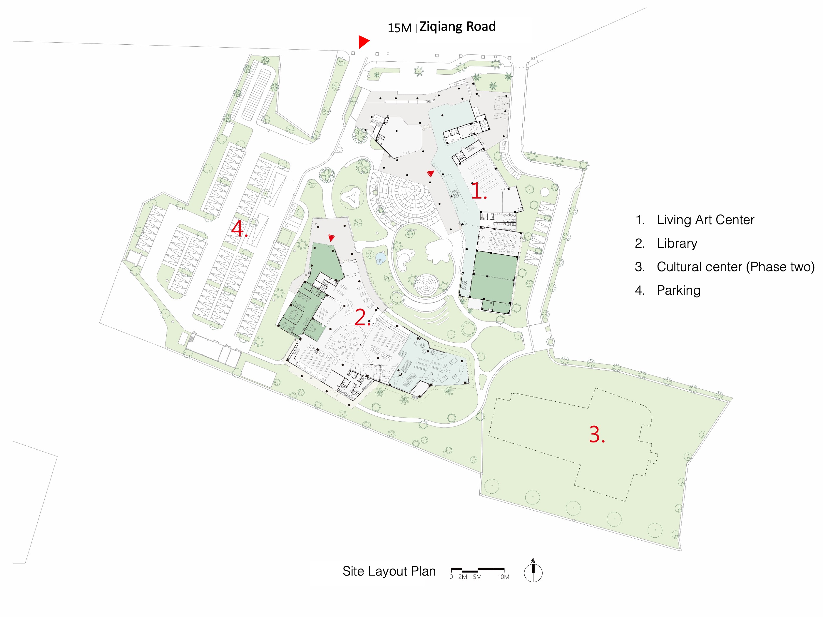 두 건물 사이에는 열린 광장이 마련되어 지역 주민들이 모이는 공간으로 활용되고 있다. 생활예술센터는 강의실 중심의 평생학습 공간으로, 내부 중정을 통해 빛과 그림자의 변화가 드러나는 구조로 설계되었다.