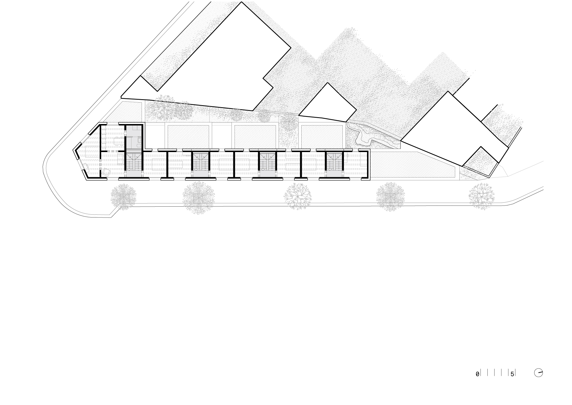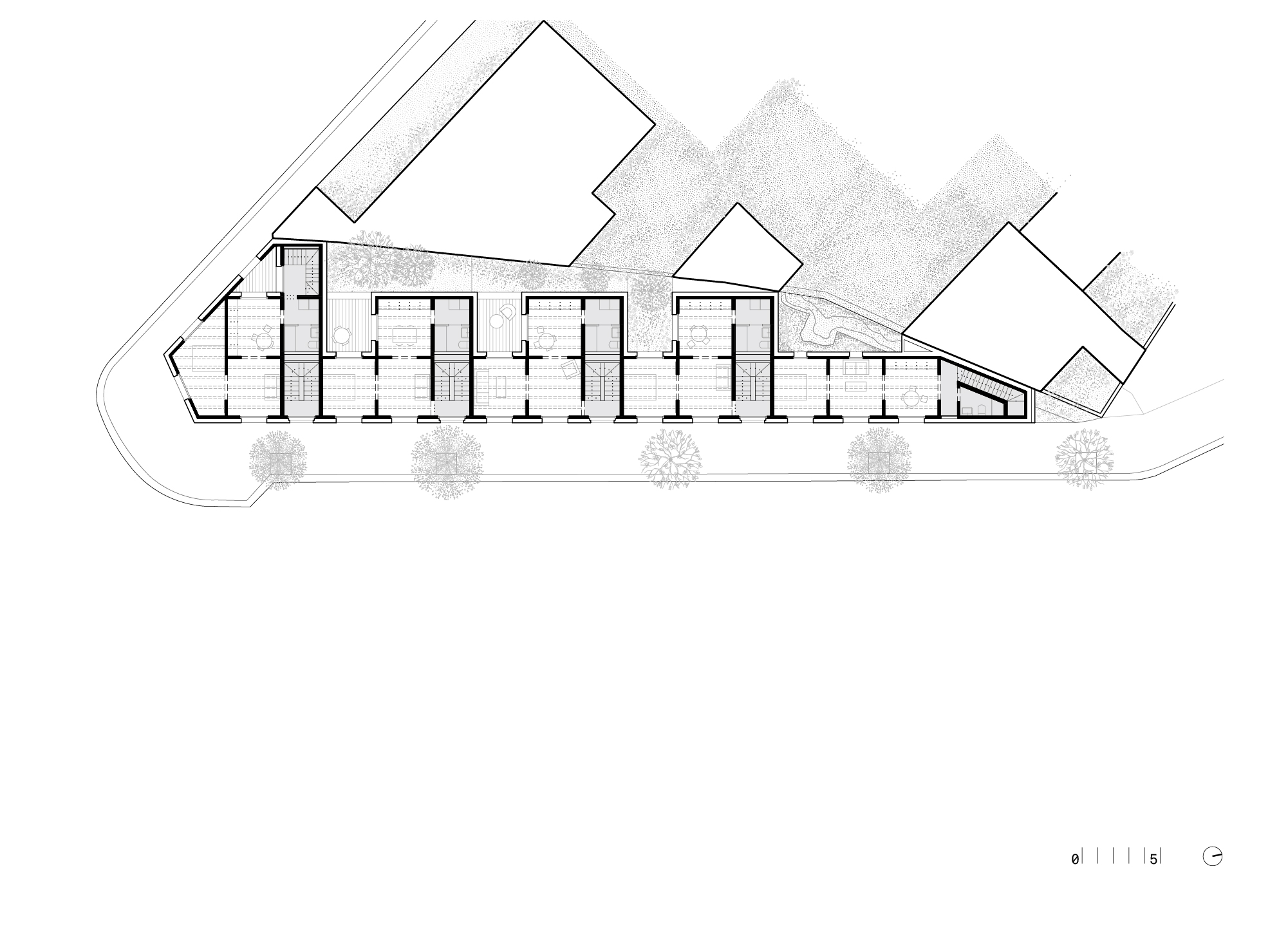 1층 유닛에는 투수성 재료를 사용해 마당을 포장하고, 2층 유닛에는 개별 테라스가 마련되었으며, 복도 없이 연결되는 평면 구성으로 실내 면적의 활용도를 높였다.