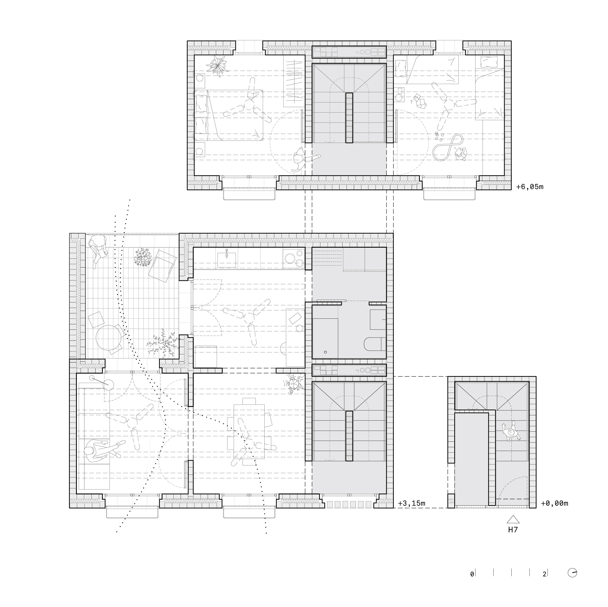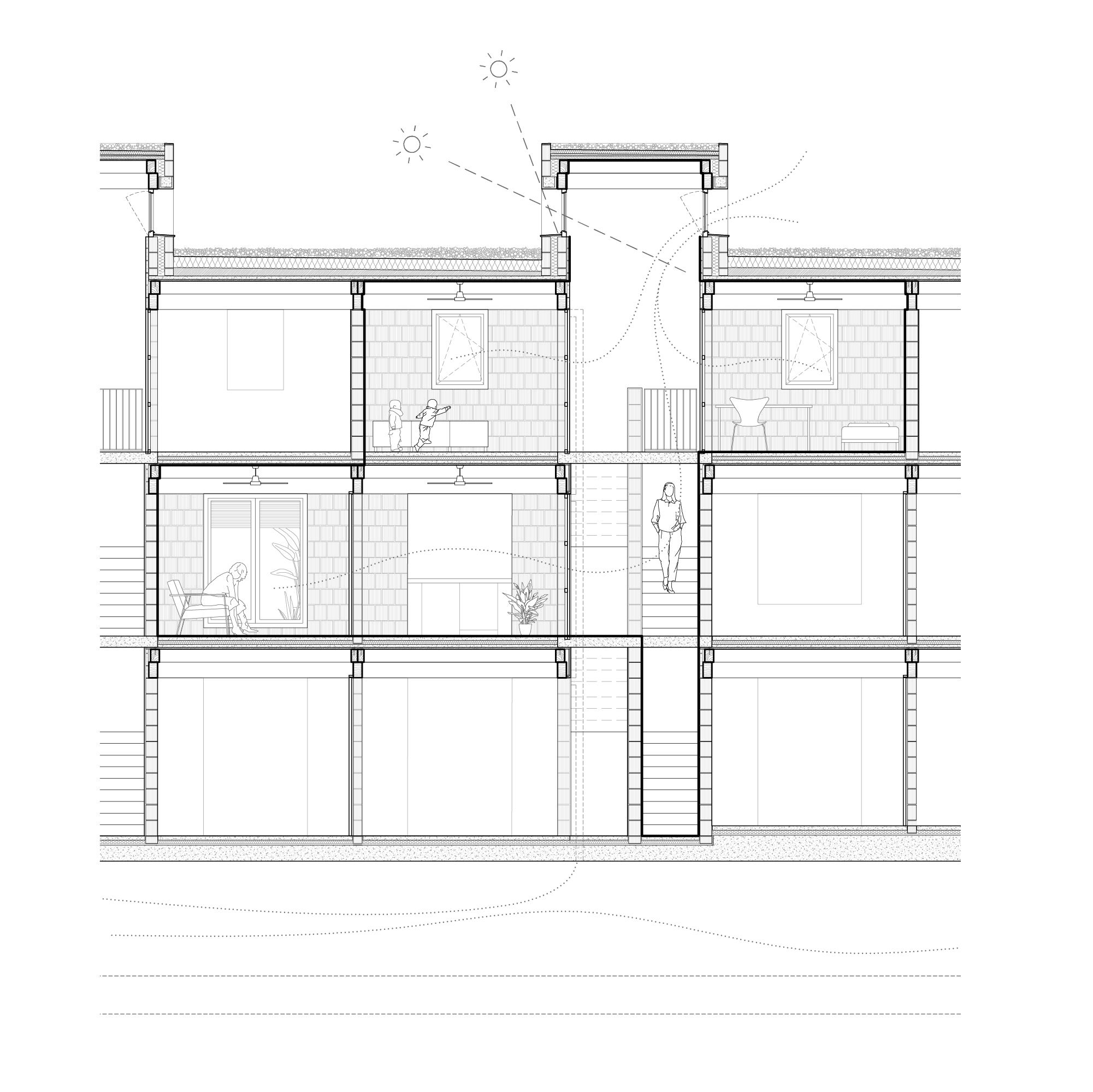1~3개의 침실로 구성된 기본형 유닛은 유연한 공간 활용이 가능하며, 주방은 배관 최적화를 위해 욕실과 인접하게 배치되었다. 맞통풍을 유도하는 창호 배치, 천창을 통한 열 배출, 후퇴된 서측 매스를 통한 직사광 차단 등 수동적 기후 전략을 도입하여 냉방 에너지를 절감했다. 또한 천장형 선풍기 외에는 기계식 냉방 설비가 필요 없을 정도로 쾌적한 환경이 구현되었다. 백색 석회 마감재는 외피 과열을 줄이고, 지하 갤러리는 기술 설비의 유지와 수동 냉방을 동시에 가능하게 했다. 구조는 지역산 점토 블록 내력벽과 프리패브 목재 슬래브로 구성되며, 토사를 충진한 벽체는 단열과 차음 성능을 향상시켰다. 모든 세대는 단독 출입이 가능하며, 엘리베이터 없이도 생활이 가능한 지속 가능한 테라스 하우스형 주거 모델을 제시한다.