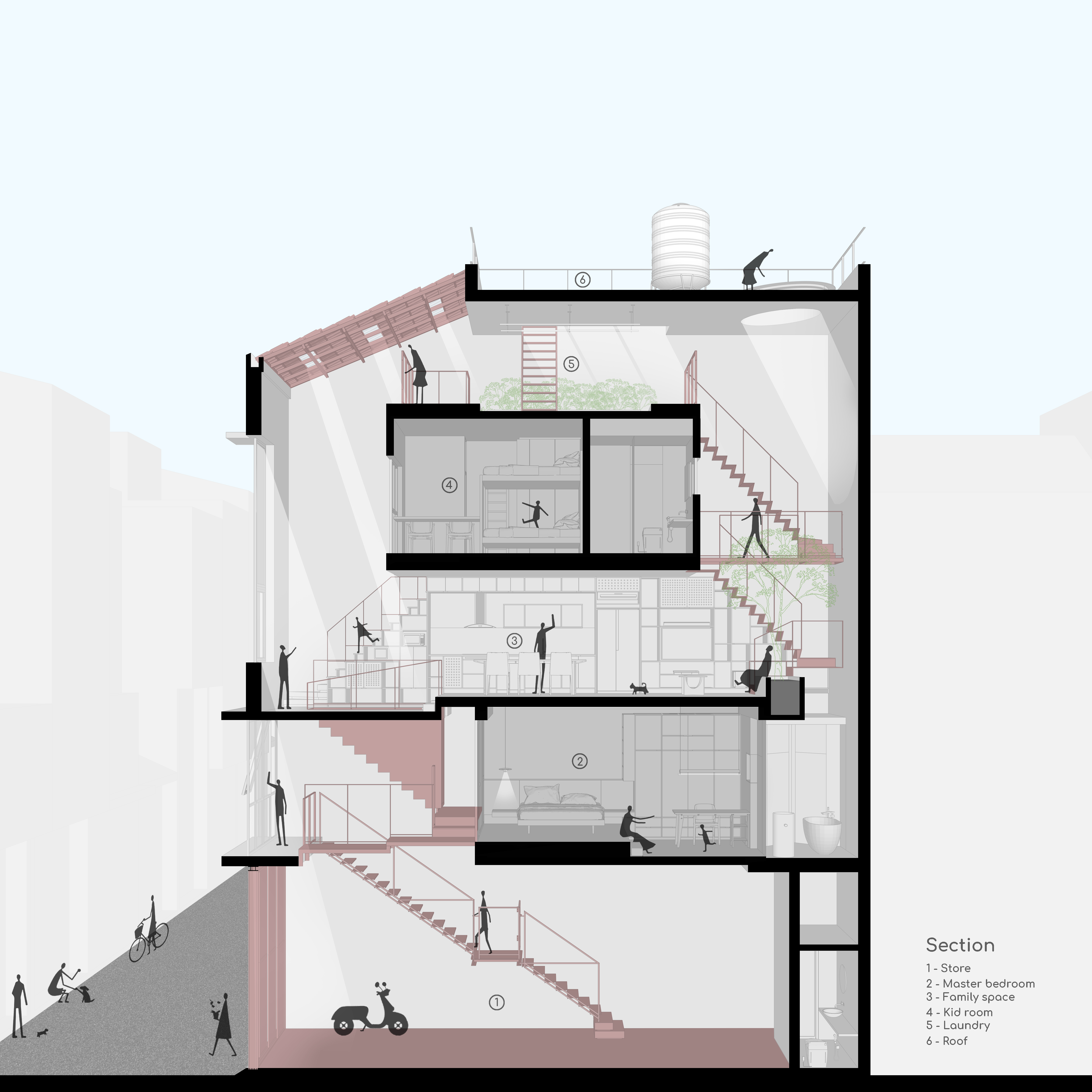 Quan Nhân 하우스는 하노이 Kẻ Mọc 지역의 오래된 Quan Nhân 마을에 위치한 주택으로, 급속한 도시 개발 속에서도 전통적 문화와 역사성을 간직한 장소에 자리한다. 이 건물은 생활 공간과 임대 공간으로 구성되며, 번화한 상업 지역 내에 위치해 소음과 먼지를 피하기 위해 생활 공간은 일정 높이로 올려 배치되었다.