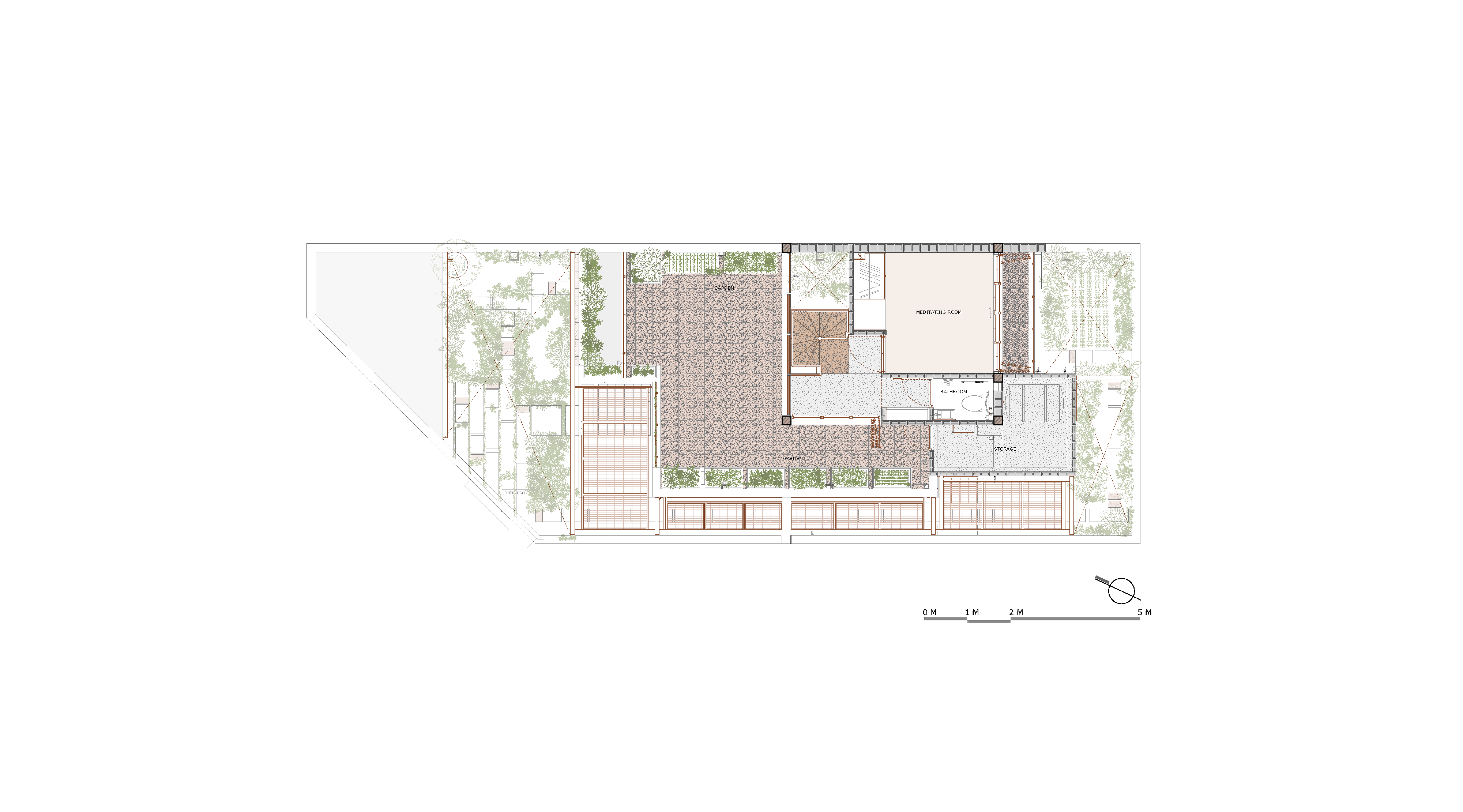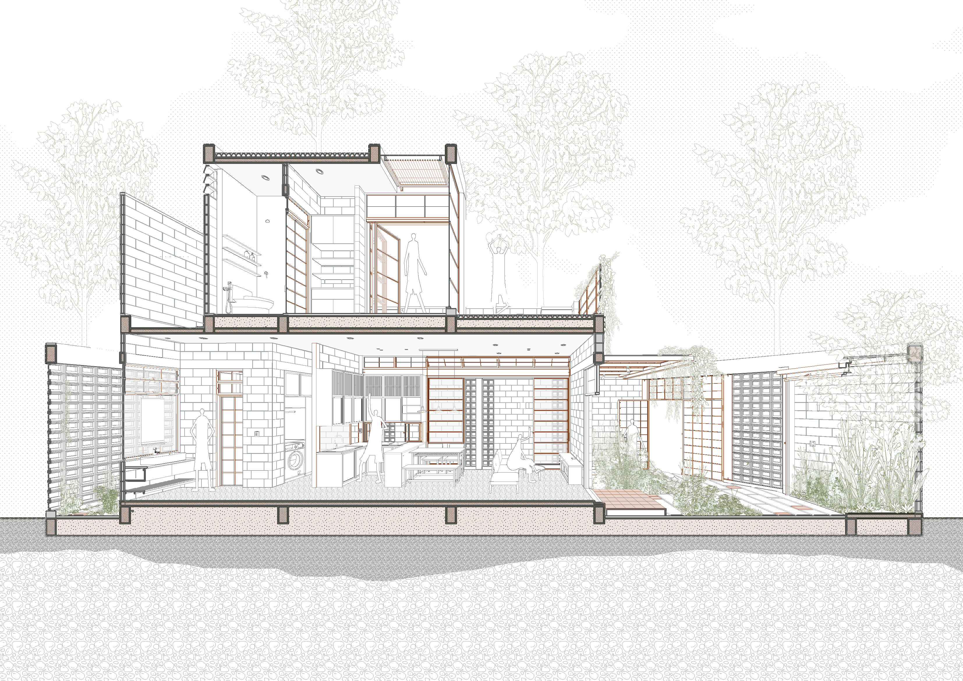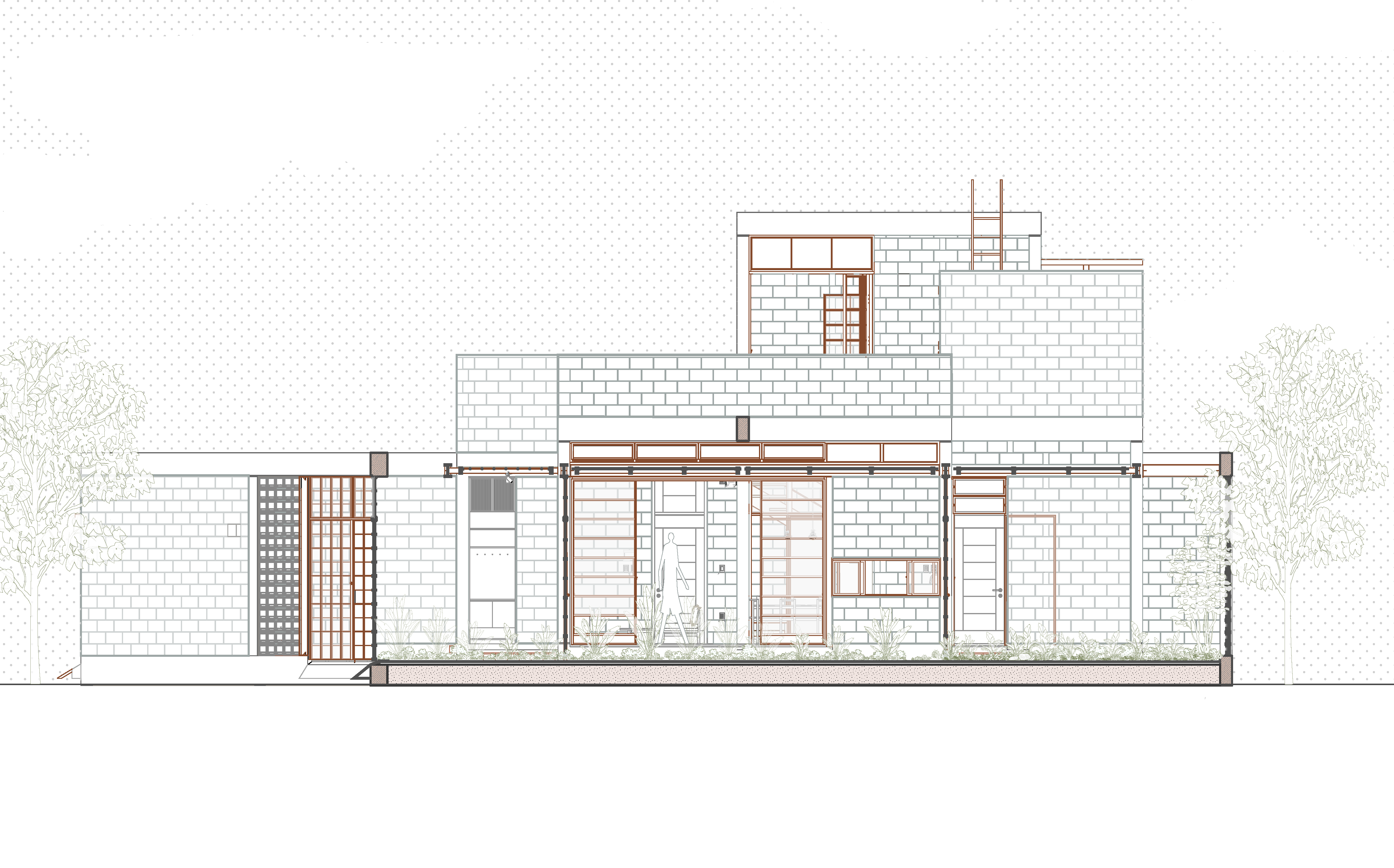 설계는 다섯 가지 전략을 중심으로 전개되었다. 첫째, 지역의 미기후에 대응하고 채소밭과 과일나무를 조경에 통합한 적응형 건축 전략을 통해 생태적 삶을 유도했다. 둘째, 베란다, 복도, 안마당과 같은 완충 공간을 적극 도입해 실내외를 자연스럽게 연결하고, 공기 흐름과 자연광을 조절하며 사생활과 보안을 동시에 확보했다. 셋째, 단순하고 효율적인 구조로 자재 사용을 줄이고, 유연하고 지속 가능한 공간을 실현했다. 넷째, 지역 재료를 활용해 건축비를 절감하고 공정 기간을 단축했으며, 지역 장인의 기술과도 연결되도록 했다. 다섯째, 이 집은 주거와 업무 공간을 넘어서 명상과 자연 속 쉼터의 기능도 수행하도록 구성되었으며, 물질적 삶과 정신적 삶 사이의 균형을 지향했다. 이러한 철학은 필수적 생활을 충족하면서도 환경적 영향을 줄이고, 작지만 자립 가능한 생태적 거주 모델로 실현되었다.