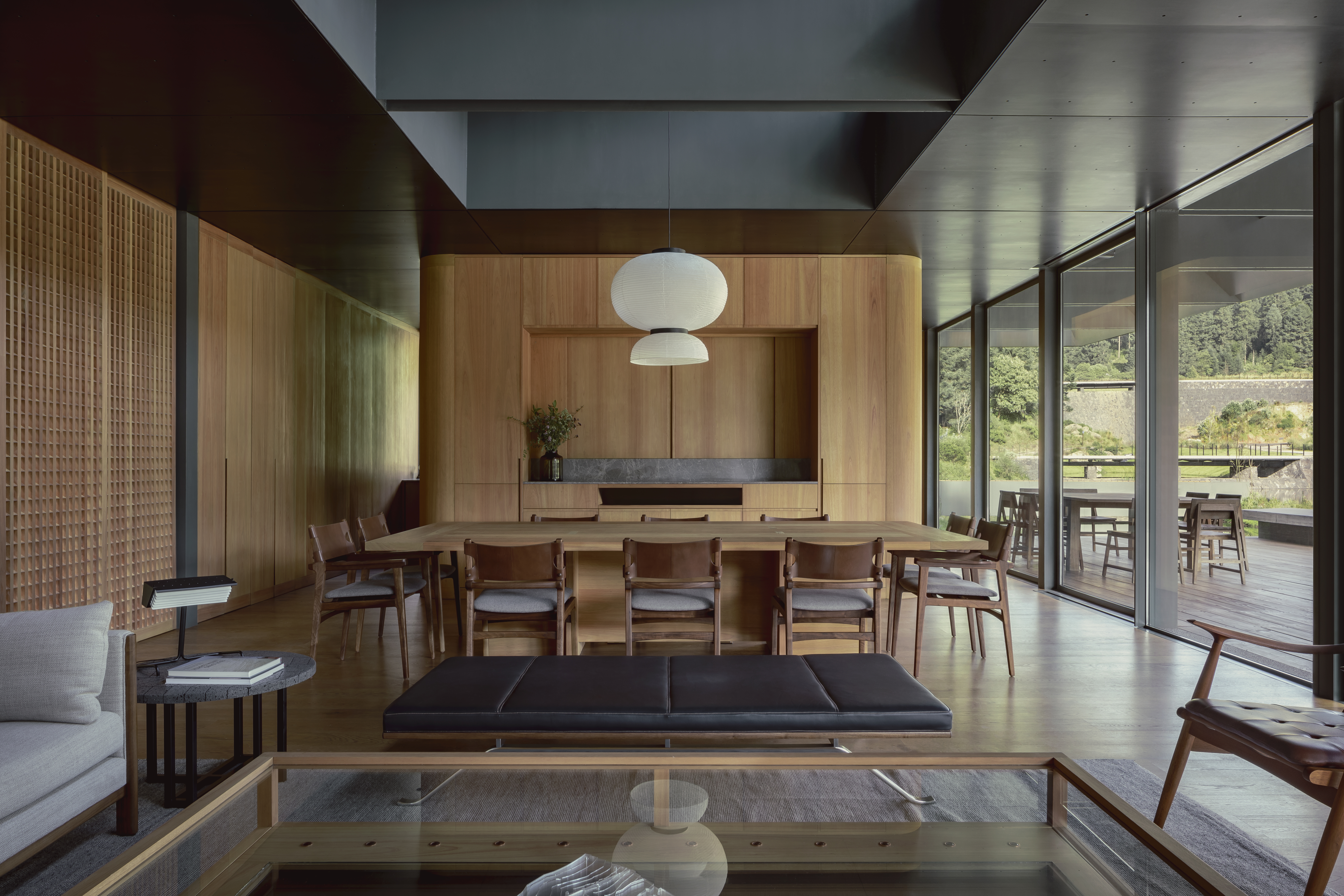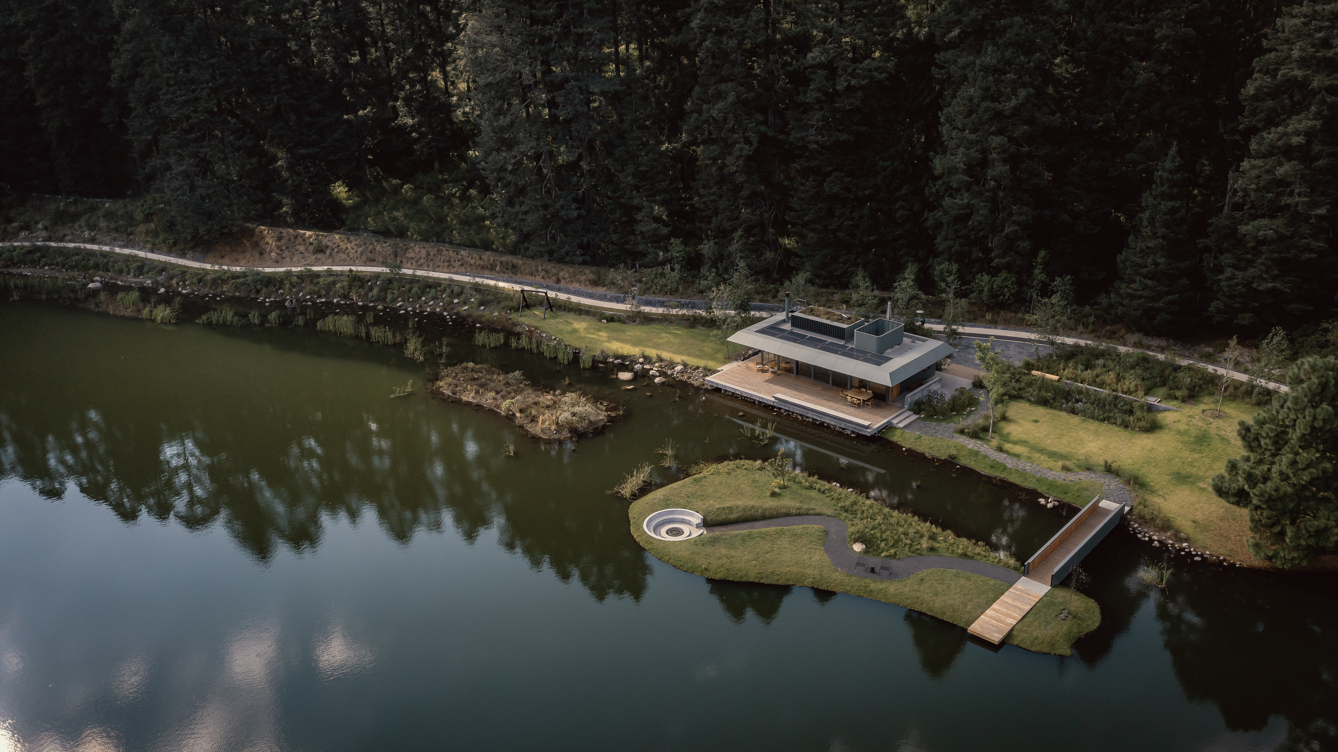 회색빛 구조와 외부로 길게 뻗은 처마는 건축물을 자연의 배경 속에 조용히 스며들게 하며, 주변 일곱 개의 호수에서 영감을 받은 공간 구성은 지역 토착 문화의 세계관을 현대적으로 풀어낸 결과물이다.