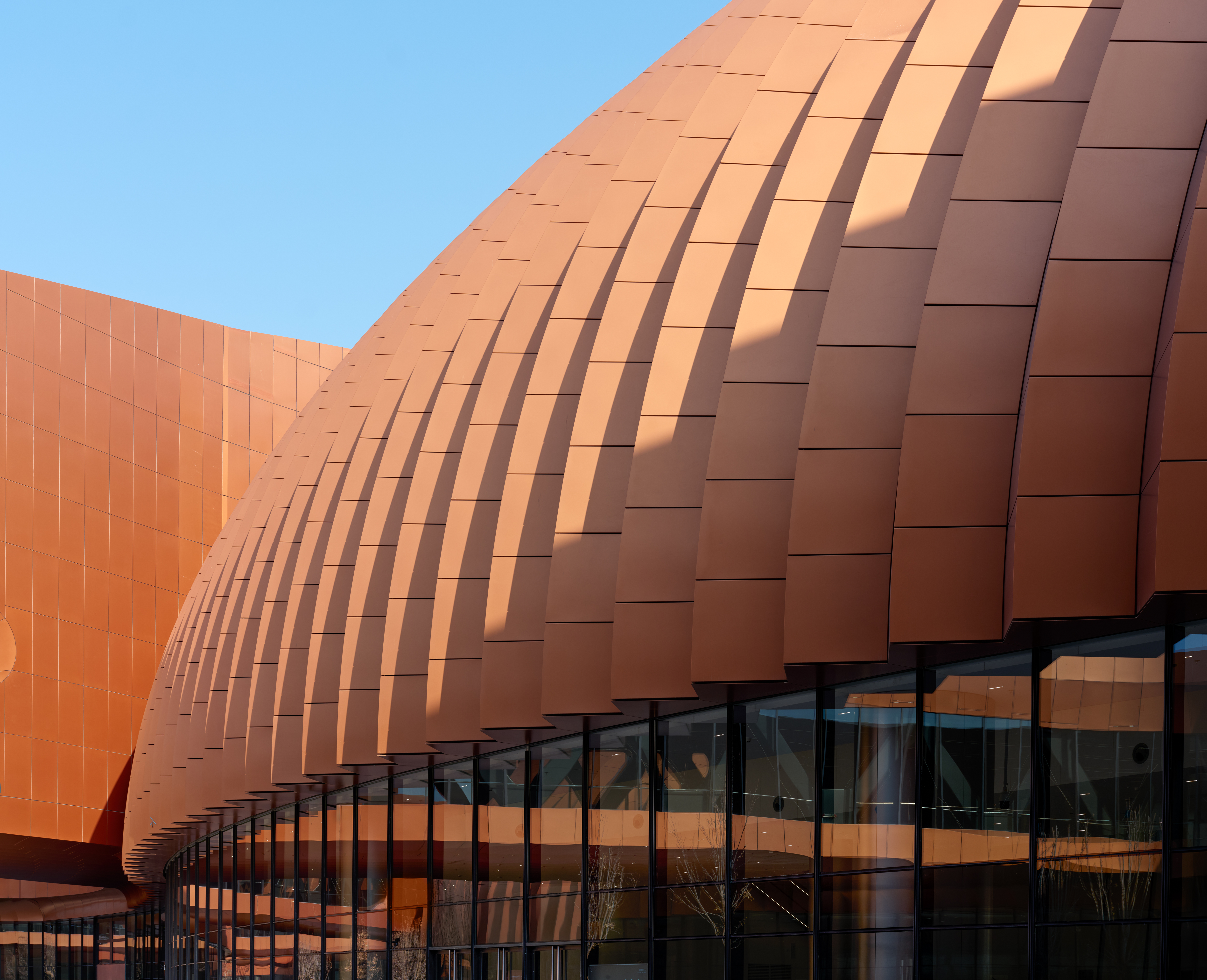 전시장은 남북으로 길게 배치되어 있으며, 이 축을 따라 조경이 구성된 야외 행사 공간과 중앙 마당이 형성되었다. 전시장과 회의장, 호텔은 중앙 브리지로 연결되어 실내 이동이 용이하며, 북측 공공 광장은 주요 행사 공간으로 활용된다. 사람, 물류, 차량의 동선을 분리해 공간 운영의 유연성을 확보했으며, 다양한 행사 진행 시 간섭을 줄이는 구조로 설계되었다. 건물은 대칭형 지붕 구조를 통해 기둥 없는 넓은 전시 공간을 제공하고, 곡선 형태의 입면과 깊은 금속 색조의 외장은 대규모 시설의 위압감을 완화한다. 전체 공간은 자연 채광과 통풍을 유도하고, 녹지와 연결된 구조를 통해 도시 내 자연과의 조화를 추구한다.