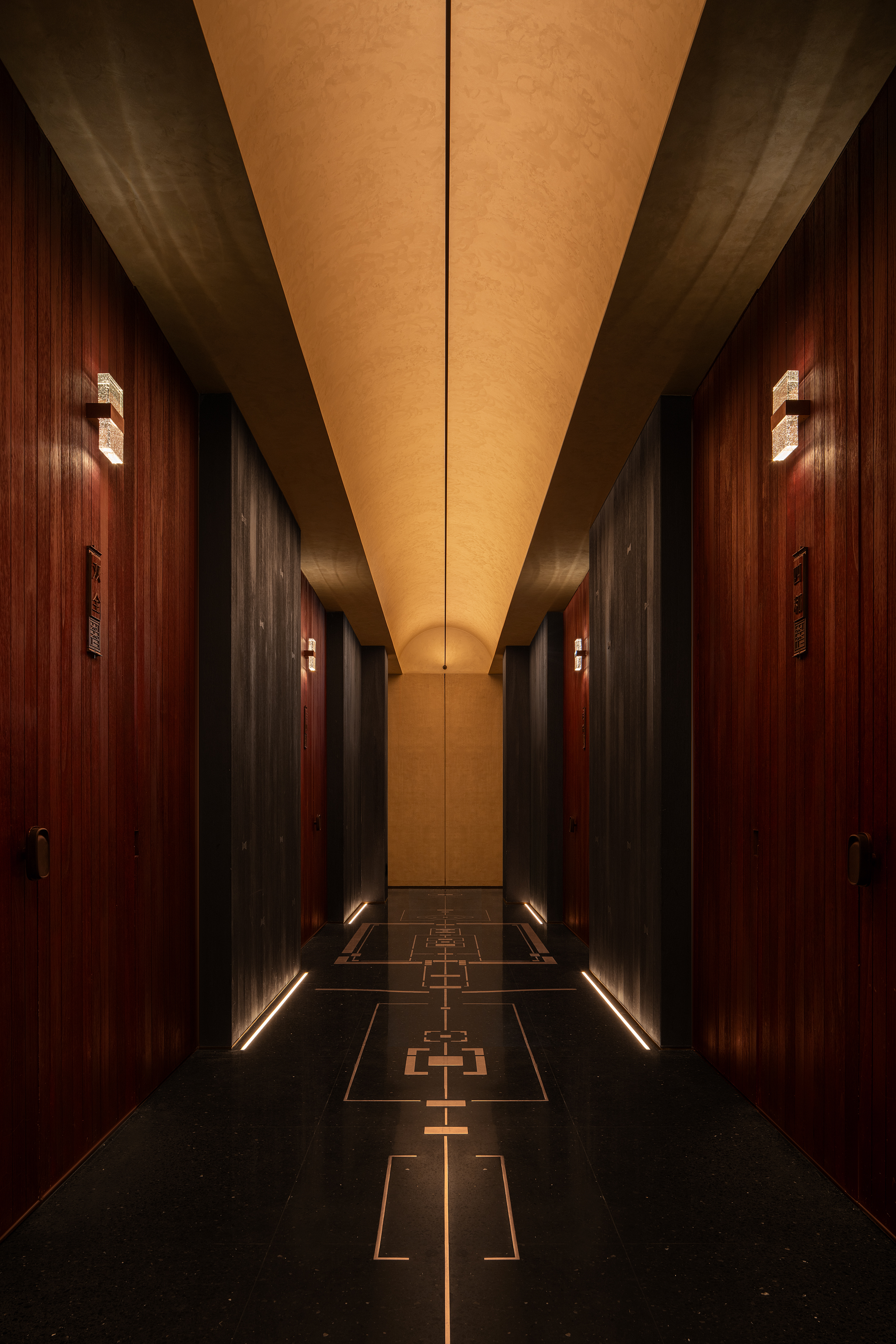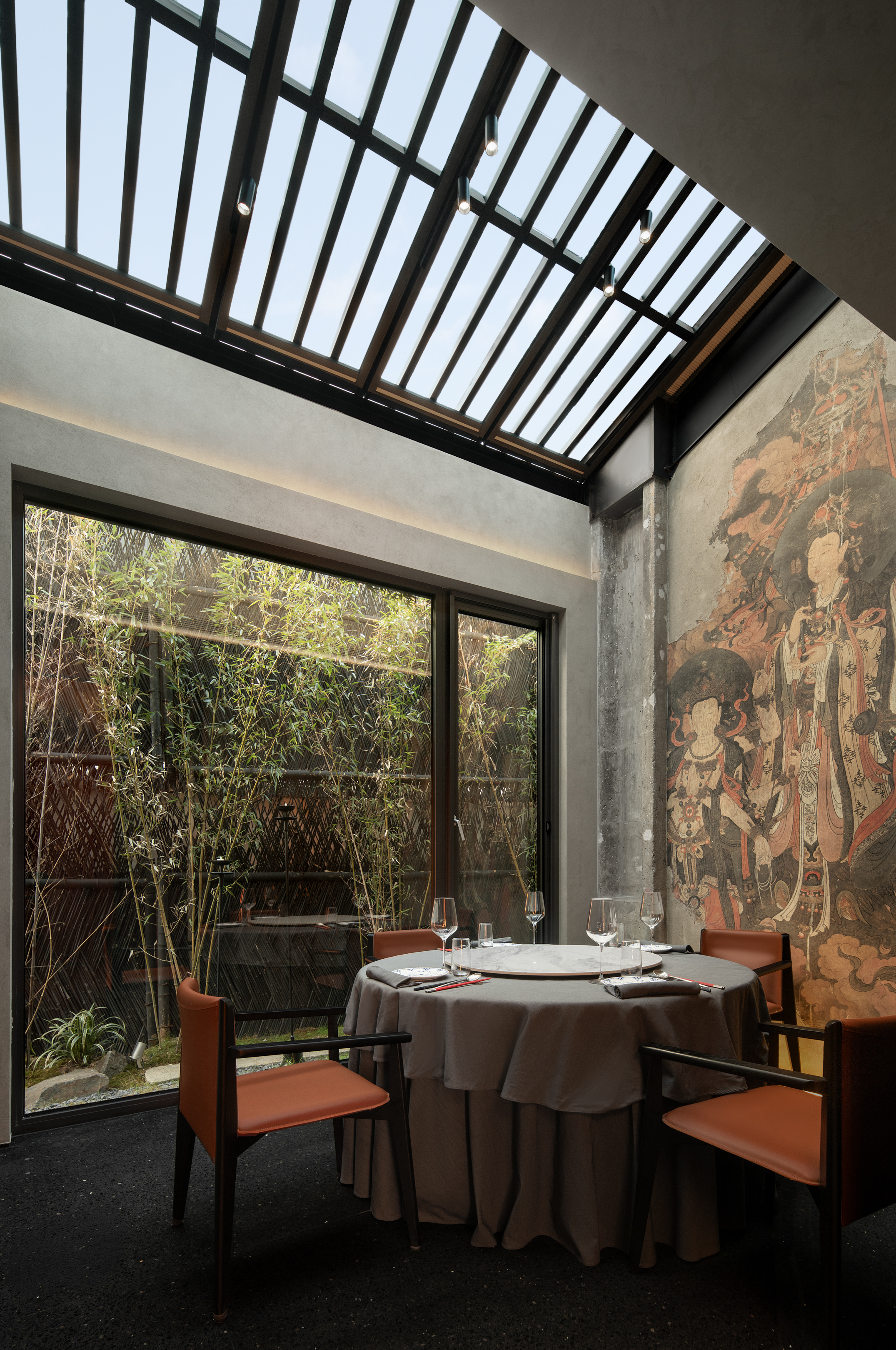 내부 전반적으로 소박하고 자연스러운 질감이 강조되는 한편, 명나라 벽화나 전통 가구를 활용하여 과거와 현재의 느낌이 공존하는 공간으로 조성했다. 특히, 대형 프라이빗 룸은 복도의 의례적인 패턴부터 황실에서 사용하던 황색과 적색을 주요 컬러로 사용하여 명상적인 분위기를 연출하고, 베이징의 문화적인 연속성과 미적인 정체성을 담아냈다.