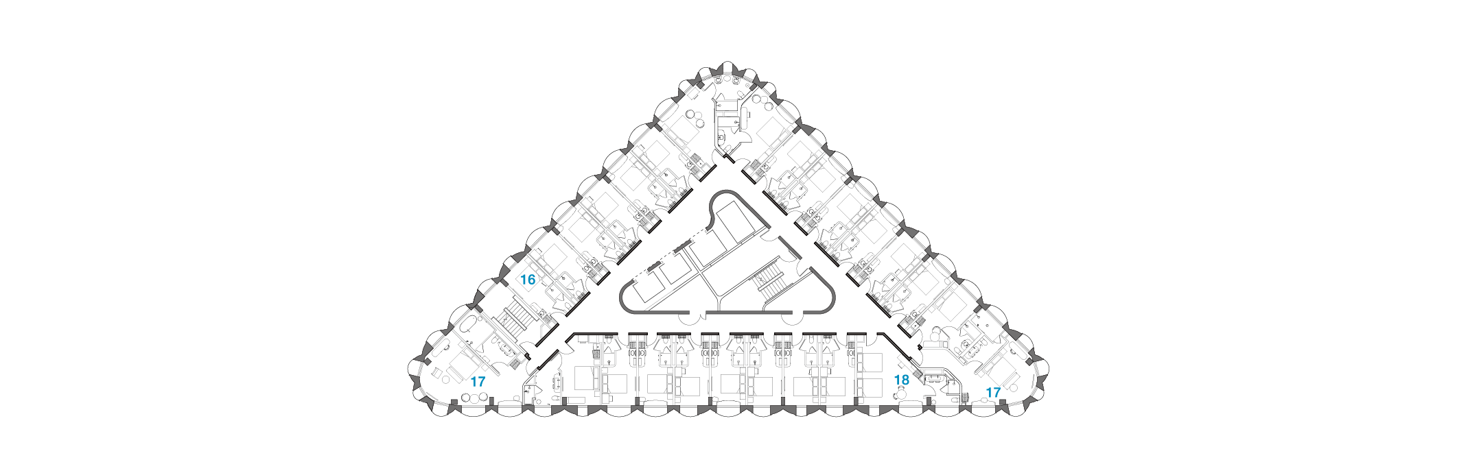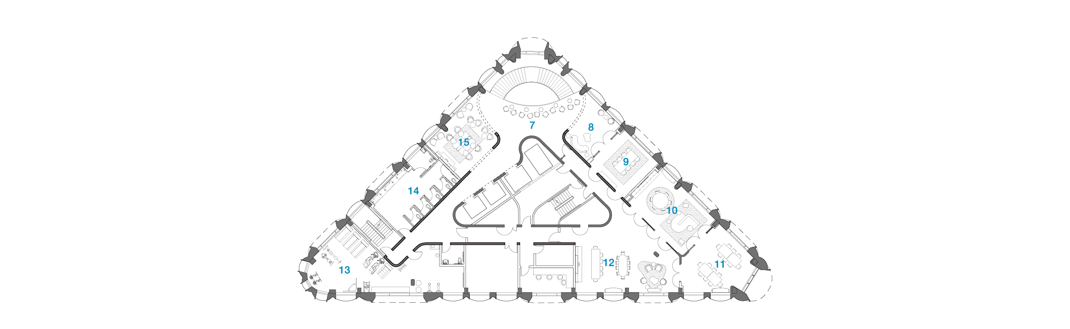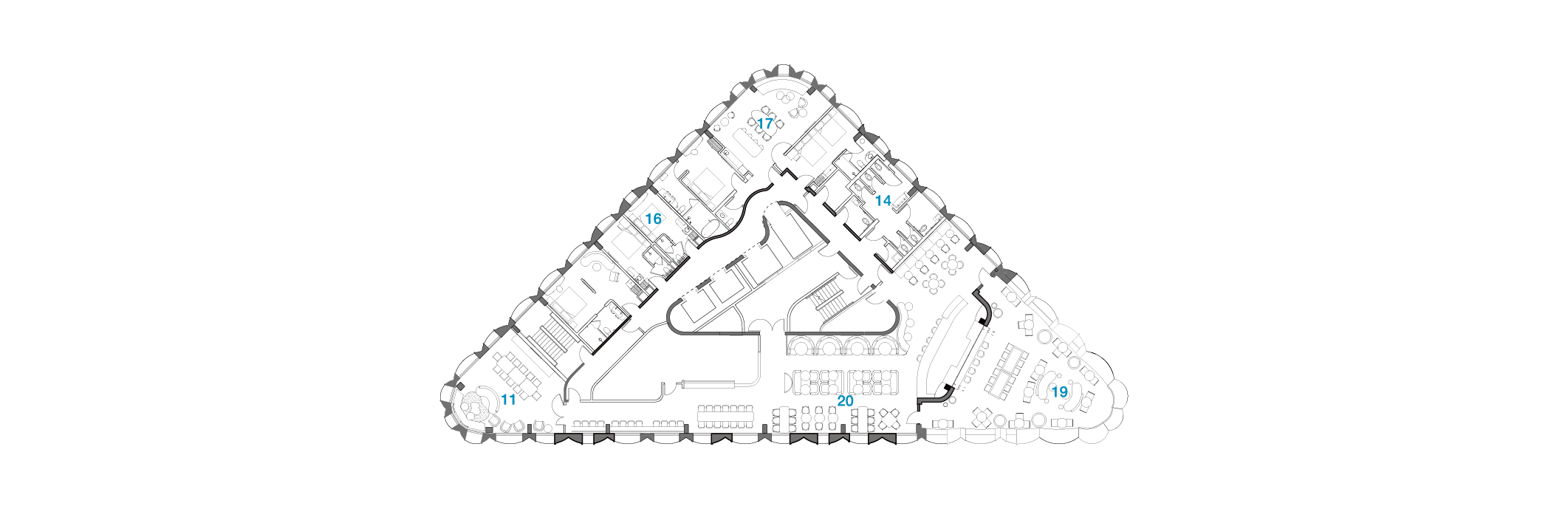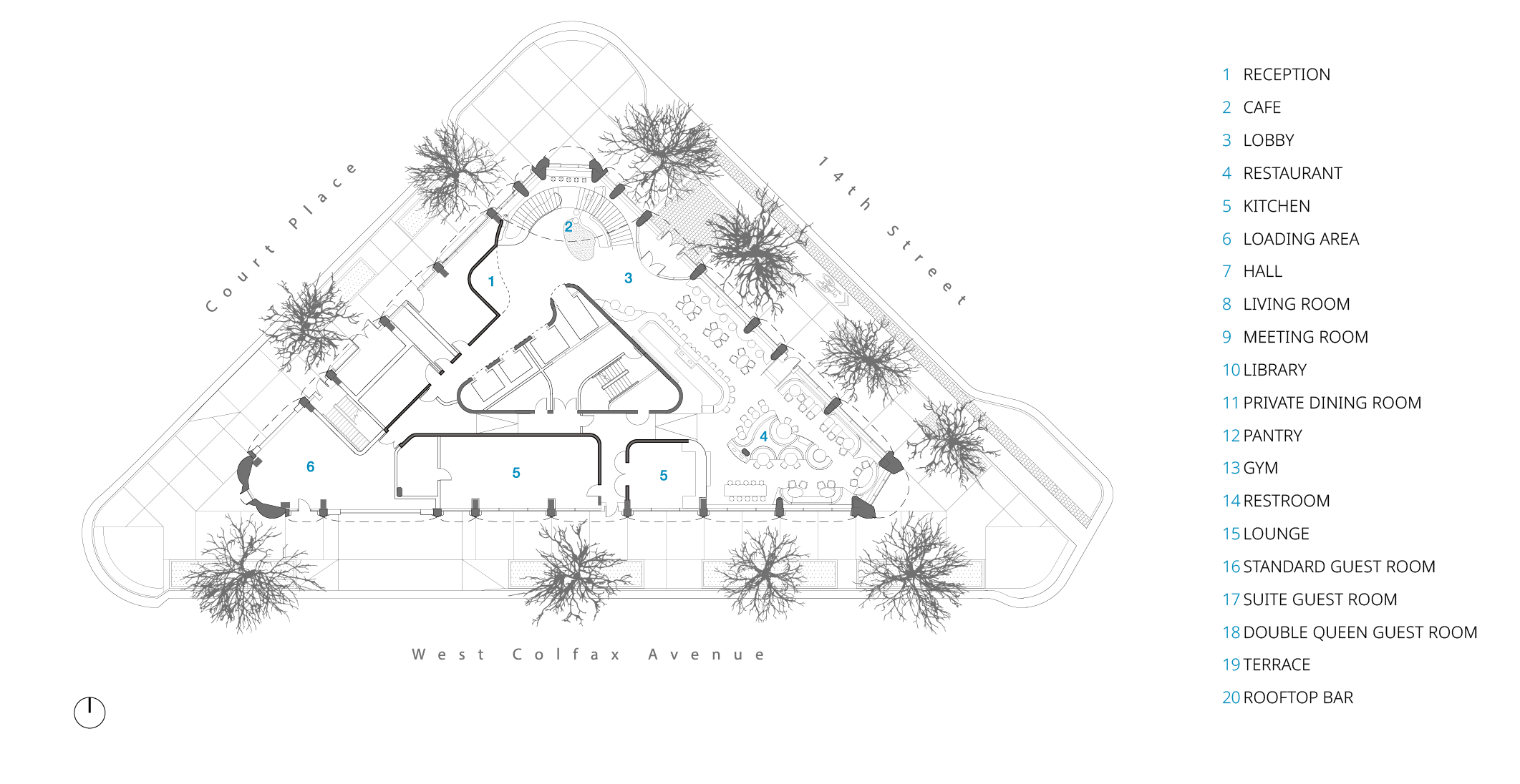 1층의 로비는 올데이 다이닝 레스토랑과 커피 바와 연결되어 있으며, 2층에는 피트니스 센터, 라운지, 이벤트 공간이 마련되어 있다. 최상층에는 호텔 투숙객과 일반 방문객 모두 이용할 수 있는 루프톱이 있고, 야외 바와 테라스에서 덴버의 스카이라인과 산맥의 경관을 즐길 수 있다. 건물은 삼각형 형태의 협소한 부지를 최대한 활용하여 공간을 최적화했다. 건물의 콘크리트 구조물에는 플라이 애시를 포함하여 시멘트 사용량을 줄이고 공사 과정에서 발생하는 탄소 배출을 최소화했다. 덴버의 기후에 맞춰 효율적으로 설계된 창문의 외부 차양은 실내 공간을 그늘지게 하면서 빗물을 자연스럽게 유도한다. 내부는 건축 구조를 그대로 노출시켜 마감재 사용을 줄였으며, 사용된 마감재는 재활용 비율이 높은 소재를 우선적으로 채택했다. 또한, 최상층에는 녹색 지붕을 조성하여 지역 생태계를 지원하고, 도시 생물다양성을 향상시킨다.