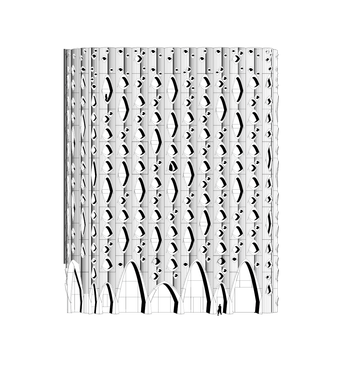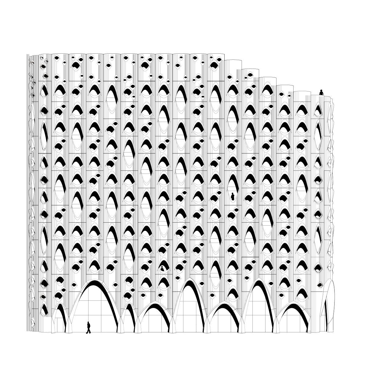 파사드의 가장 특징적인 요소는 독특한 창문 디자인으로, 미국 아스펜 나무(Populus tremuloides)의 표면 패턴에서 영감을 받았다. 각 창문은 아스펜 나무가 성장하면서 가지를 떨어뜨린 후 남는 눈 모양의 흔적을 연상시킨다. 창문의 크기와 형태는 공공 공간과 개인 공간에 따라 변화하며, 1층 입구에는 높이가 9m에 이르는 창문이 배치되어 호텔 내부와 도시 풍경을 연결하고 보행 친화적인 환경을 조성한다. 상층부 객실에서는 덴버 주 의사당, 시빅 센터 공원, 로키산맥의 탁 트인 전망을 감상할 수 있다. 포퓰러스 호텔은 총 12,500.00㎡ 규모로, 265개의 객실을 갖추고 있다.