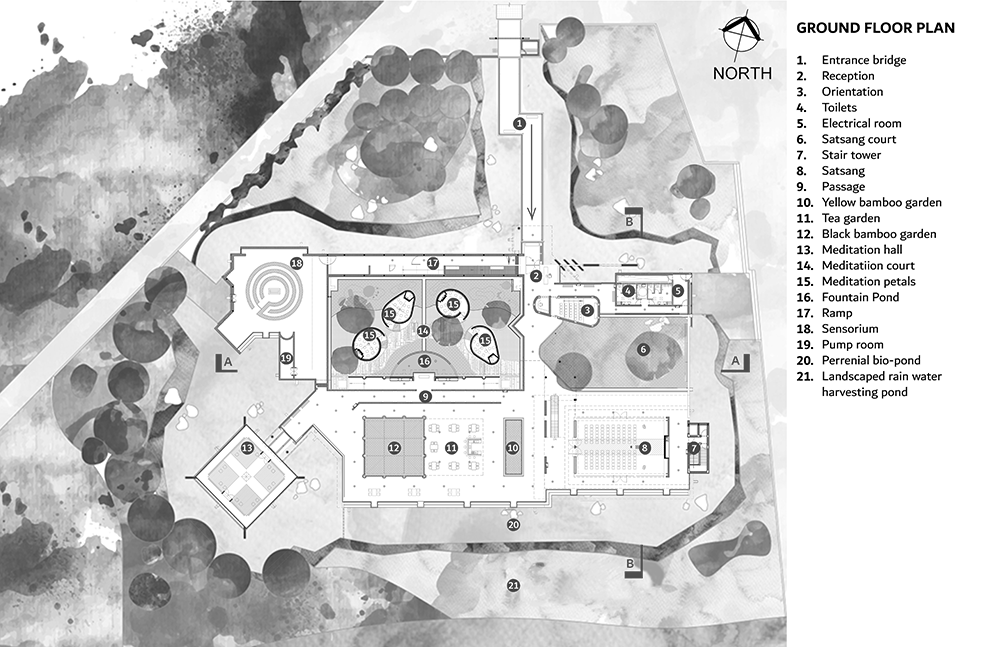 건축가는 자연의 다섯 가지 요소를 통합하여 안뜰, 생태 연못, 벽돌과 유리, 콘크리트를 조화롭게 결합했고, 빗물 수집 시스템과 자생 식물 등을 통해 저지대 환경과의 조화를 고려했다. 주요 공간으로는 선 정원이 조성된 중정, 감각적 경험을 위한 공간, 연못 위에 떠 있는 명상 공간 등이 있으며, 꽃잎 모양의 명상실은 각각 '더 마더'의 성품에서 영감을 받아 설계되었다.