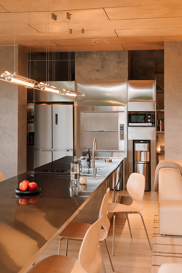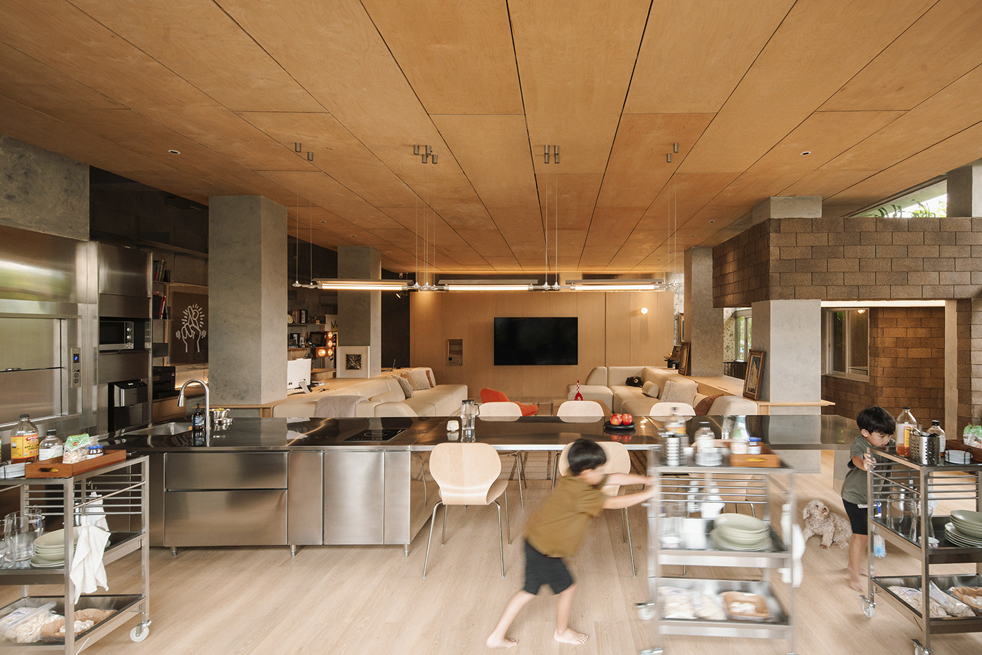 동선을 방해하는 요소를 최소화하고, 가구 배치를 통해 구조와 자연, 빛과 그림자의 관계가 유기적으로 연결되도록 했다. 재료는 자작나무 합판과 전통적인 마감재를 사용하였으며, 주방 공간만 스테인리스로 처리되어 명확한 대비를 이룬다.