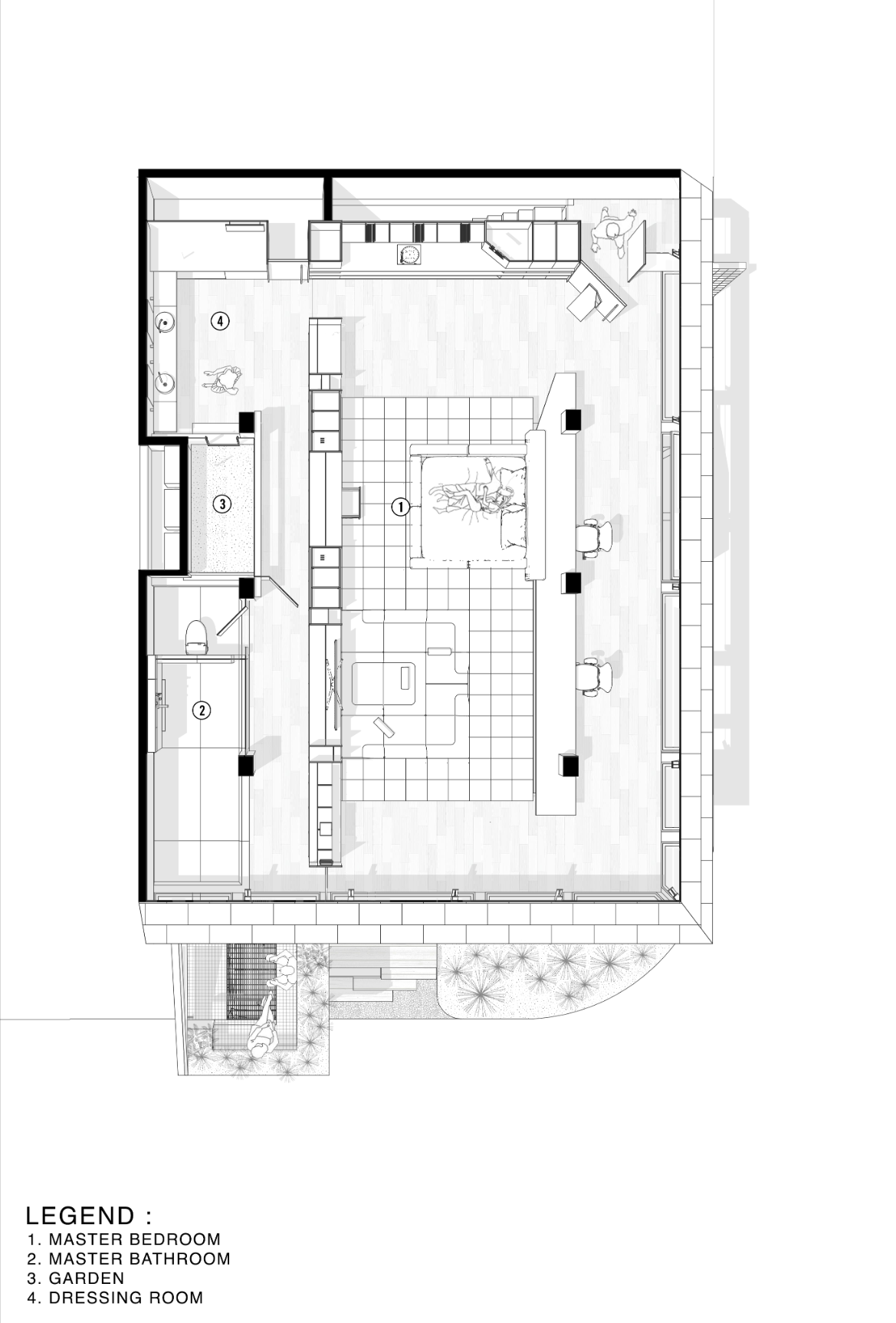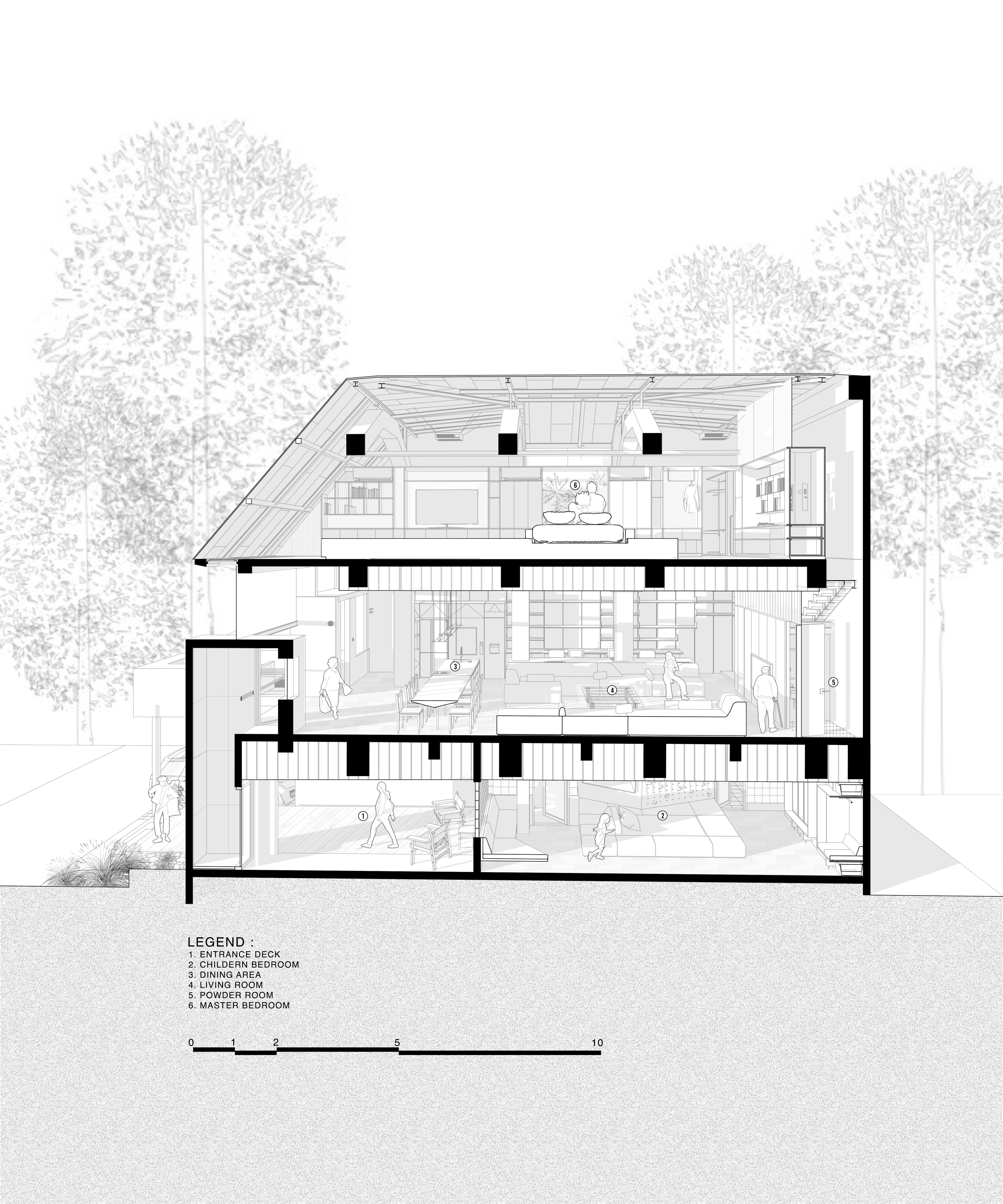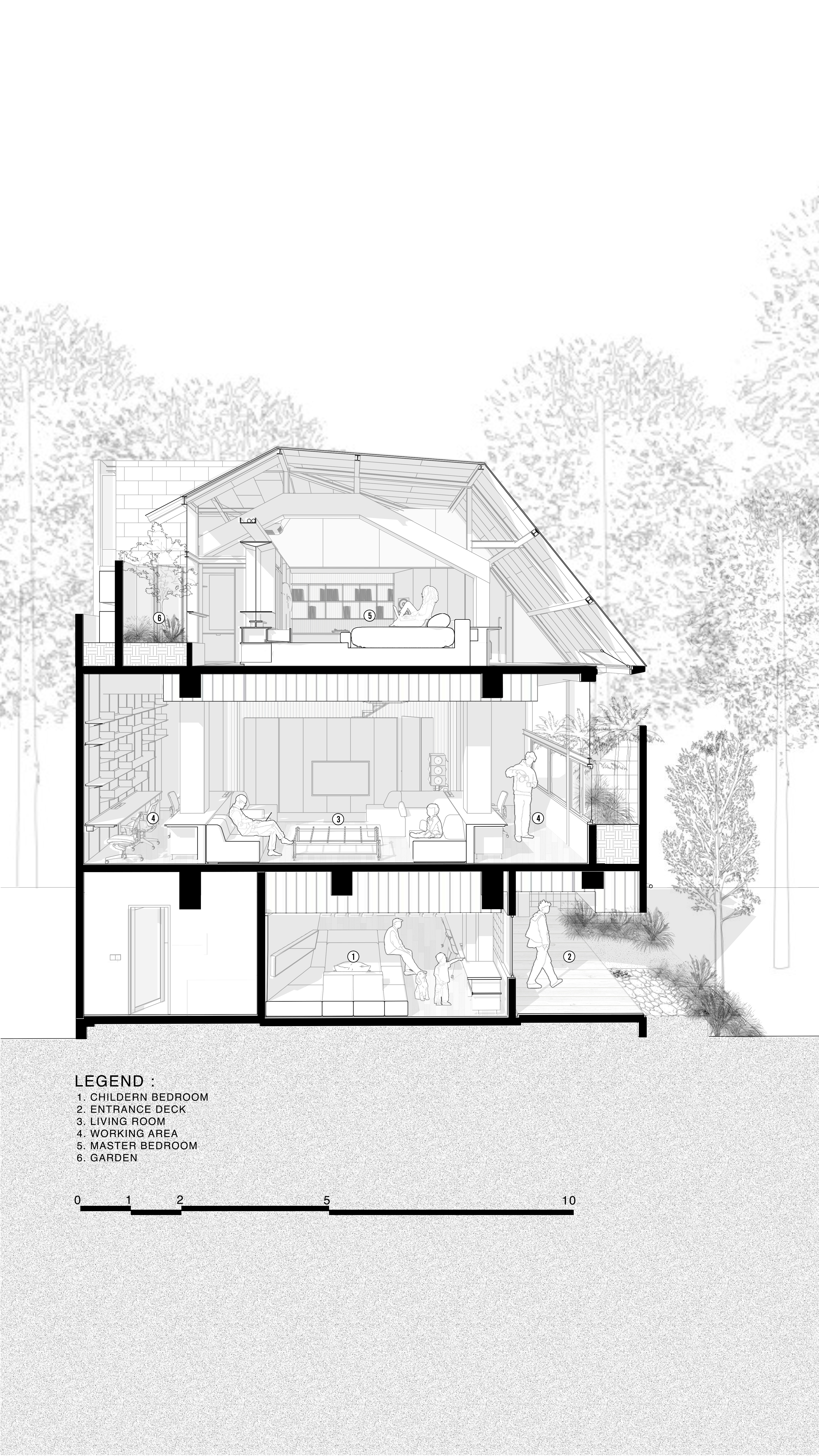 이 프로젝트는 정원 위에 떠 있는 네 개의 매스가 모두 안쪽을 향해 열려있는 리노베이션 주택으로, 다락과 지붕의 구조가 집의 입면과 정체성을 구성한다. 건축가는 기존 구조를 최대한 존중하며, 지상층을 개방형 평면으로 재구성해 벽과 복도를 제거하고 공간의 흐름을 자연스럽게 만들었다.