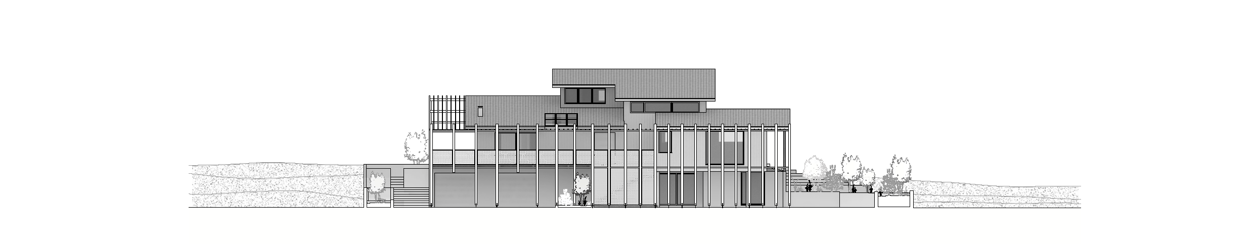 핵심 전략은 집의 크기를 적극적으로 활용하면서, 래미네이트 더글러스 목재로 만든 대형 차양 구조물을 도입하는 것이었다. 이 수직 목재 루버는 집 전체의 다양한 매스를 하나의 선으로 통합하면서도, 여러 기능을 수행한다.