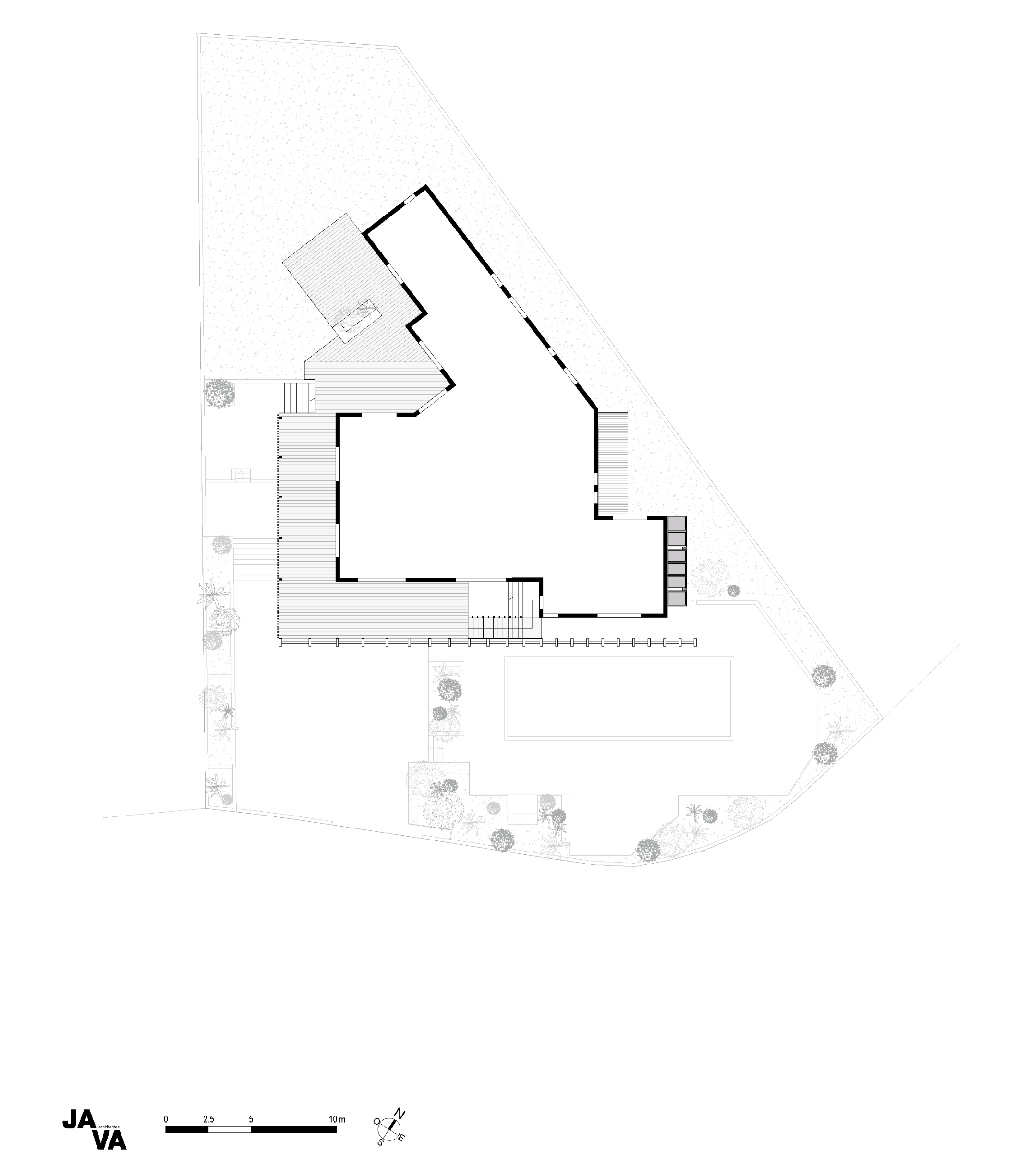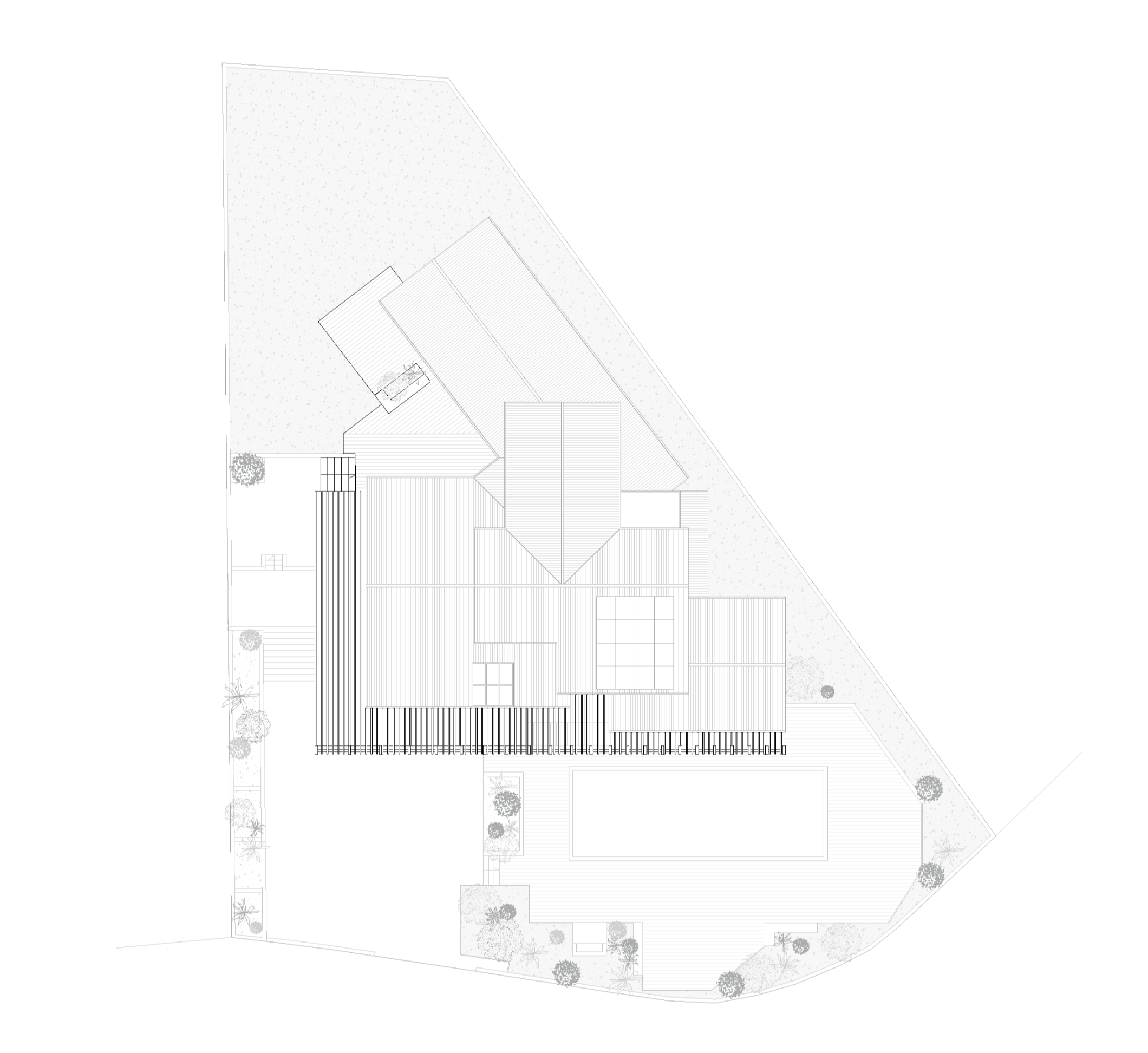 여름철에는 햇빛을 차단하는 그늘막 역할을 하며, 1층에는 야외 샤워실, 사우나, 계단실을 감싸고, 2층에는 외부 거실 공간을 지지하고 둘러싸는 구조로 작용한다. 동시에 이 구조는 인근 이웃과의 시선을 차단해 외부에 노출된 위치에서도 사적인 생활을 가능하게 한다. 이 프로젝트는 공간의 확장이 아닌, 기존의 볼륨 안에서 의미와 기능을 정리하고 고유의 분위기를 회복시킨 사례다.